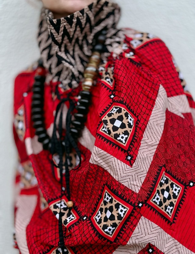 vintage shirring gather print skirt ・コットン 100% ・裏地つき ・ウエスト ゴム シャーリング ・ドロー ストリング入り ・レッド ベース 幾何学プリント ・フリー サイズ 着用モデル 168センチ ウエスト : 約31センチ〜 着丈 : 約67センチ 平置き実寸のため、若干の誤差はご了承ください。 ※着画は ケープ トップとして着用しています。 ベア トップ, ケープ トップ, オーバー スカート, もちろん スカートとして一枚でも◎ 何通りにも着こなせる スペイン ヴィンテージのスカートです。 シャーリング部分のジグザグと 幾何学柄のプリントがマッチしていて色目も良く、 今なら ロンTなどとレイヤードして 、トップスとしてもコーディネートをUPできる便利アイテムです。 目立つ難点なく、 ヴィンテージとしてとても良いコンディションです。 ウエスト ゴムもしっかりしています。 vintage, used商品をご理解のうえで、よろしくお願いいたします。