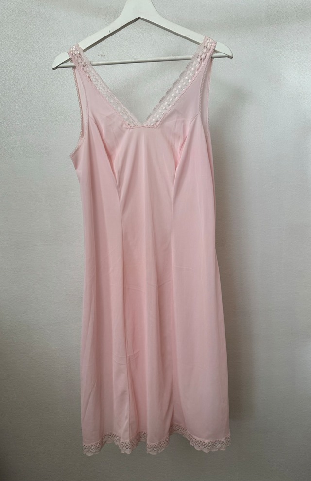 70s French vintage pink slip dress ・サイズ : ・ポリエステル 100% ・薄ピンク ・サイズ感 : M〜Lくらい (50N) ・胸元 /裾 レース ・France 身幅 : 約46センチ 着丈 : 脇から裾まで 約81センチ 平置き実寸になりますので、若干の誤差はご了承ください。 スリップ ドレスとしては珍しく、プリンセス ラインの切り替えが入った 立体的な仕立てです。 ヴィンテージ特有の、良い意味で 敢えての野暮ったさと言いますか、 ヴィンテージ レースがとても良い味です。(アーム ホールにもピコ レース付き) 目立つ難点なく、 ヴィンテージとしてとても良いコンディションです。 vintage , used商品をご理解のうえで、よろしくお願いいたします。