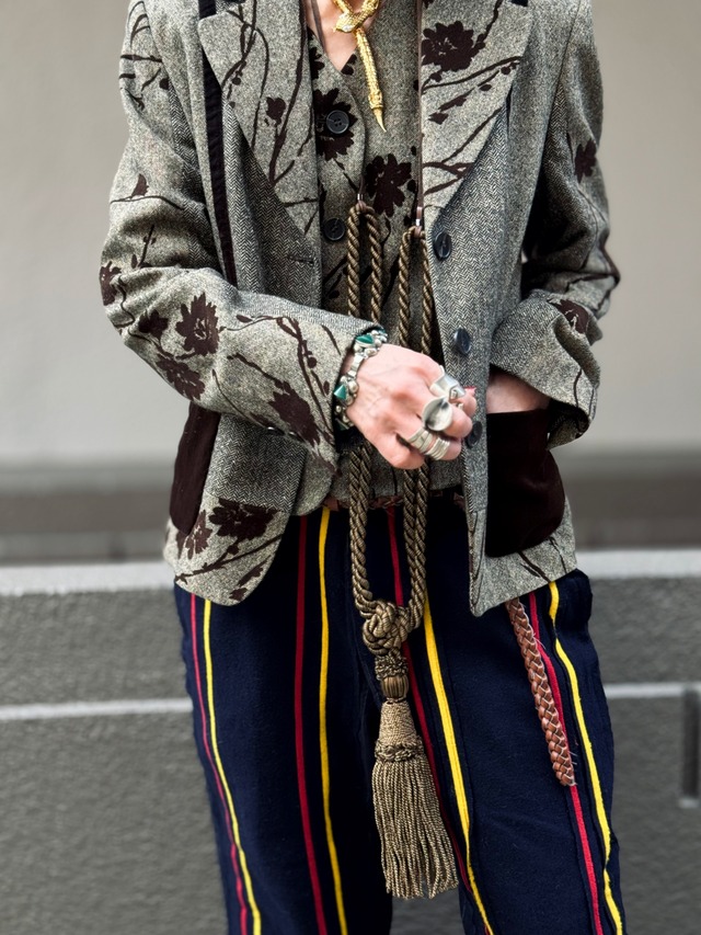 70s London vintage Tweed Flocky print 2piece ・サイズ表記なし : ゆったりめM〜Lくらい ・ミックス ツイード × フロッキー プリント × ベルベット ・ブラウン系 ・両サイド ポケット ・ポケット, ストライプ, 襟 : ベルベット ・ポリアクリル 42%, ウール 28%, ポリエステル 25%, シルク 5% ・裏地つき 着用モデル 168センチ ⚫︎ジャケット 身幅 : 約48センチ 肩幅 : 約41センチ 袖丈 : 約61センチ 着丈 : 約60センチ ⚫︎ベスト 身幅 : 約47センチ 肩幅 : 約37センチ 着丈 : 約55センチ 平置き実寸になりますので、若干の誤差はご了承ください。 ジャケットにはヘリンボーンとミックス ツイードの2種類のツイードが使われていて、その切り替えも独特な雰囲気を作っています。 デザイン・ディテール・色目・サイズ感までとなると 良い物に出会うことは滅多にない ジャケット+ベストの2ピース ベストは前面フロッキー プリントが施され、 それぞれ単品でも活躍するとても良いデザインです。 素材感は 真冬のツイードではなく、ロング シーズン着用可能なライトなツイードというところも嬉しいポイント デイリーユースは勿論 、オケージョン スタイルとしても 独自のスタイリングで着ていただけます。 目立つ難点なくヴィンテージとしてとても良いコンディションです。 vintage, used商品をご理解のうえで、よろしくお願いいたします。