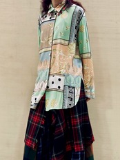 品のある淡いトーンのカラーリングですが、斬新な一枚プリントのシルク ブラウスです。