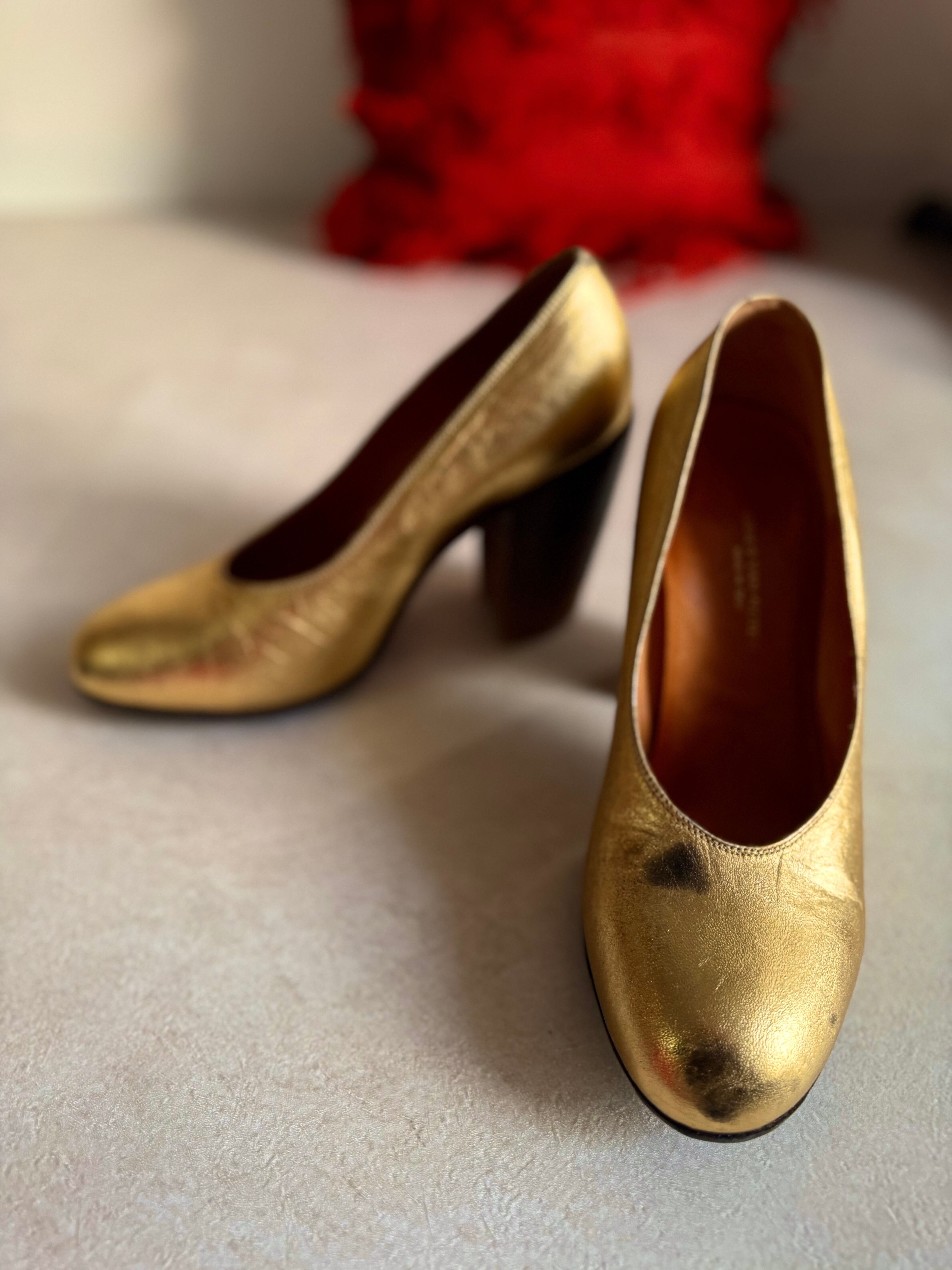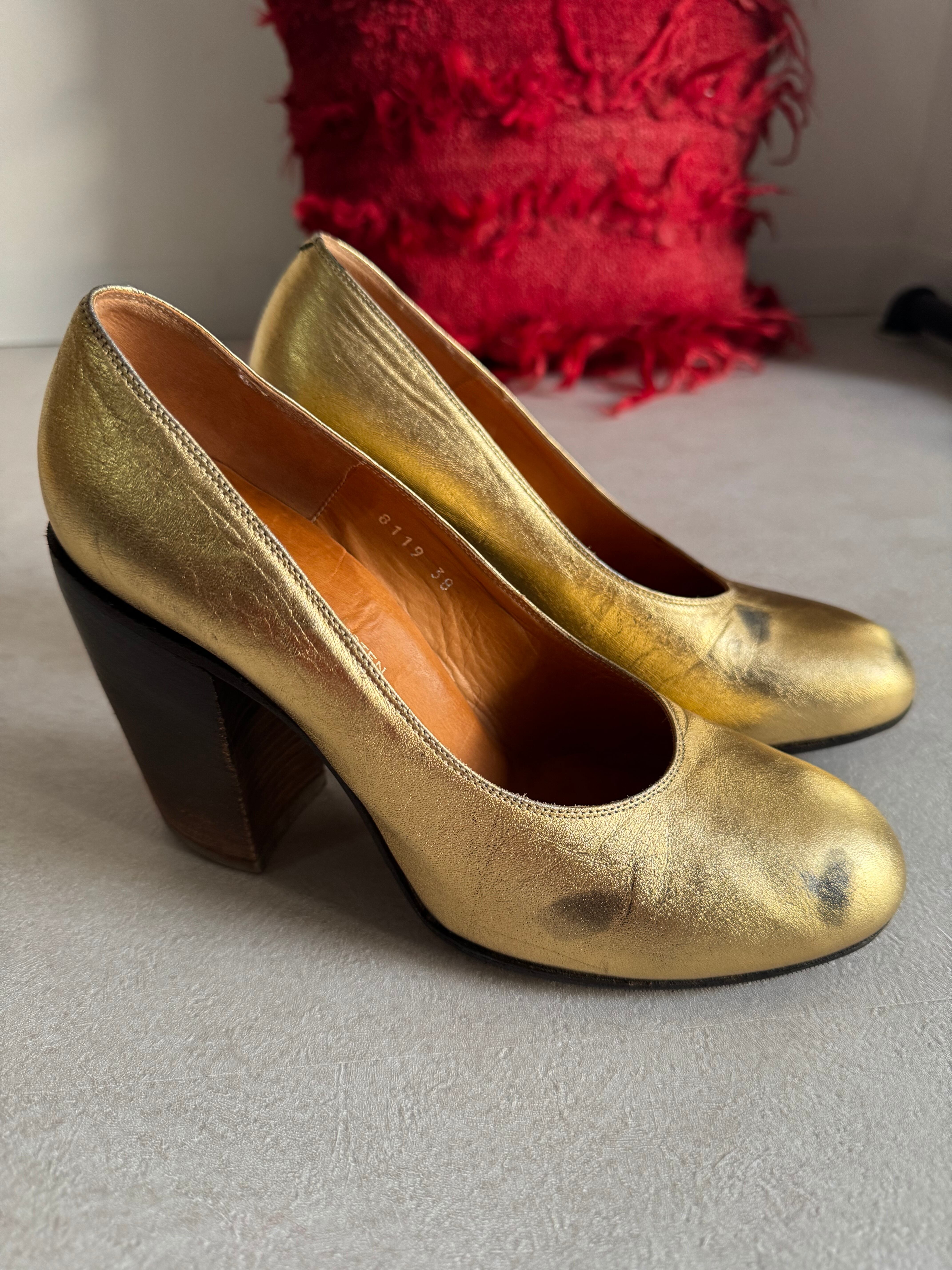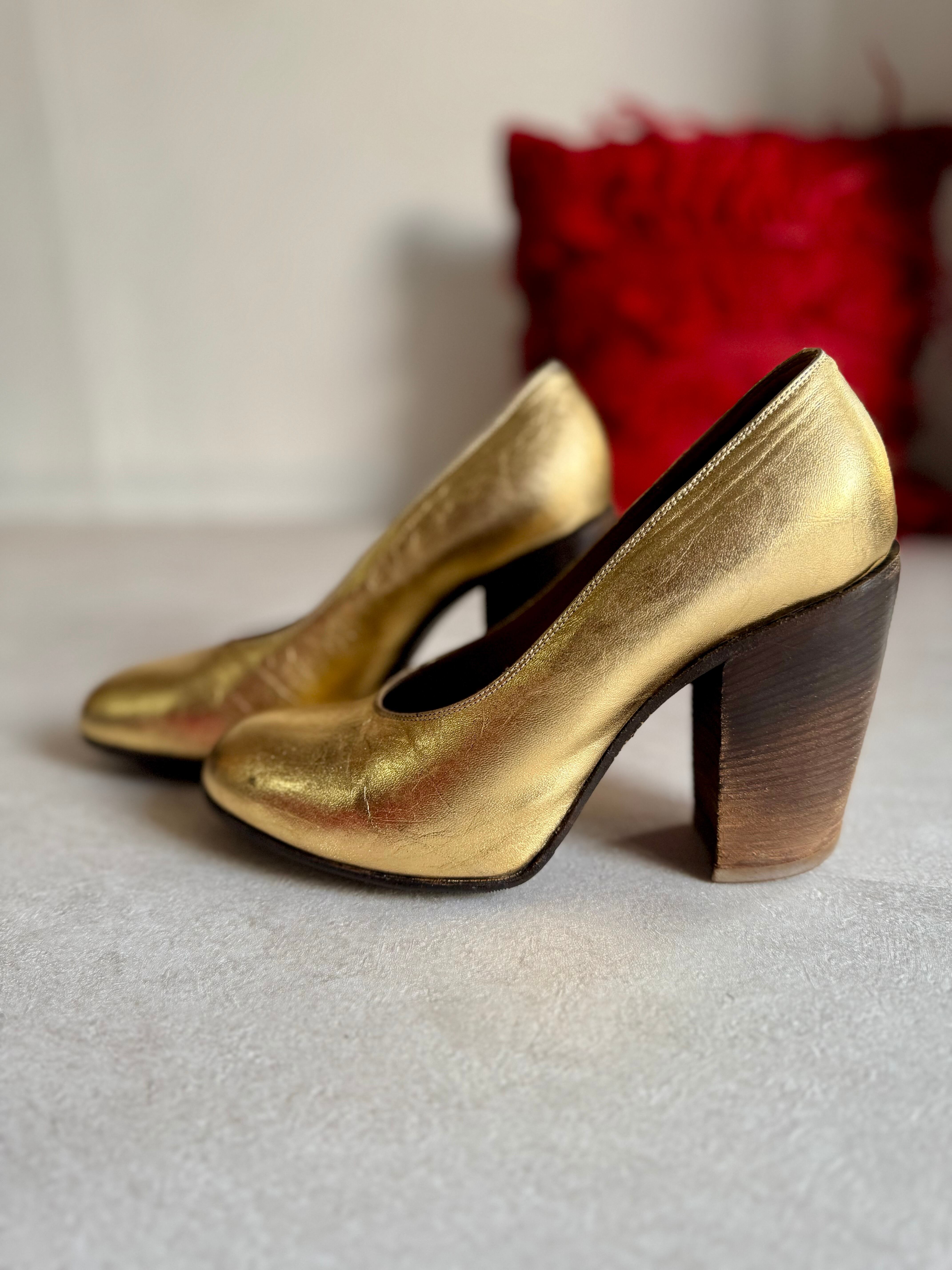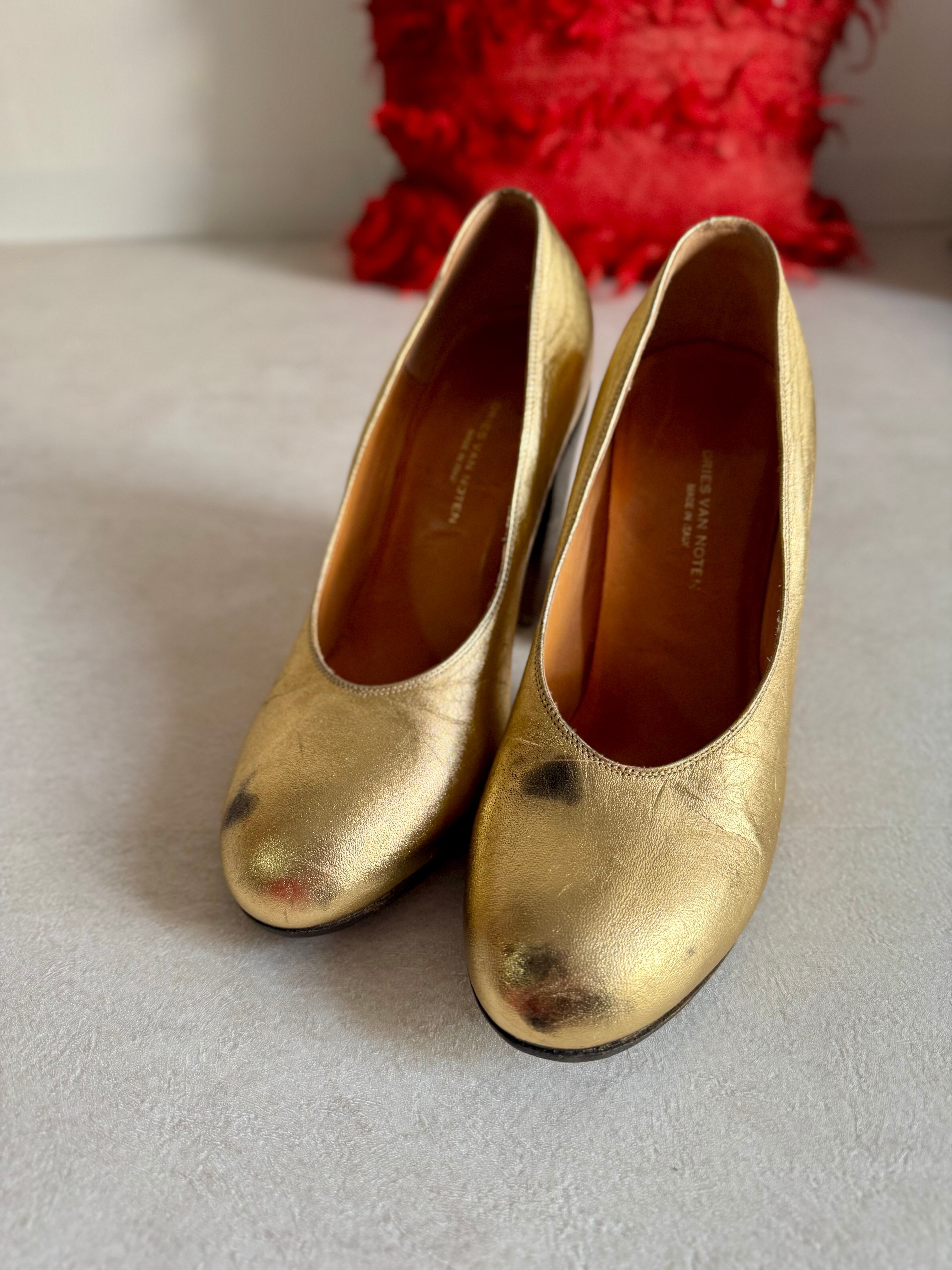 90s ドリス・ヴァン・ノッテン   ゴールド箔 チャンキー ヒール パンプス