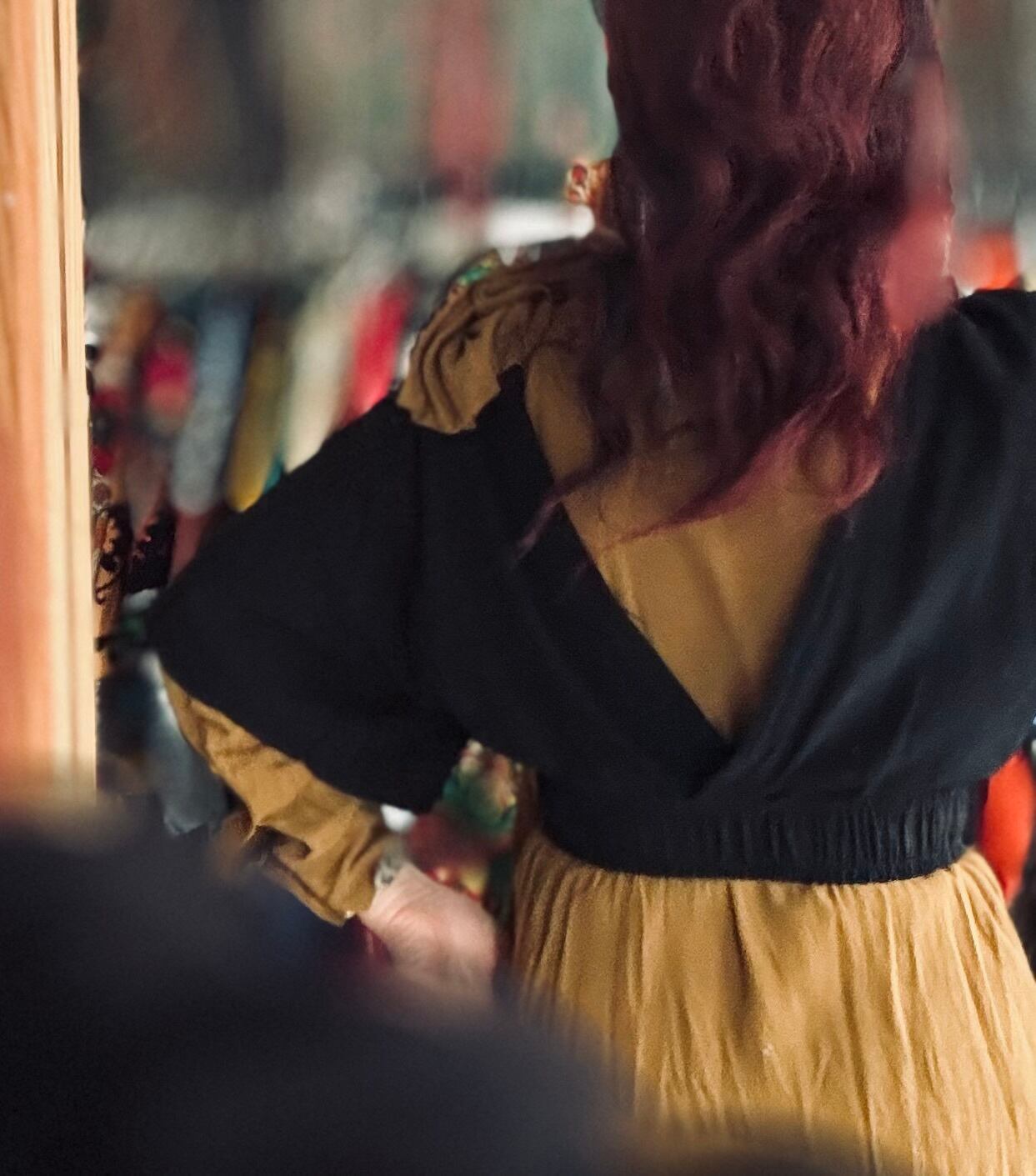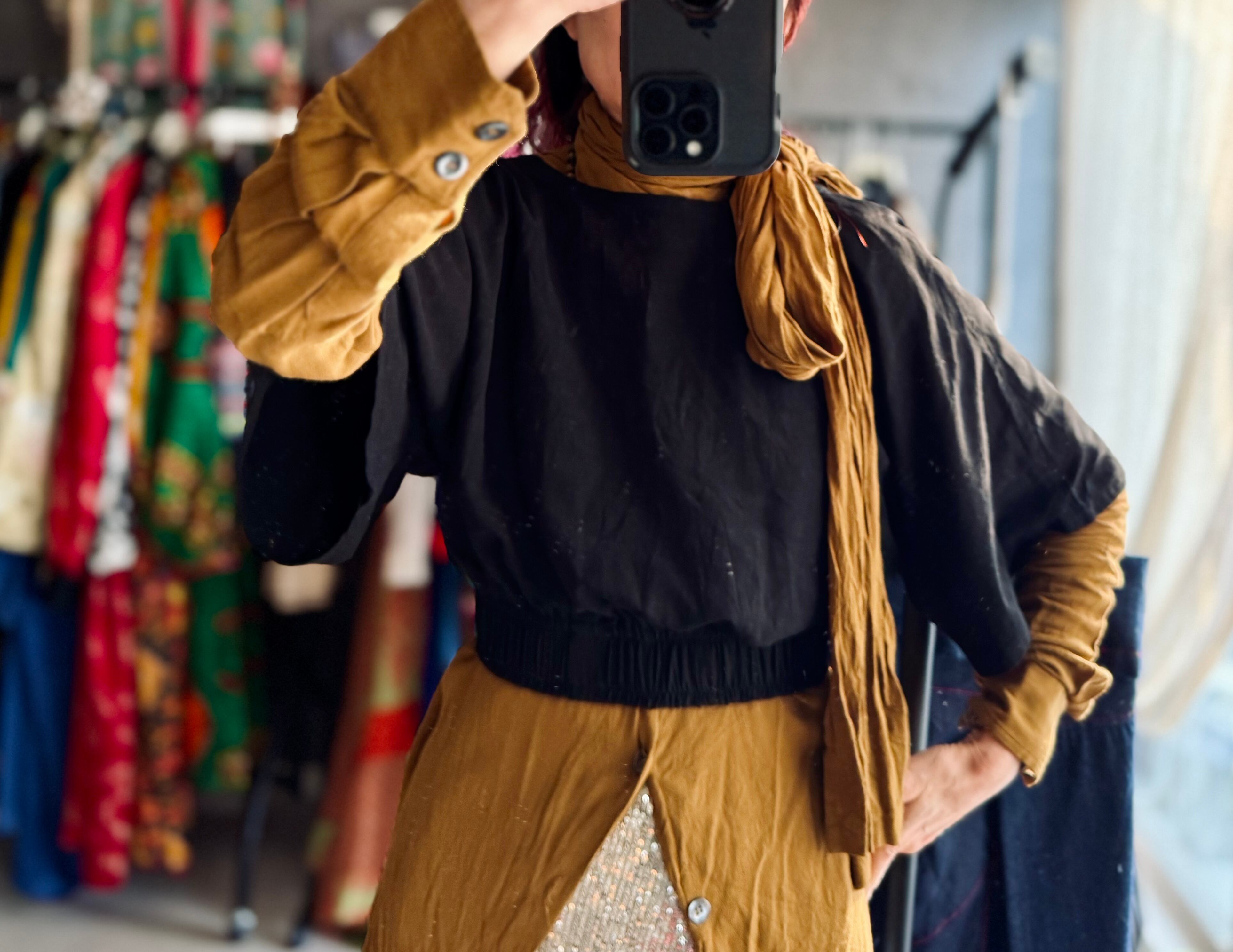 肩幅などなく、袖はゆったりとしたフレアのドルマン スリーブなので割とフリーサイズで着用可能ですが、