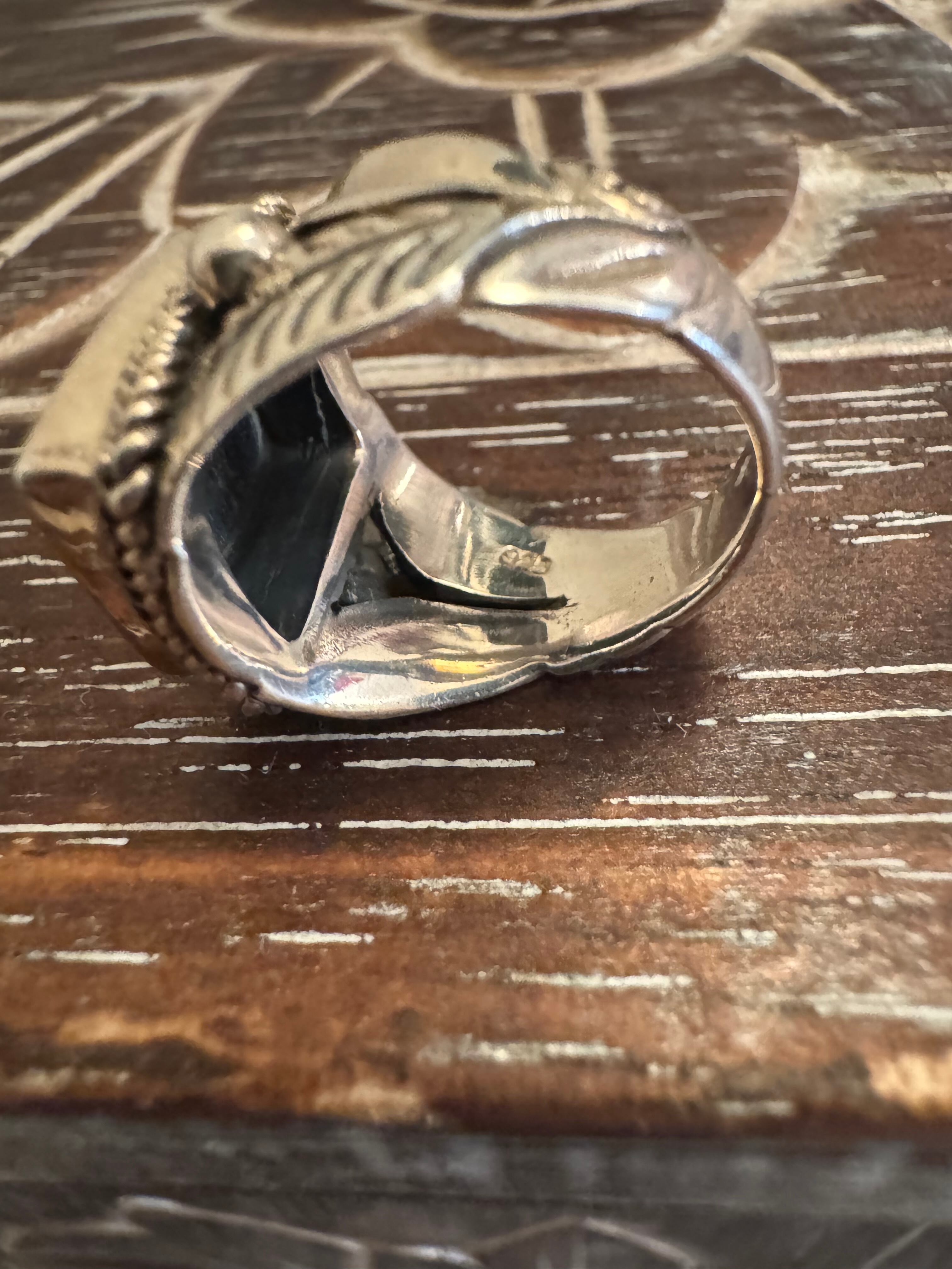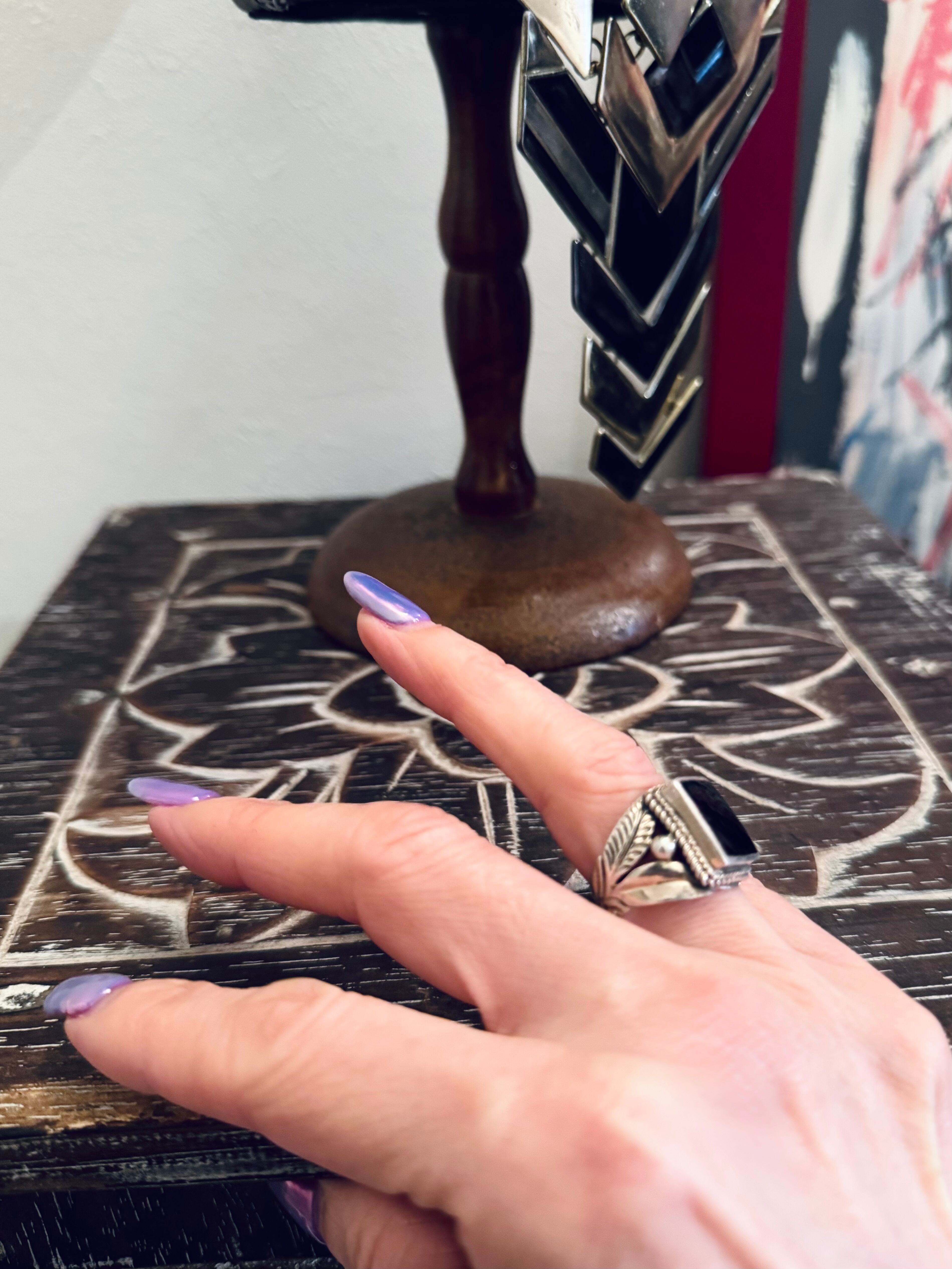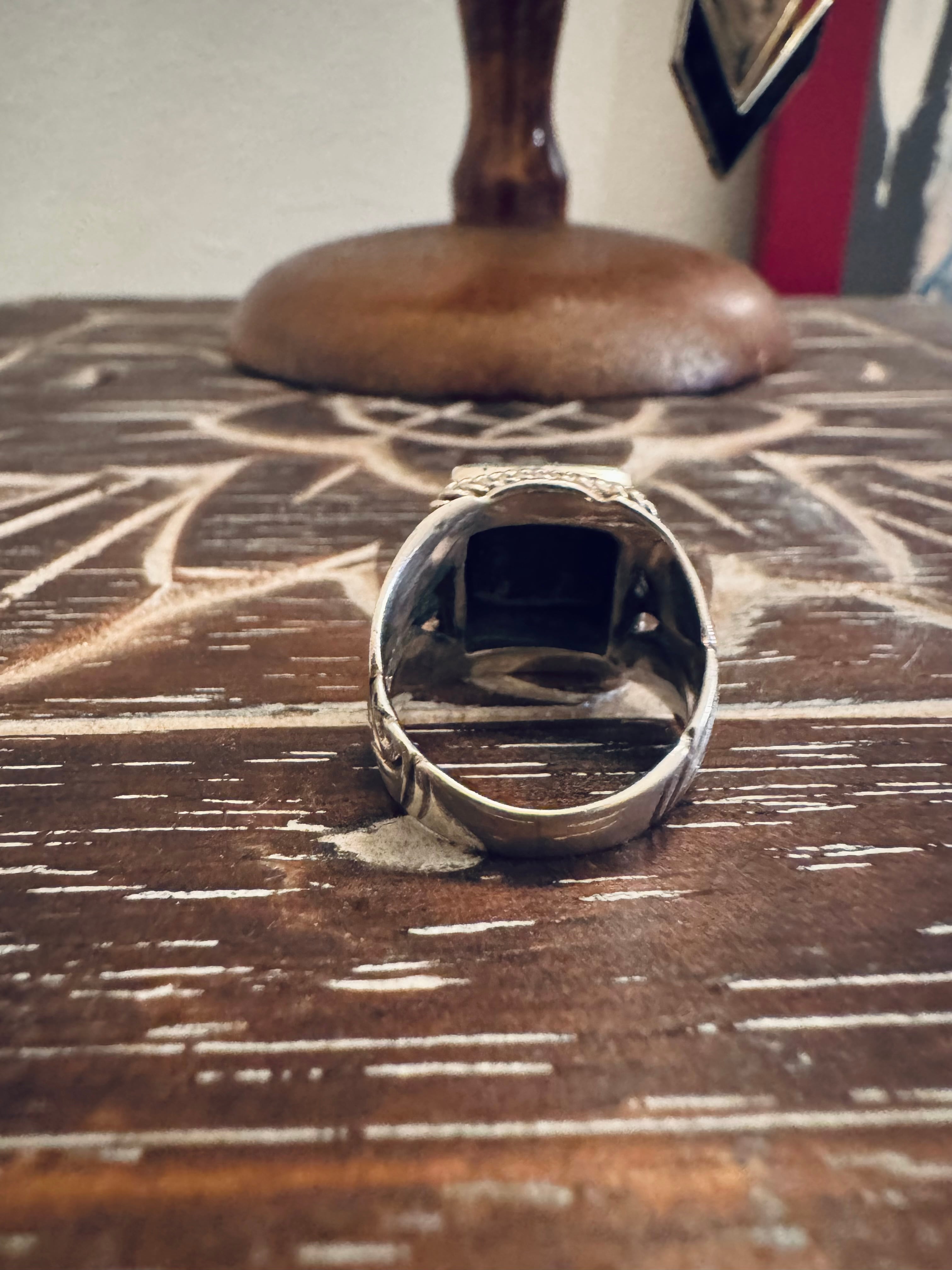 繊細な彫刻が施された925シルバーと、スクエア トップのオニキス リングです。