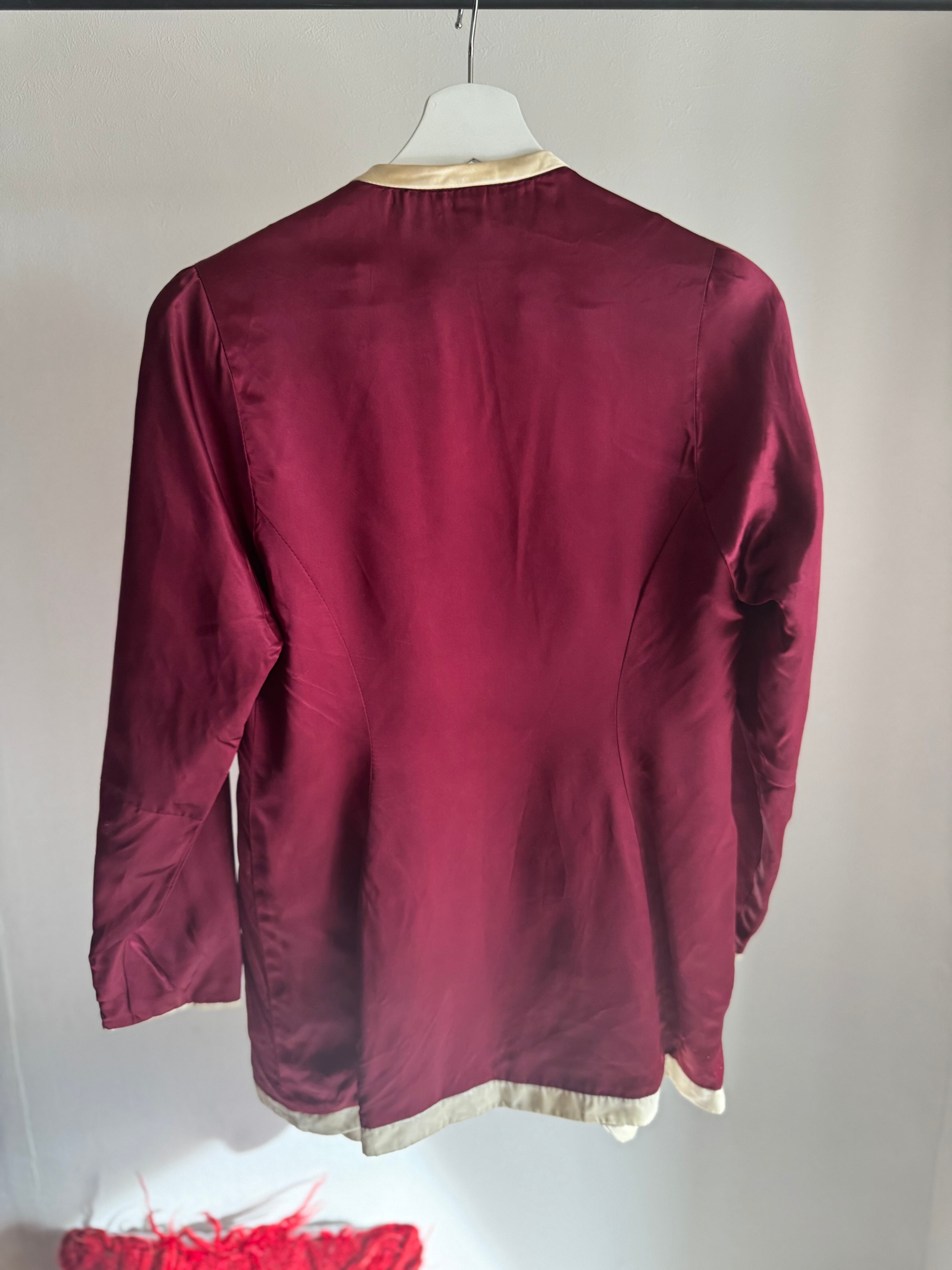 しっとりとした上質のサタン素材で、独特な雰囲気あるバイカラー ジャケットに仕立てられた一着。