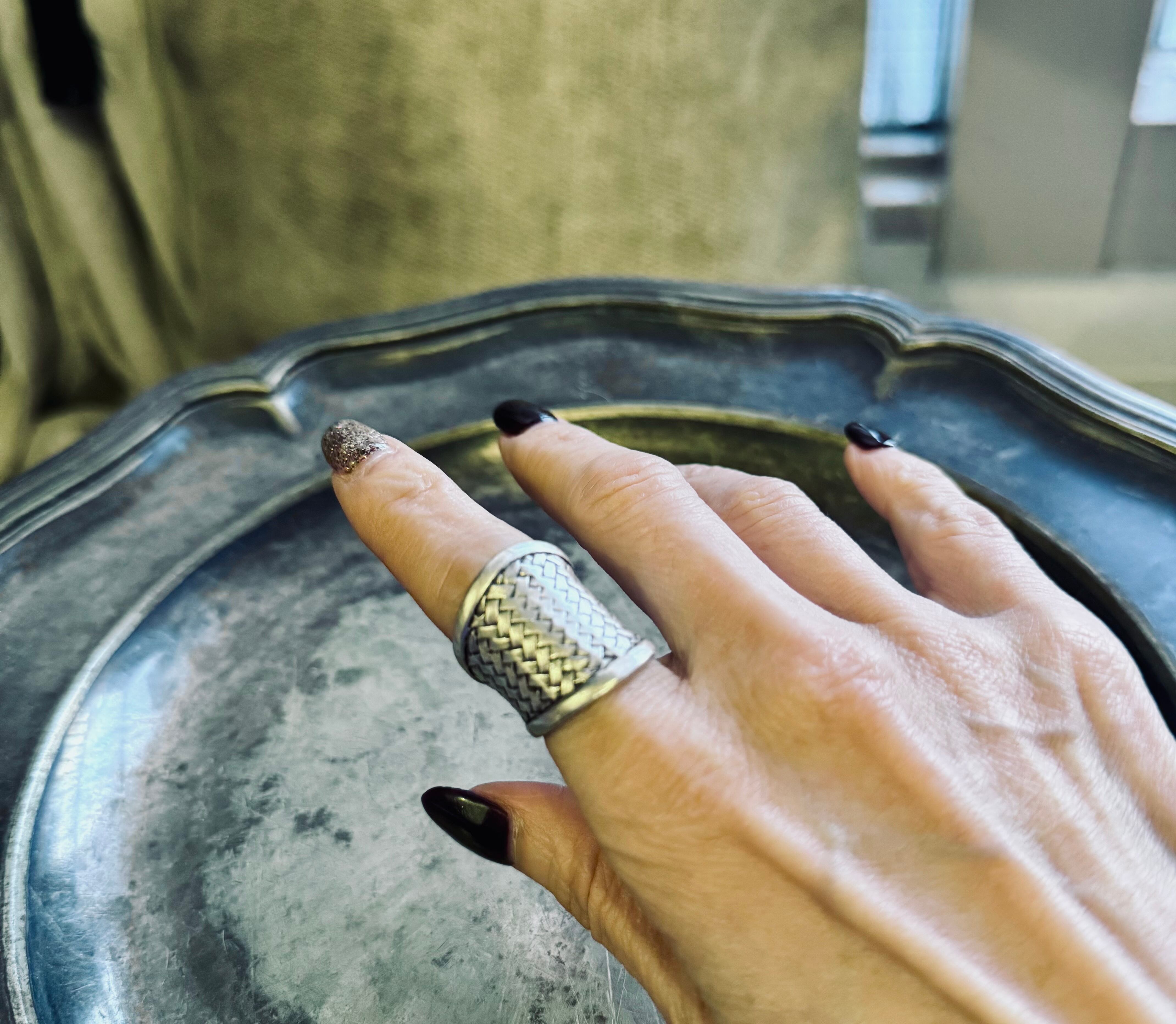 バスケット彫刻されたワイドな存在感あるシルバー カラー のリングです。