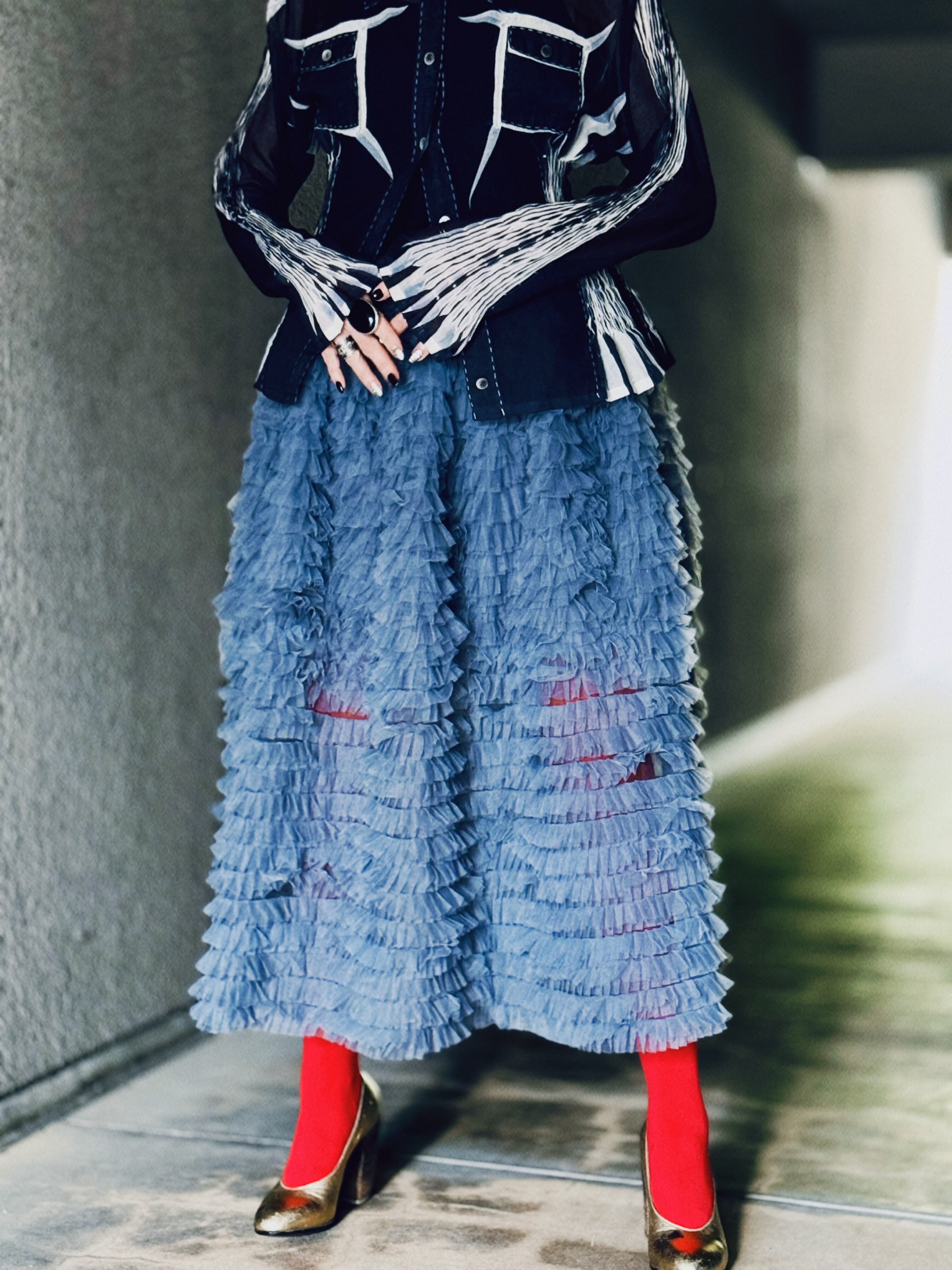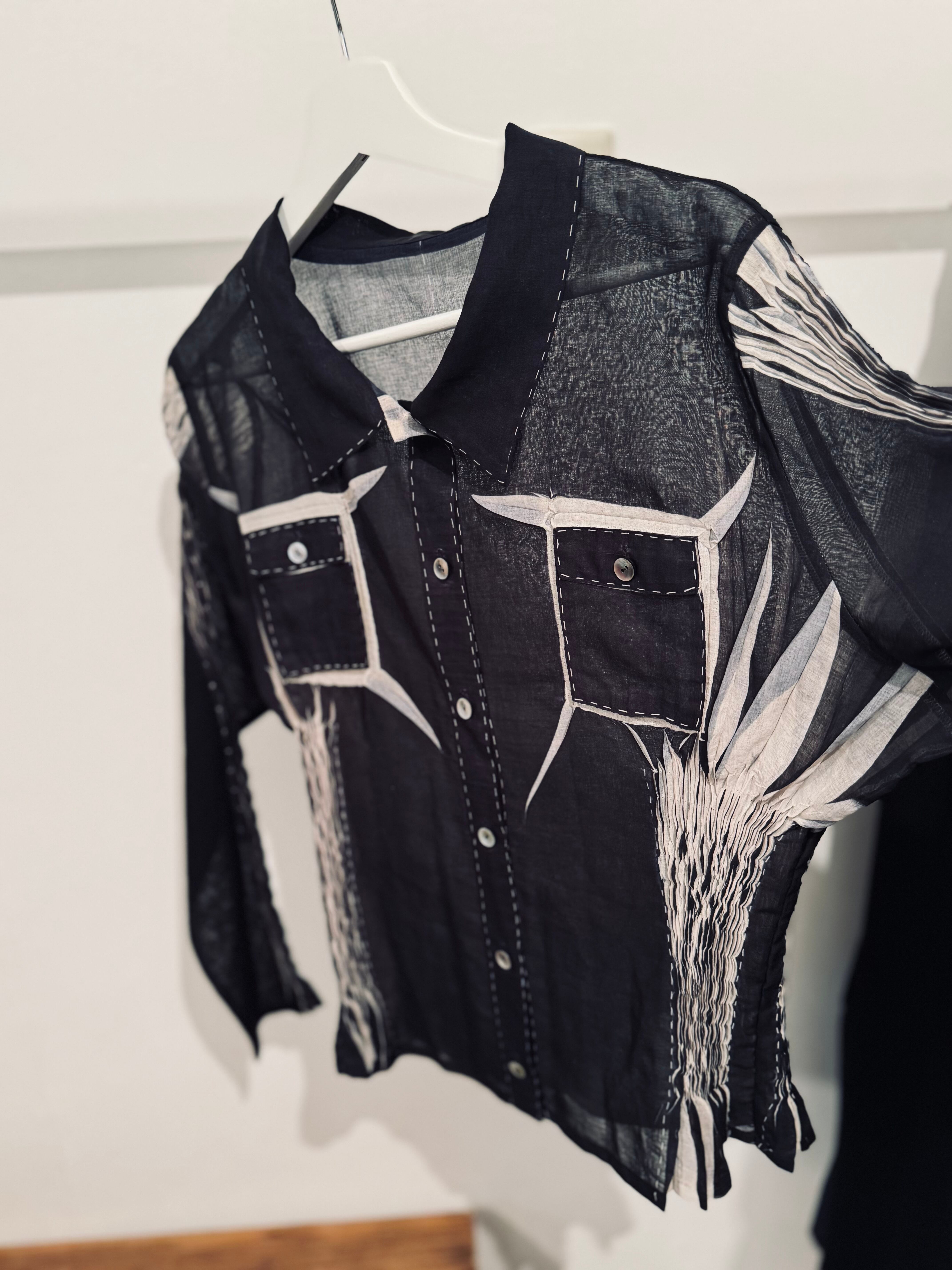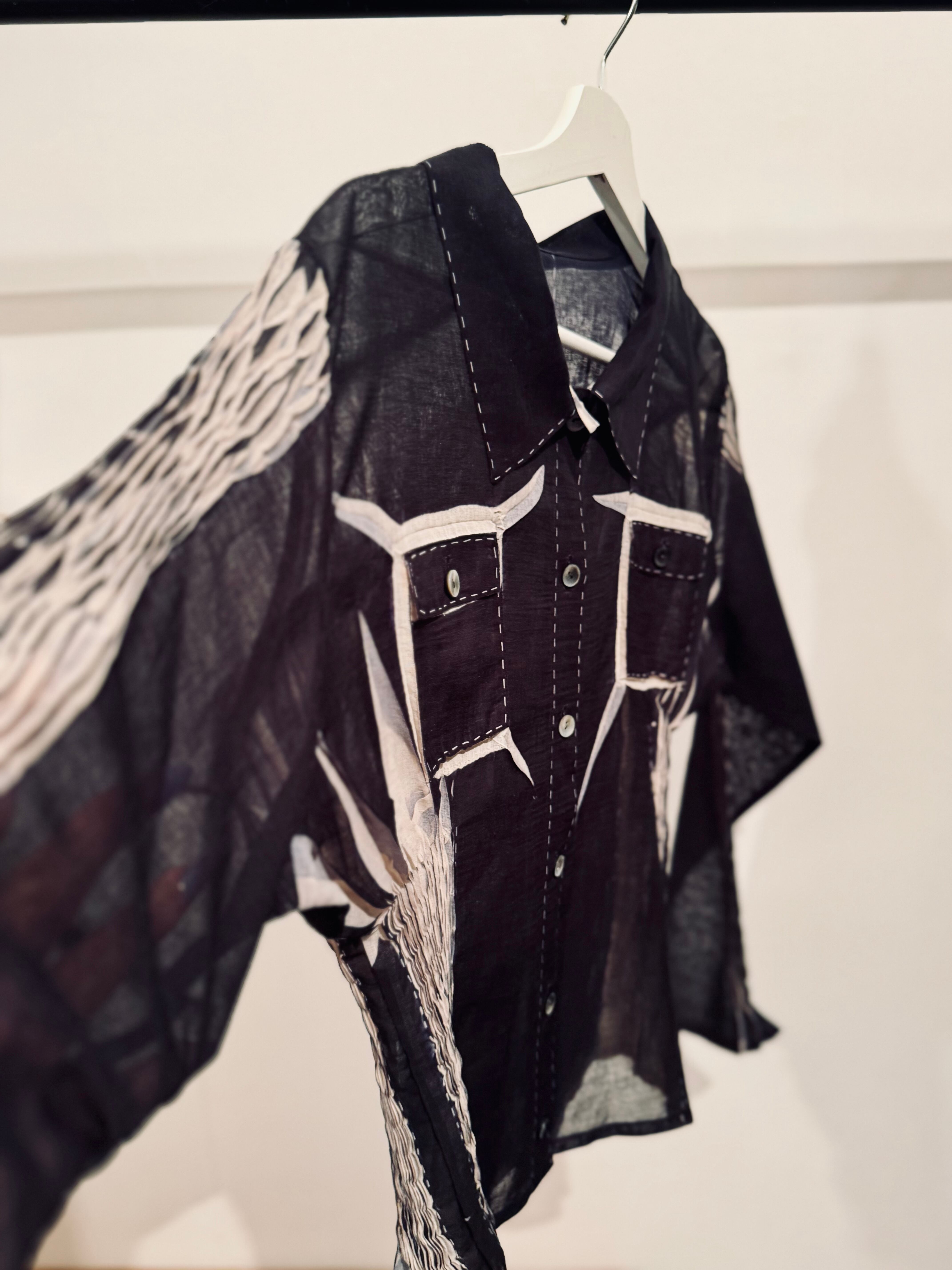 ハーフシアーな素材感、シルエット・ディテール全て、非常にデザイン性が高く、美しいブラウスです。