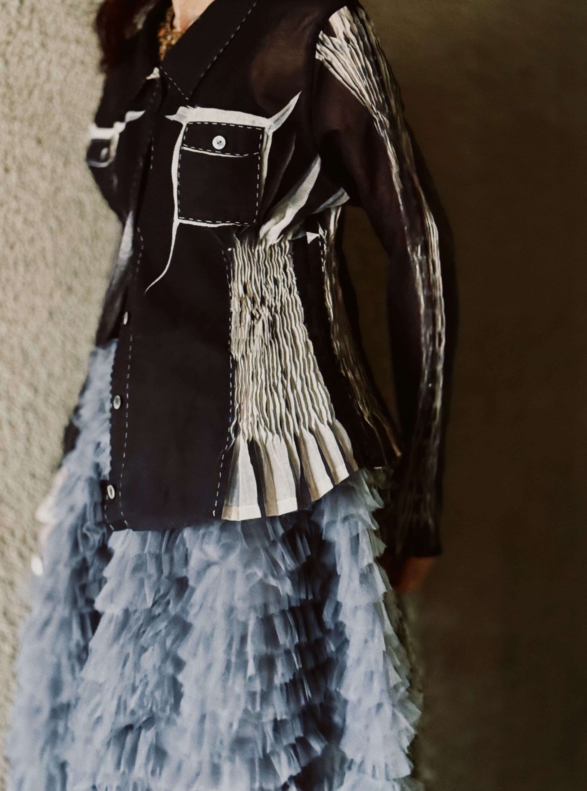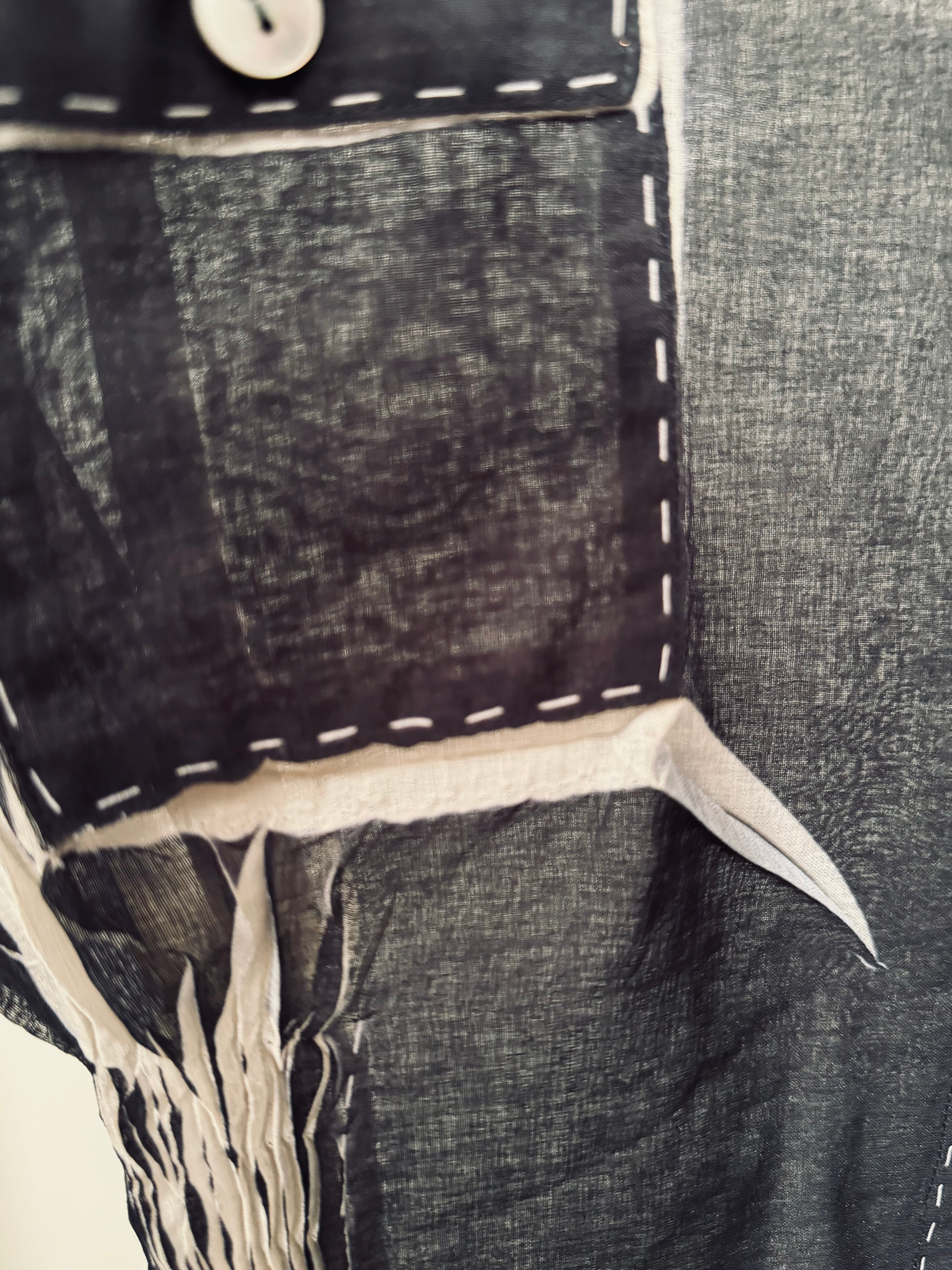 襟や前立て、ポケット、背中心に入っているステッチはプリントです。(トロンプ ルイユ=だまし絵)