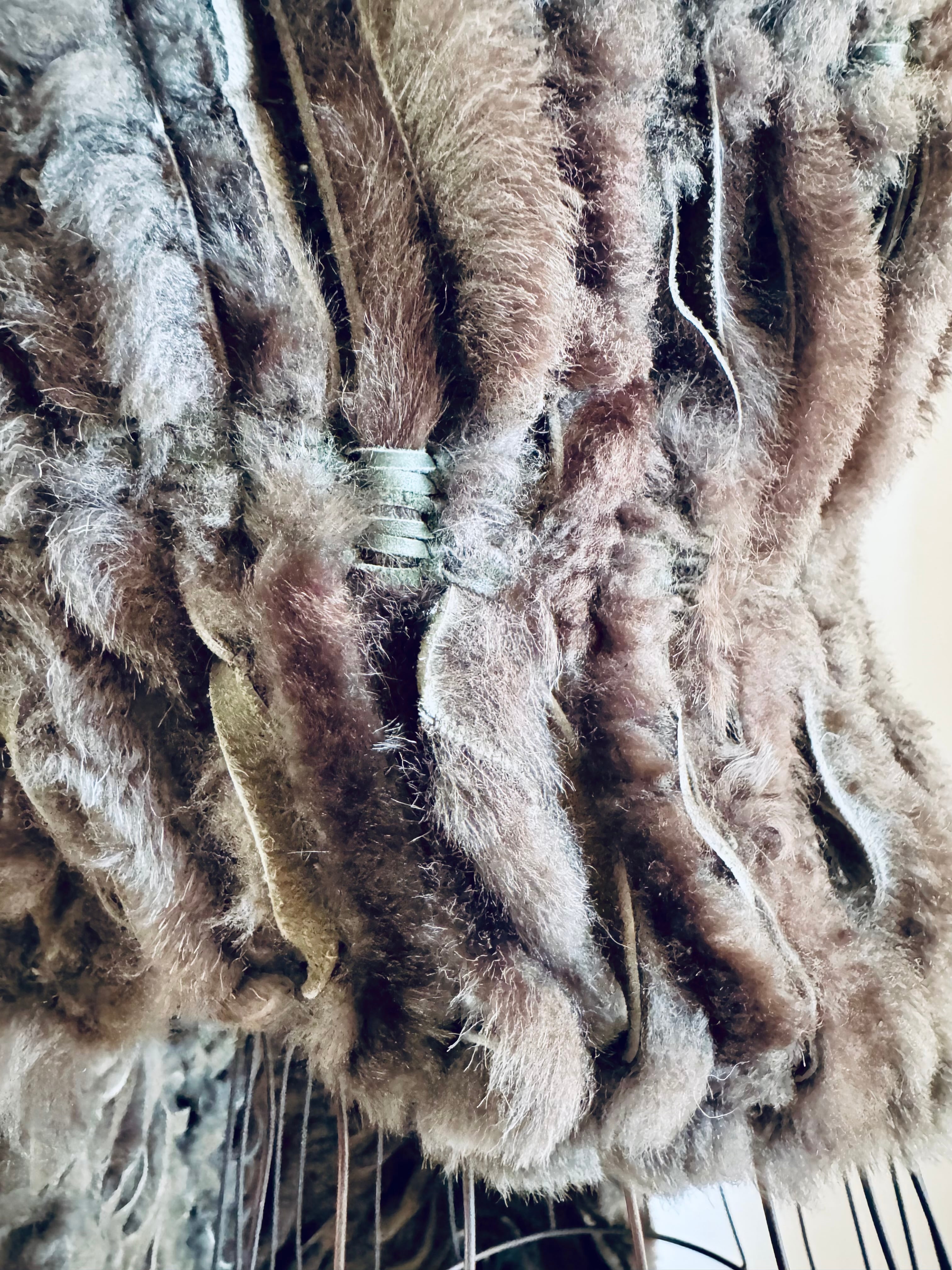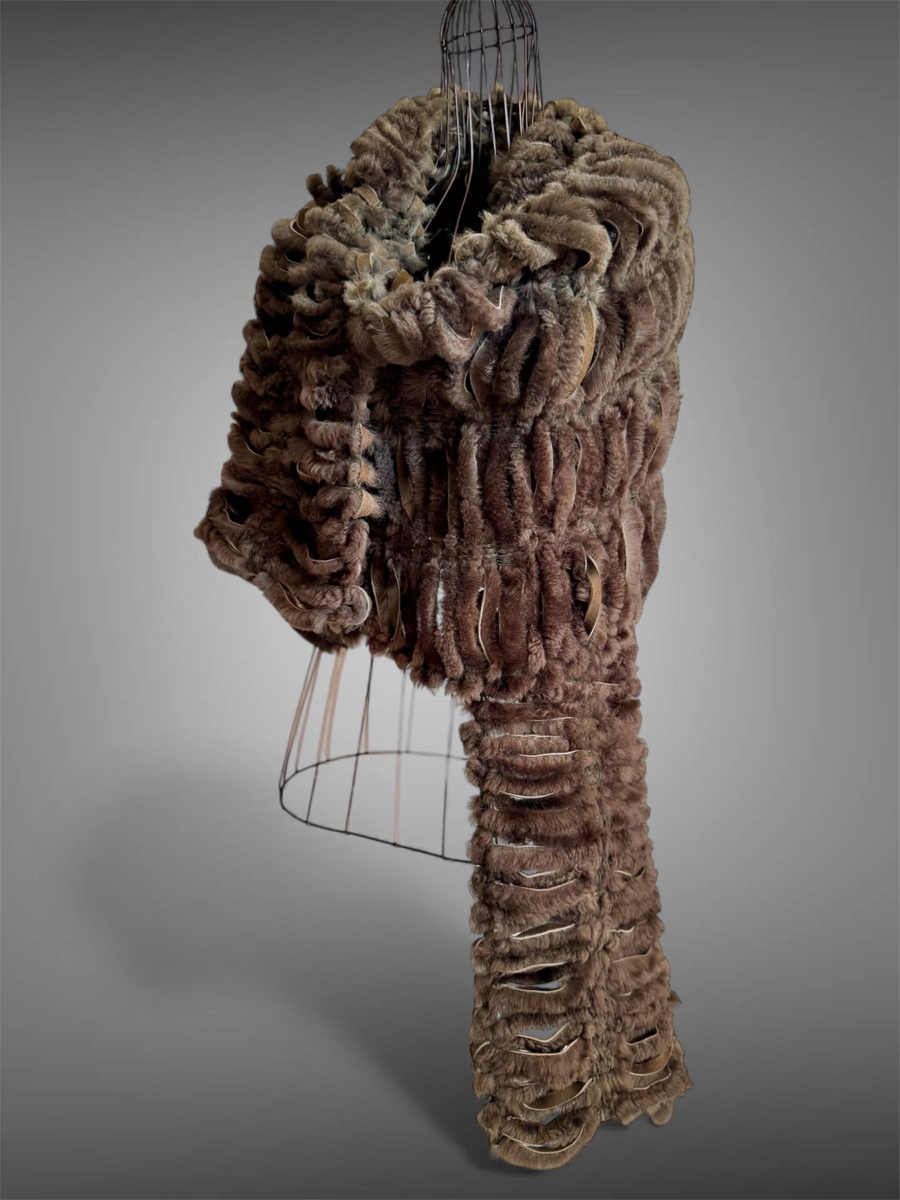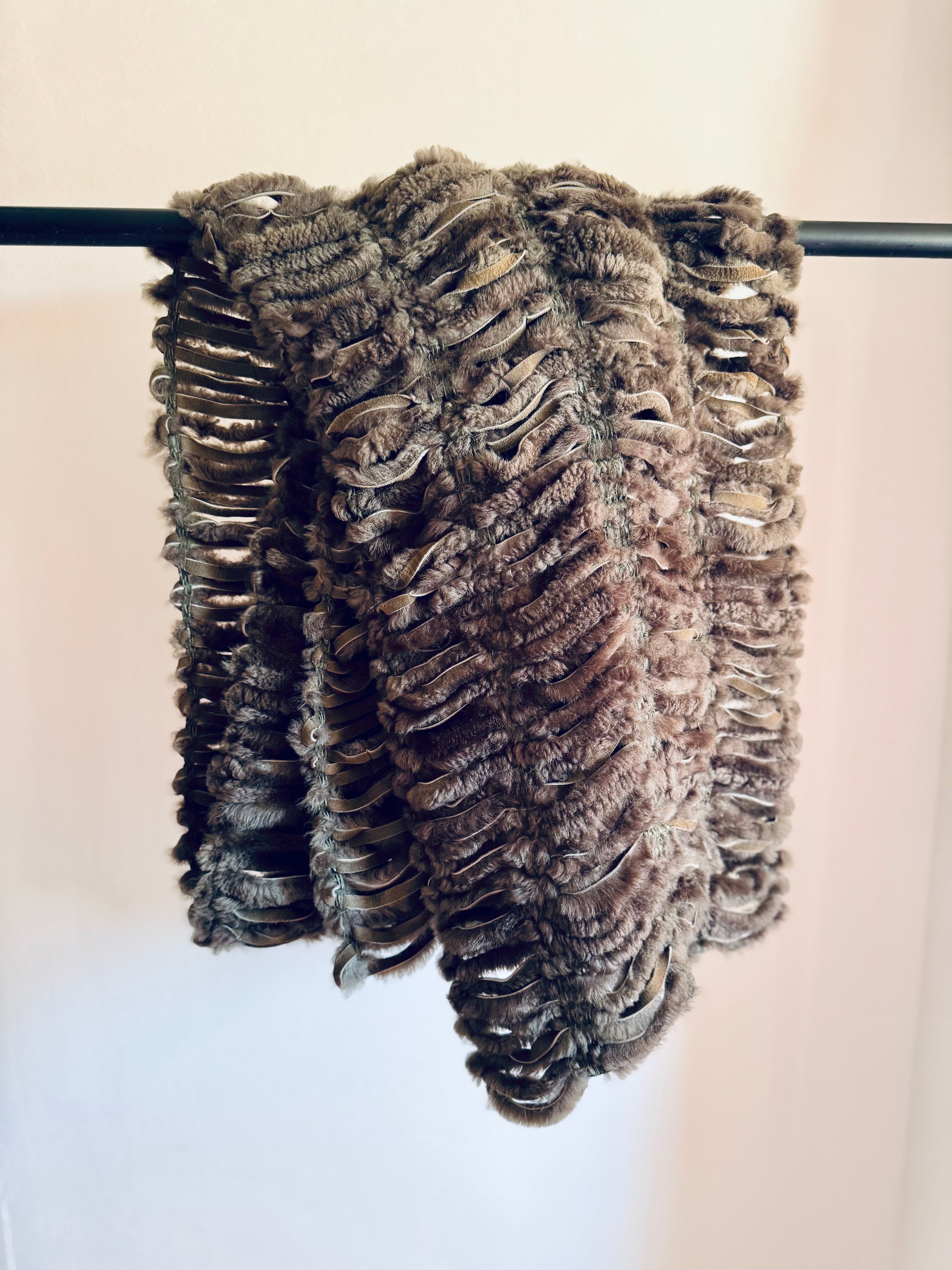 細いテープ状にしたファーを繋ぎ合わせた非常に手の込んだ仕立てで、ビッグ ストールですが軽さをだし、身体に馴染みやすく、巻きやすく仕立てられている機能性と、デザイン性高い表現が唯一無二。