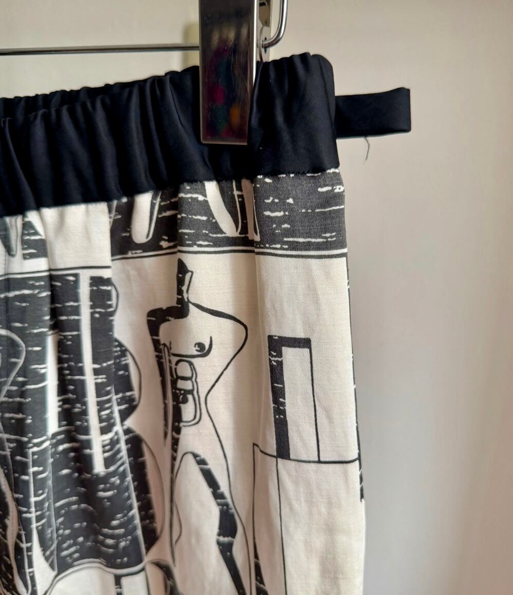 モノトーンの幾何学的な人物柄がキッチュな ワイドレッグ パンツです。