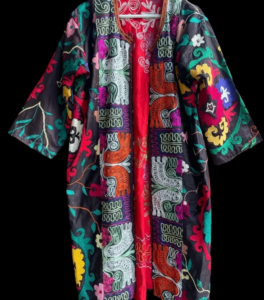 Uzbek vintage handmade embroidery SUZANI robe _ dark gray