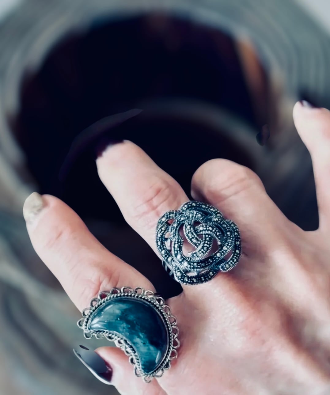 手元を綺麗に見せてくれて、個性的な存在感あるリングです。