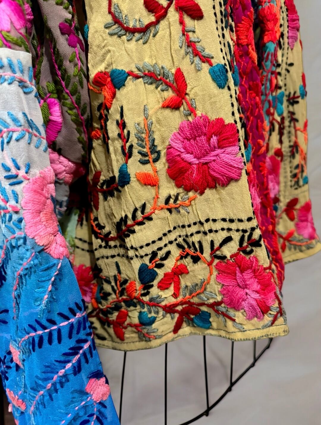 花や幾何学が刺繍された布はポイントに刺繍されることが多く、通常は長めのスカーフやショールの一部や、セレモニーのテーブル クロスや装飾などにも使われたものです。