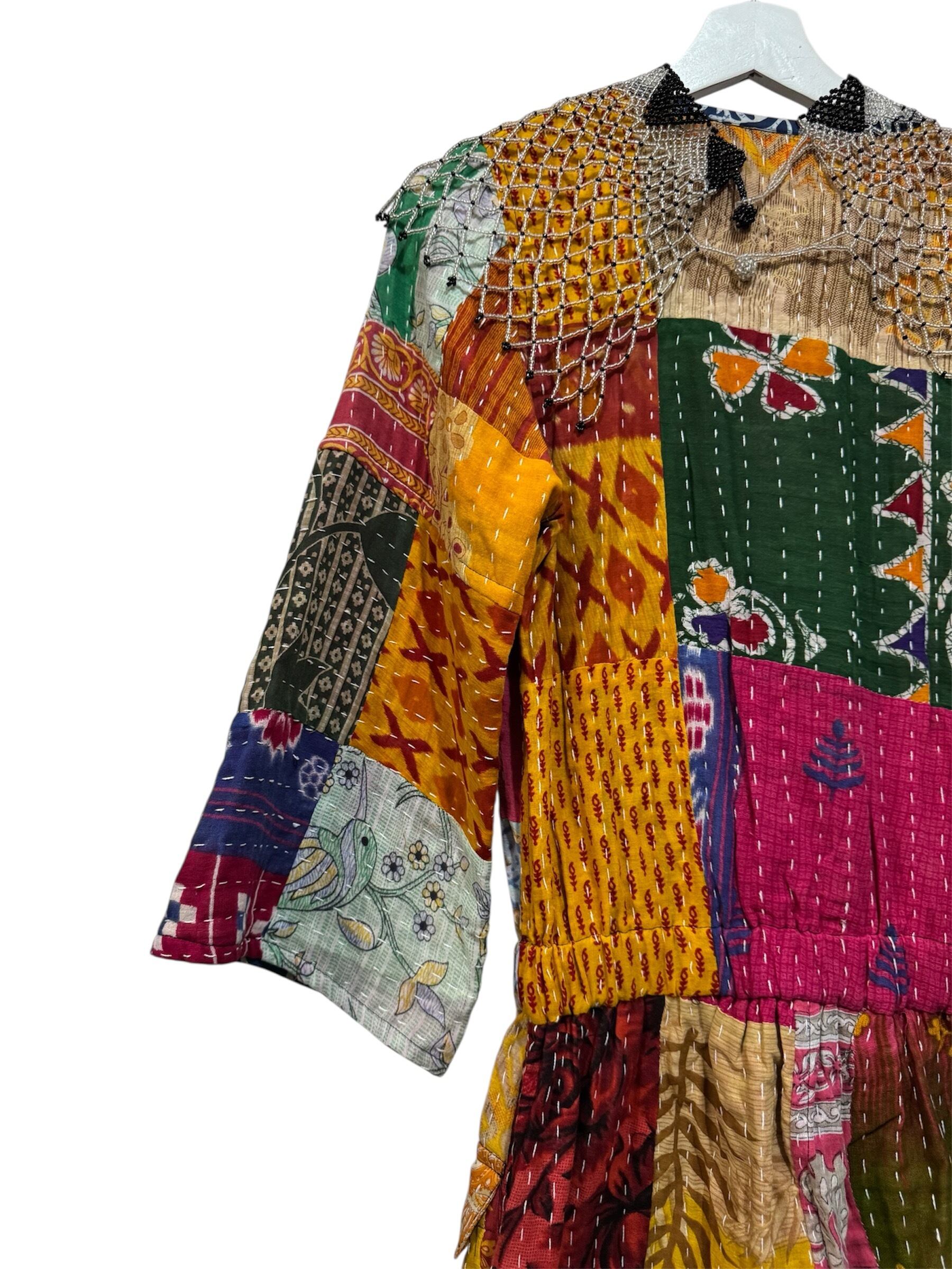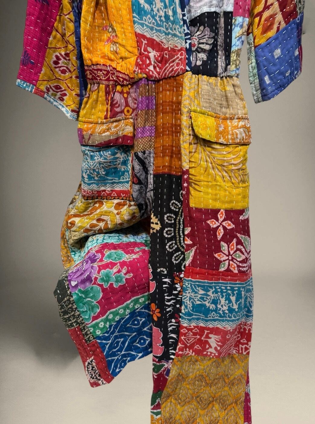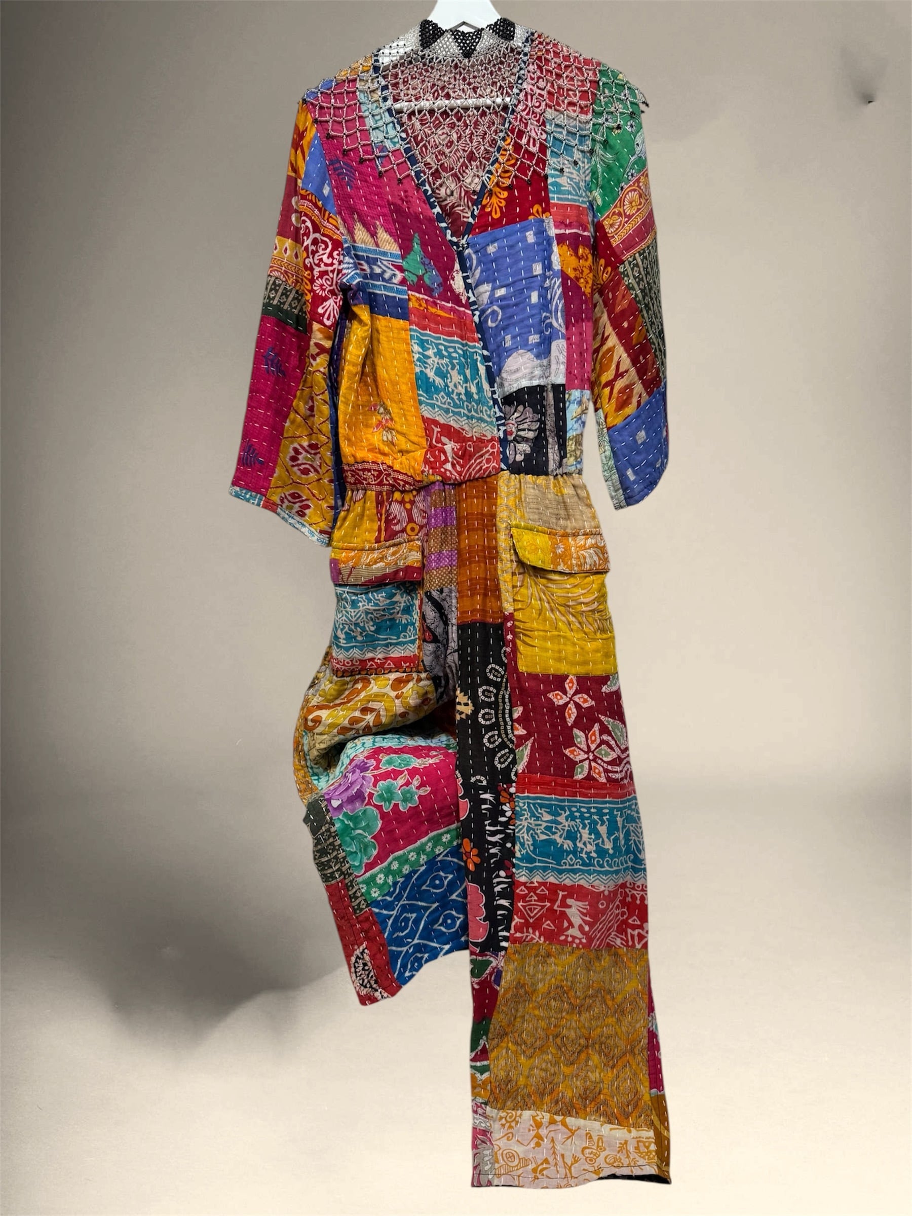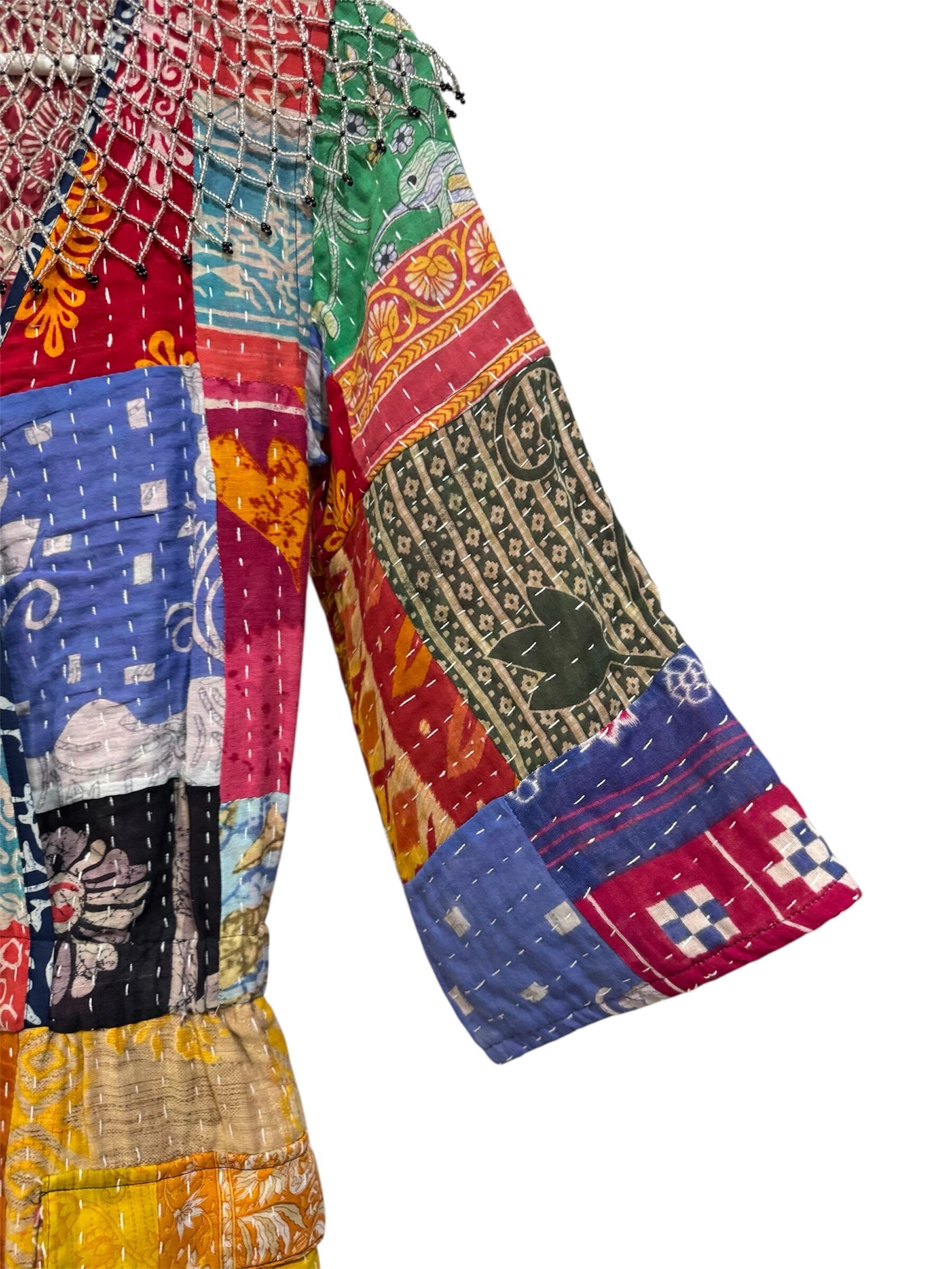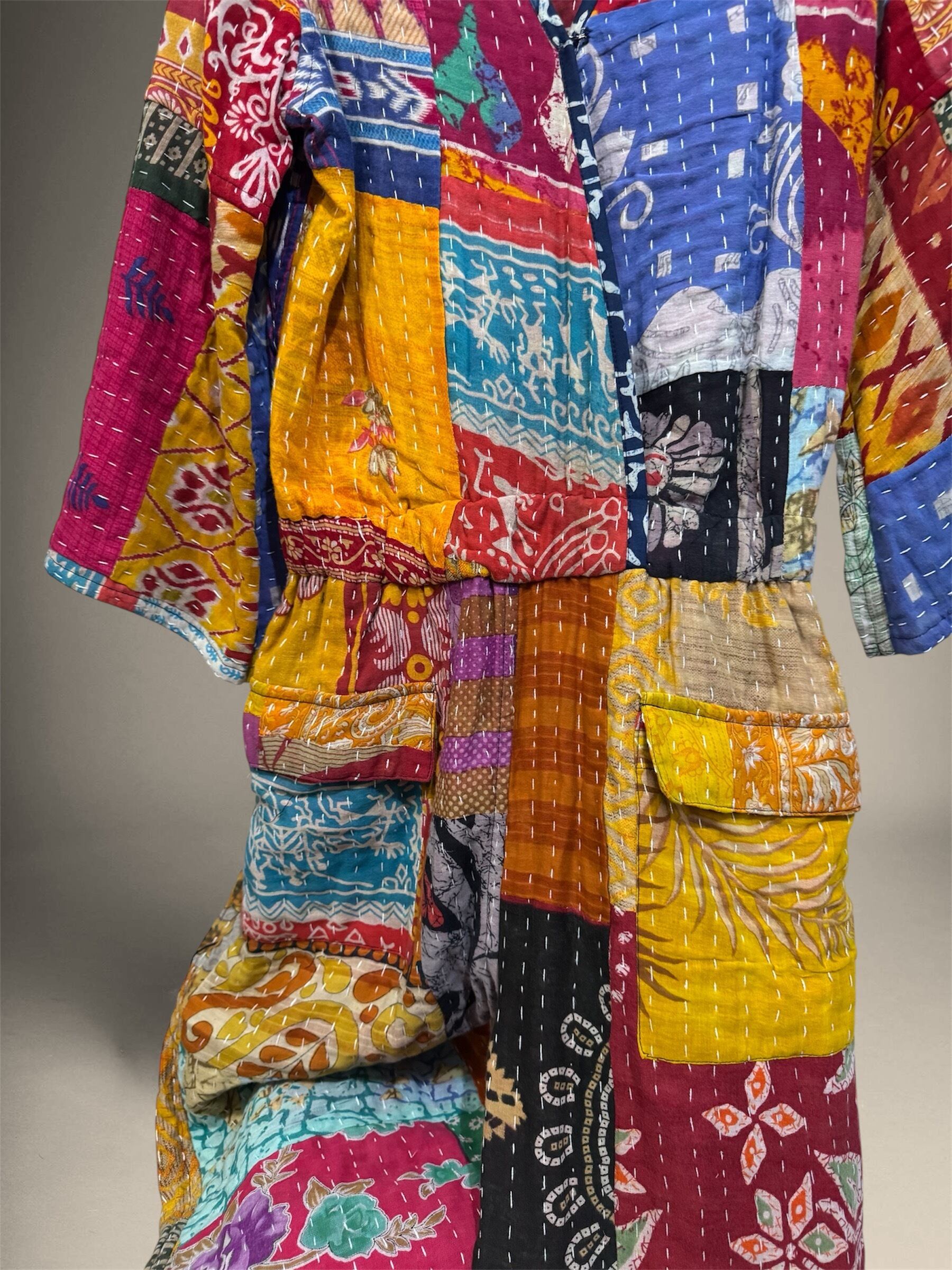 色とりどりのヴィンテージファブリックをパッチワーク状に組み合わせ、全面に施されたランニングステッチが温もりと奥行きを生み出しています。
