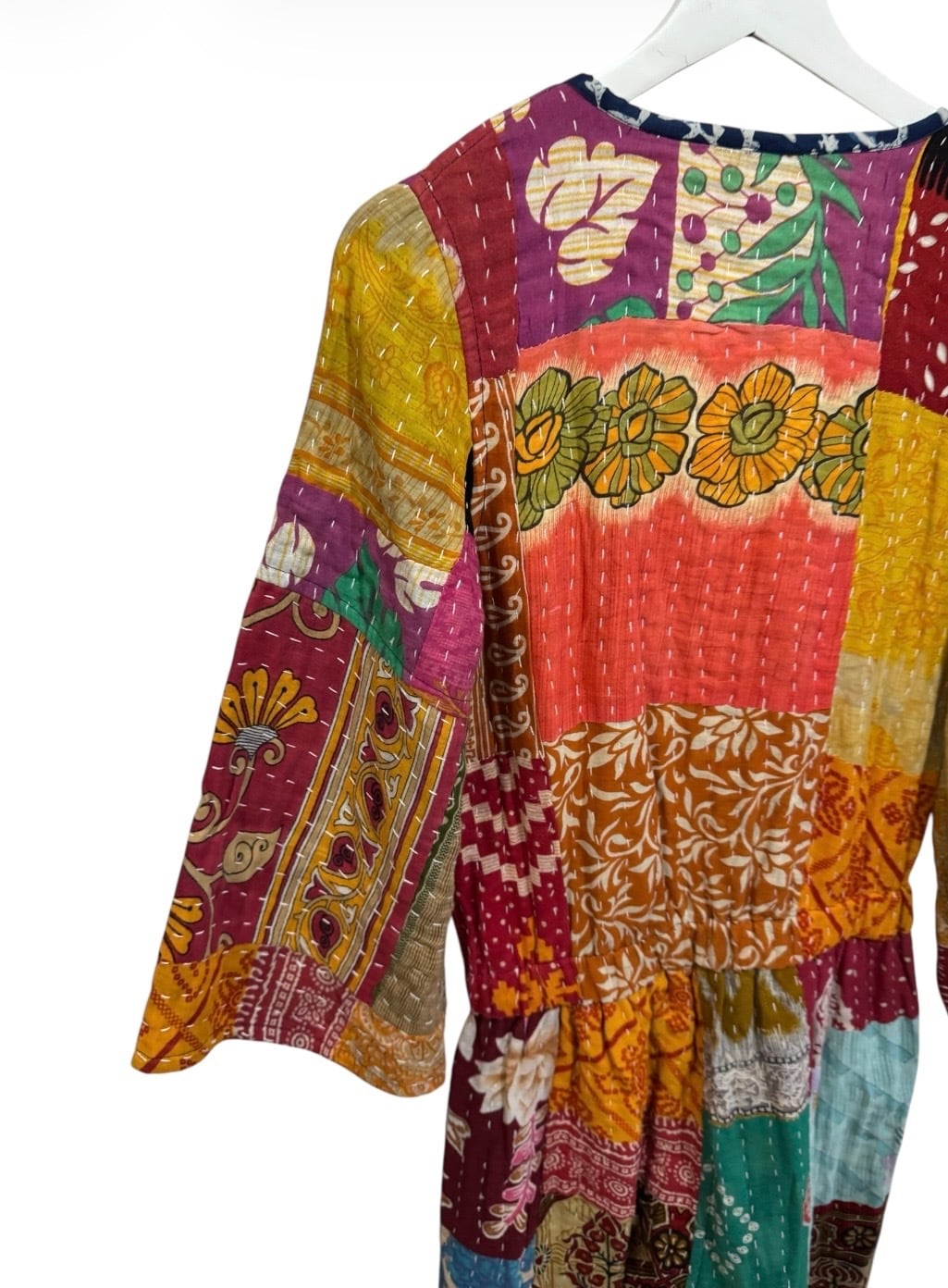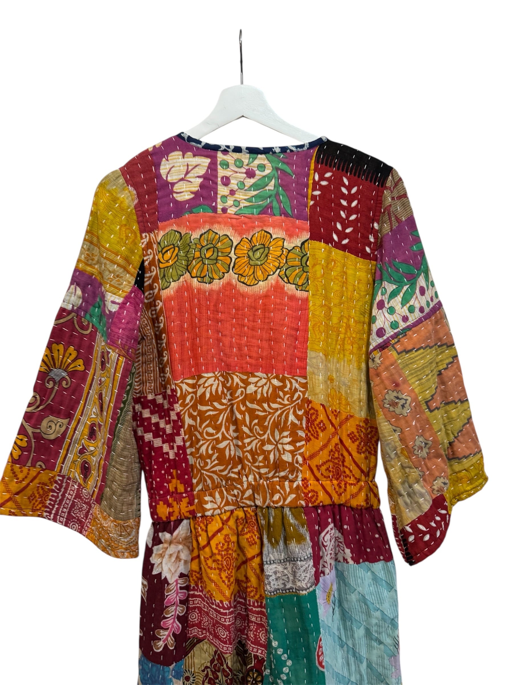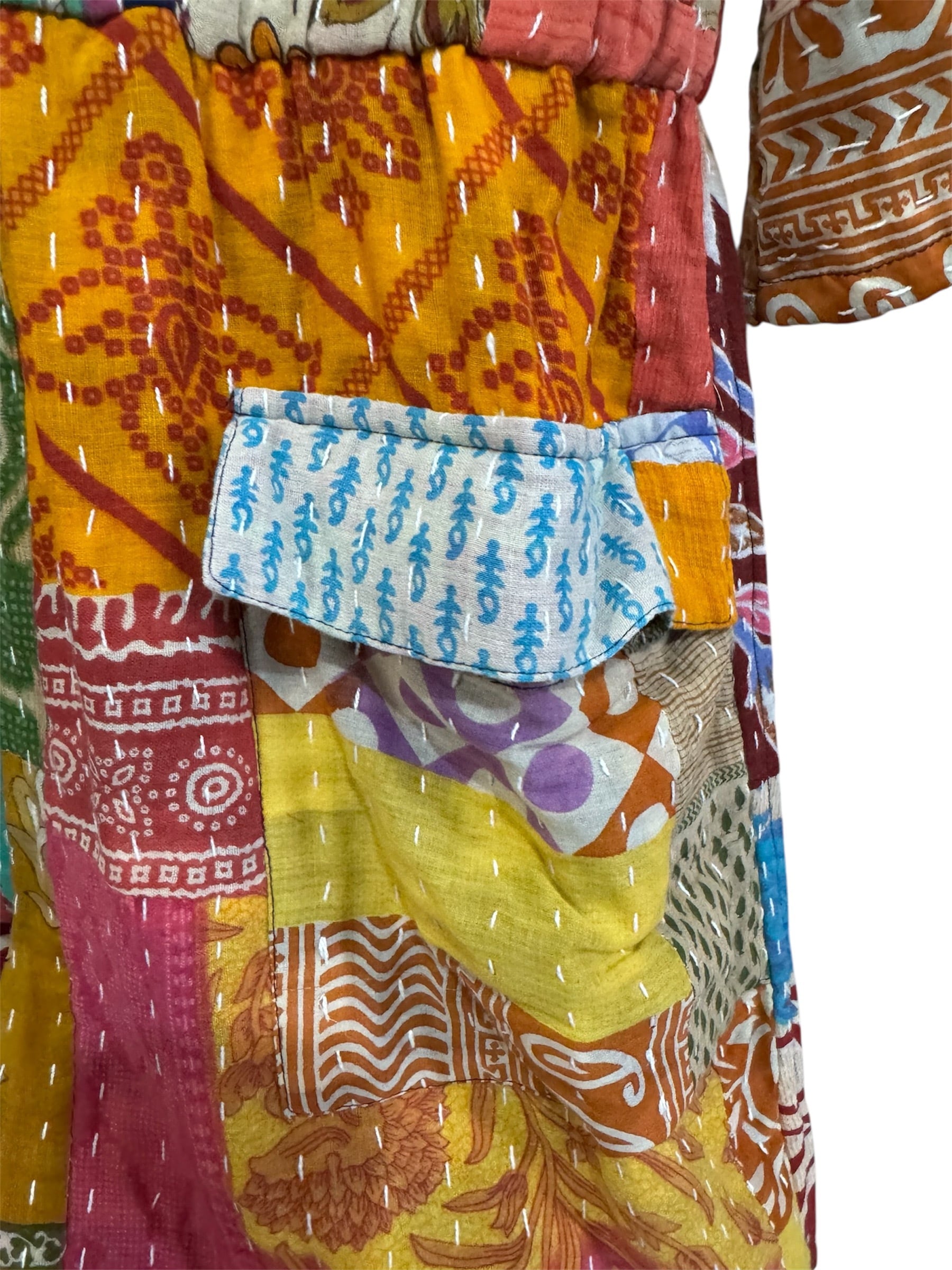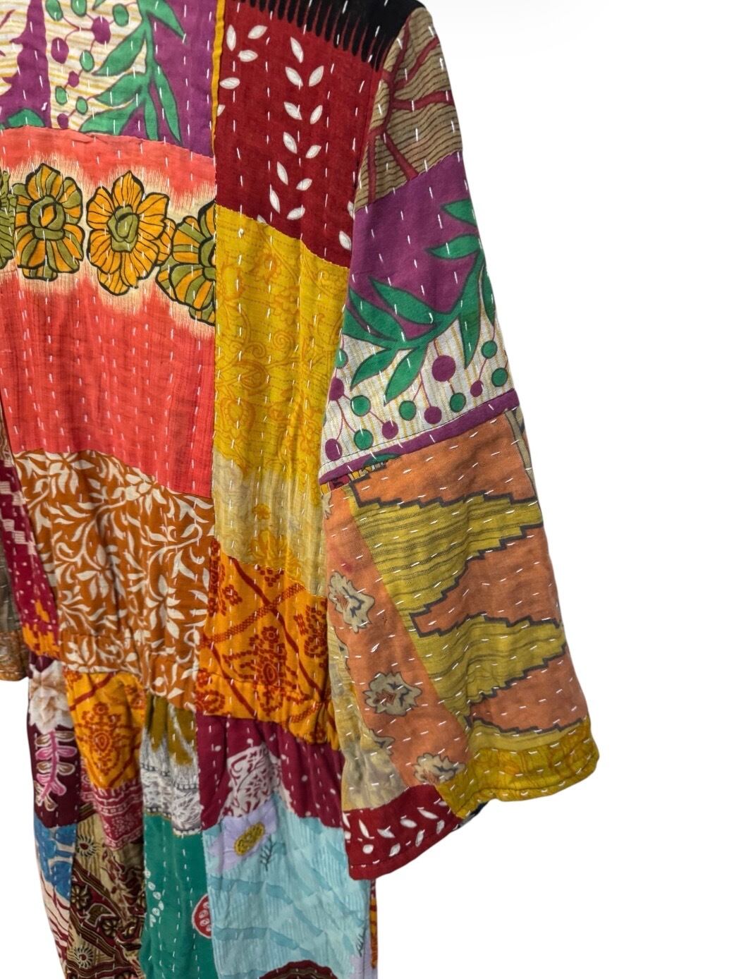 色とりどりのヴィンテージファブリックをパッチワーク状に組み合わせ、全面に施されたランニングステッチが温もりと奥行きを生み出しています。