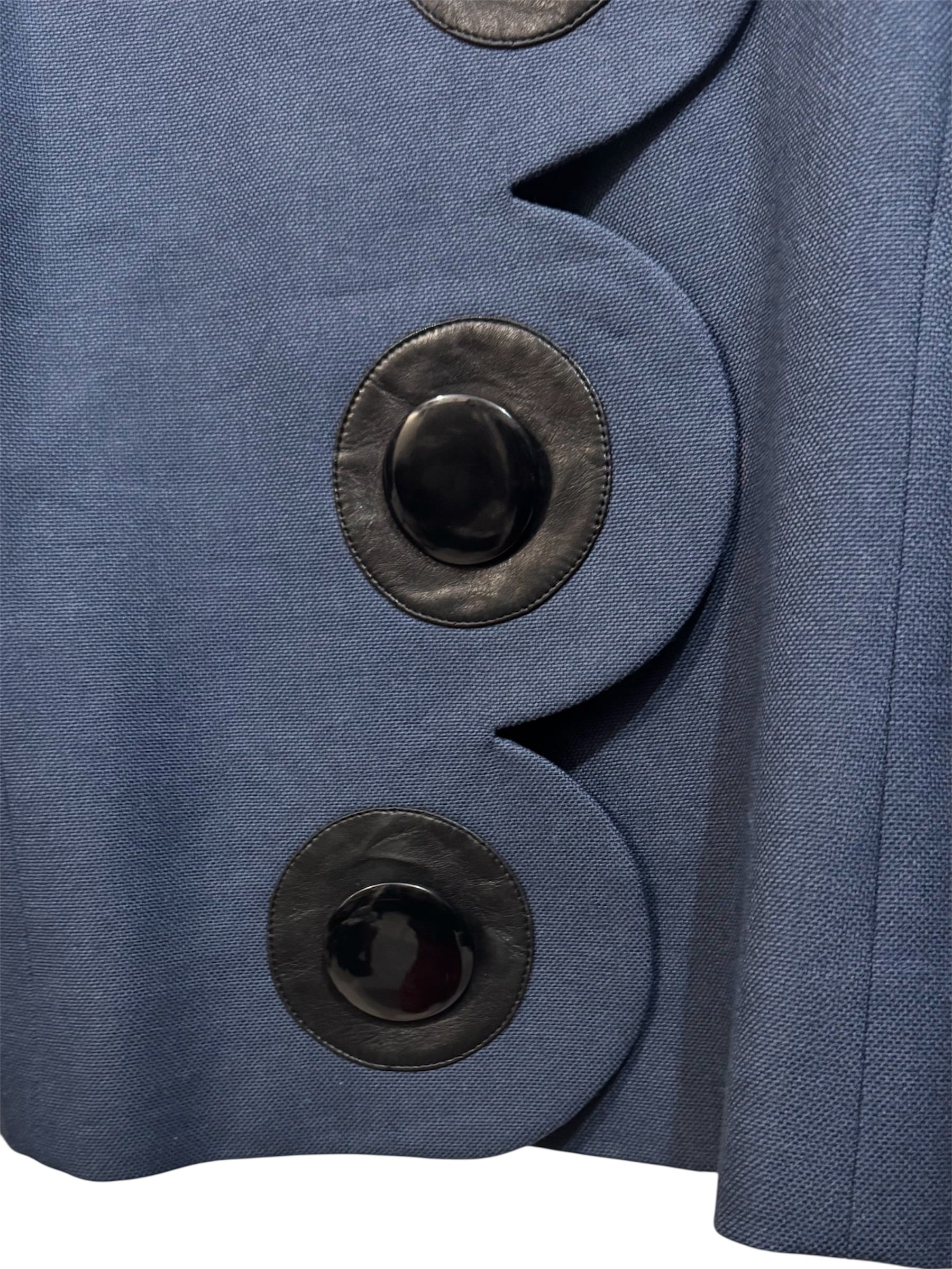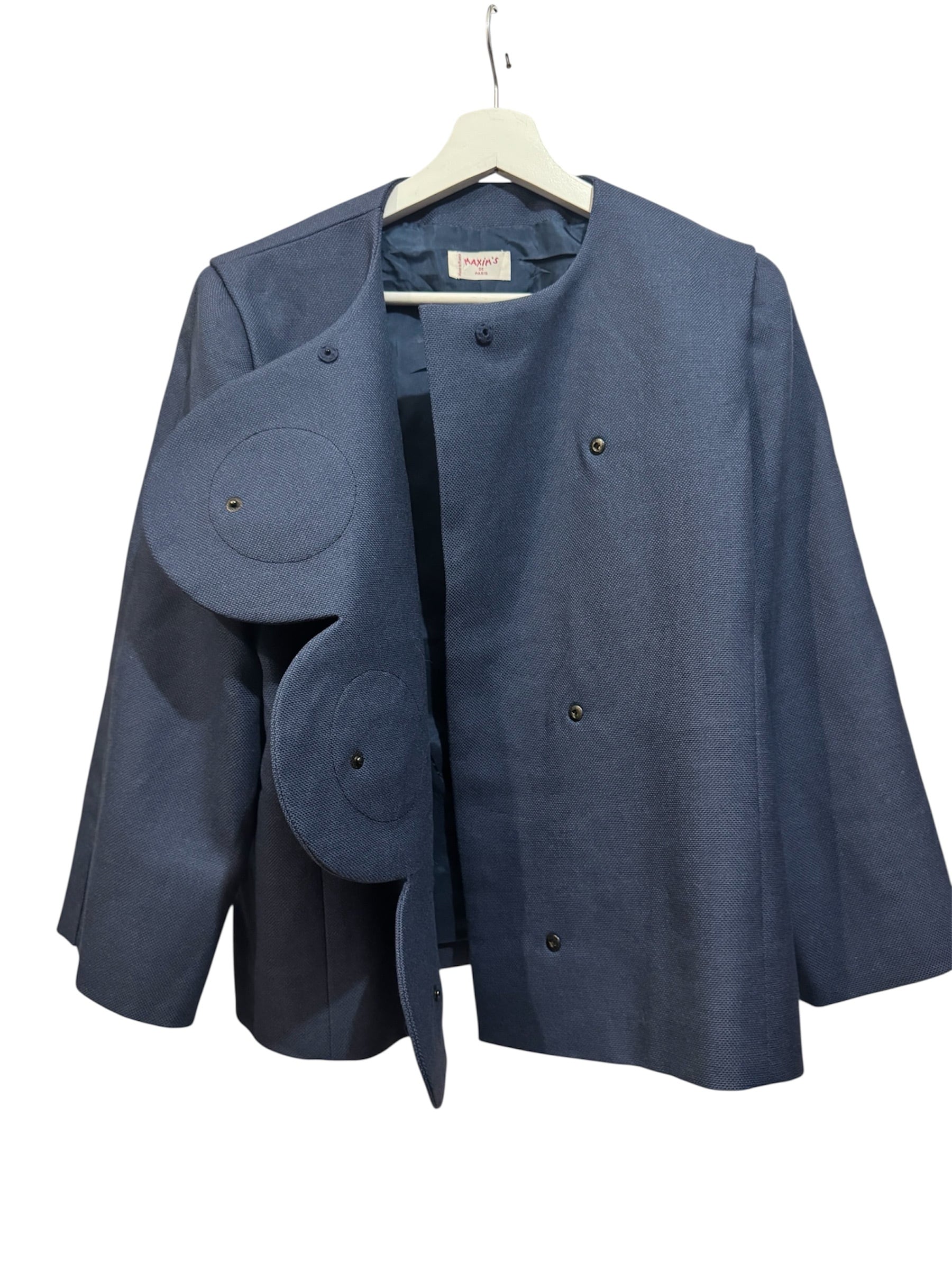 大きなオリジナル ボタンが特徴的な、スカラップ デザインのジャケットです。
