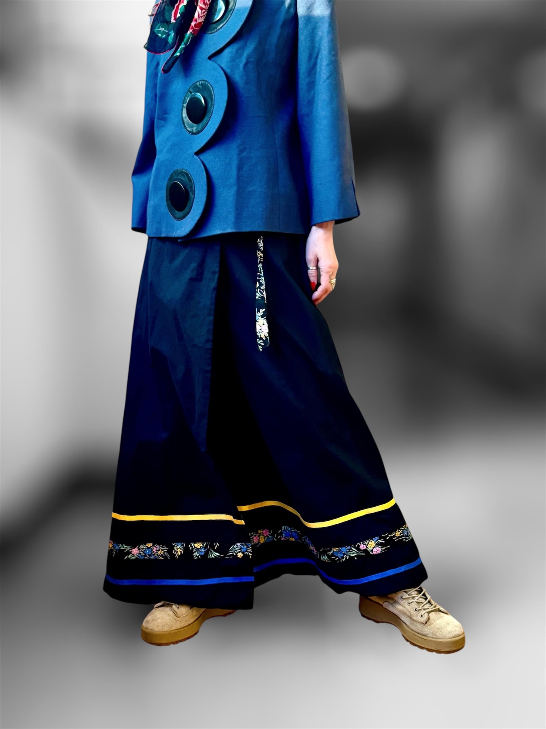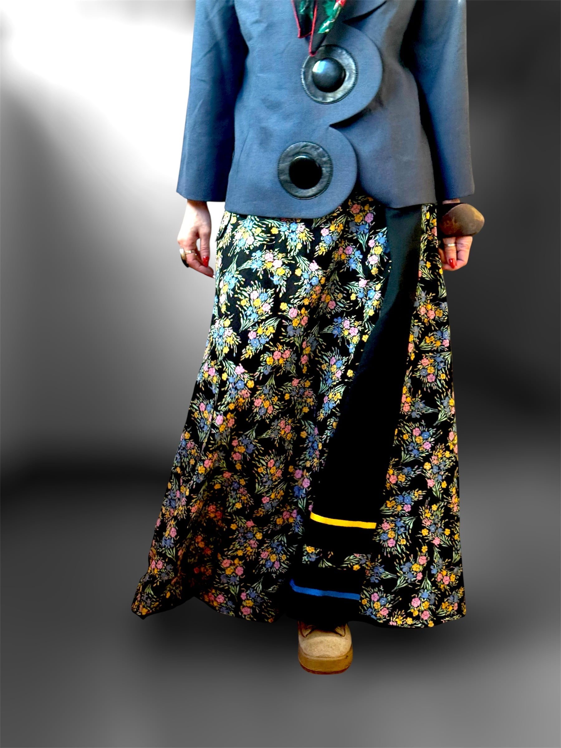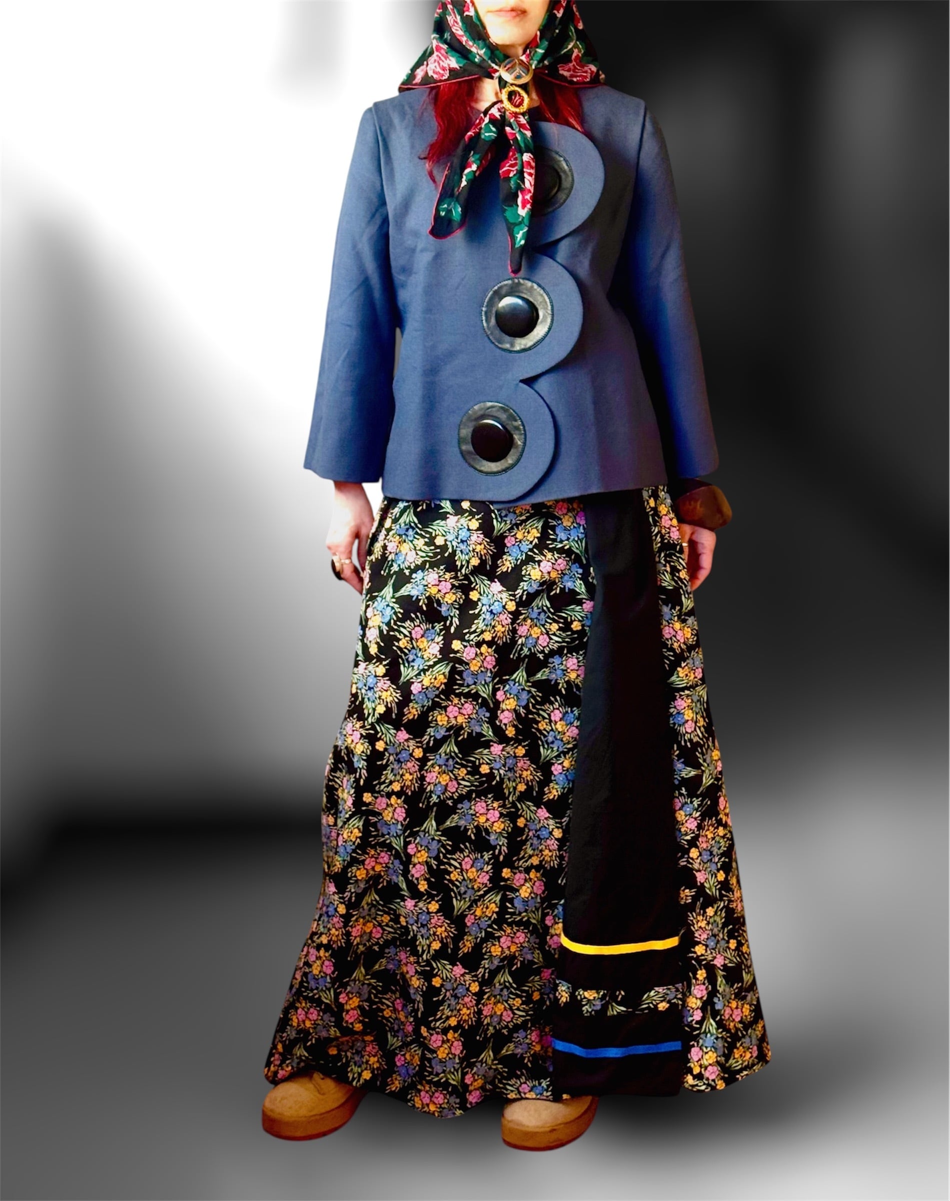 たっぷりと贅沢にヴィンテージ ファブリックを使い、フロア レングスほどある長さ、打ち合わせたっぷりに仕立てられたマキシ スカート