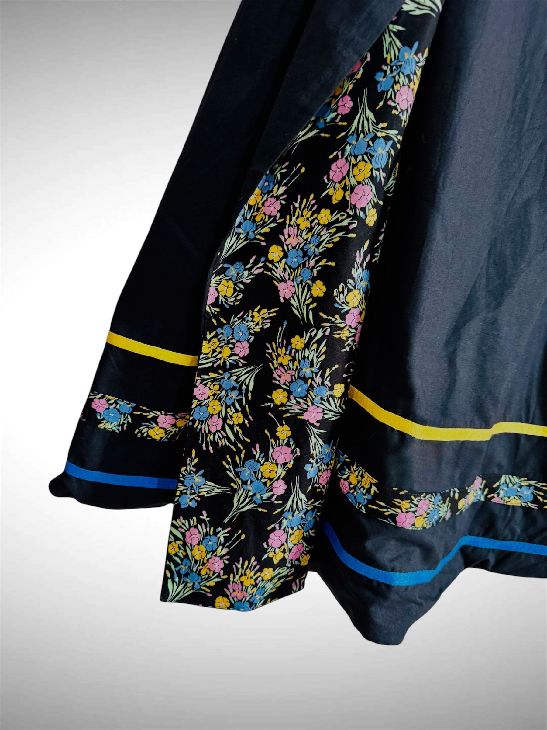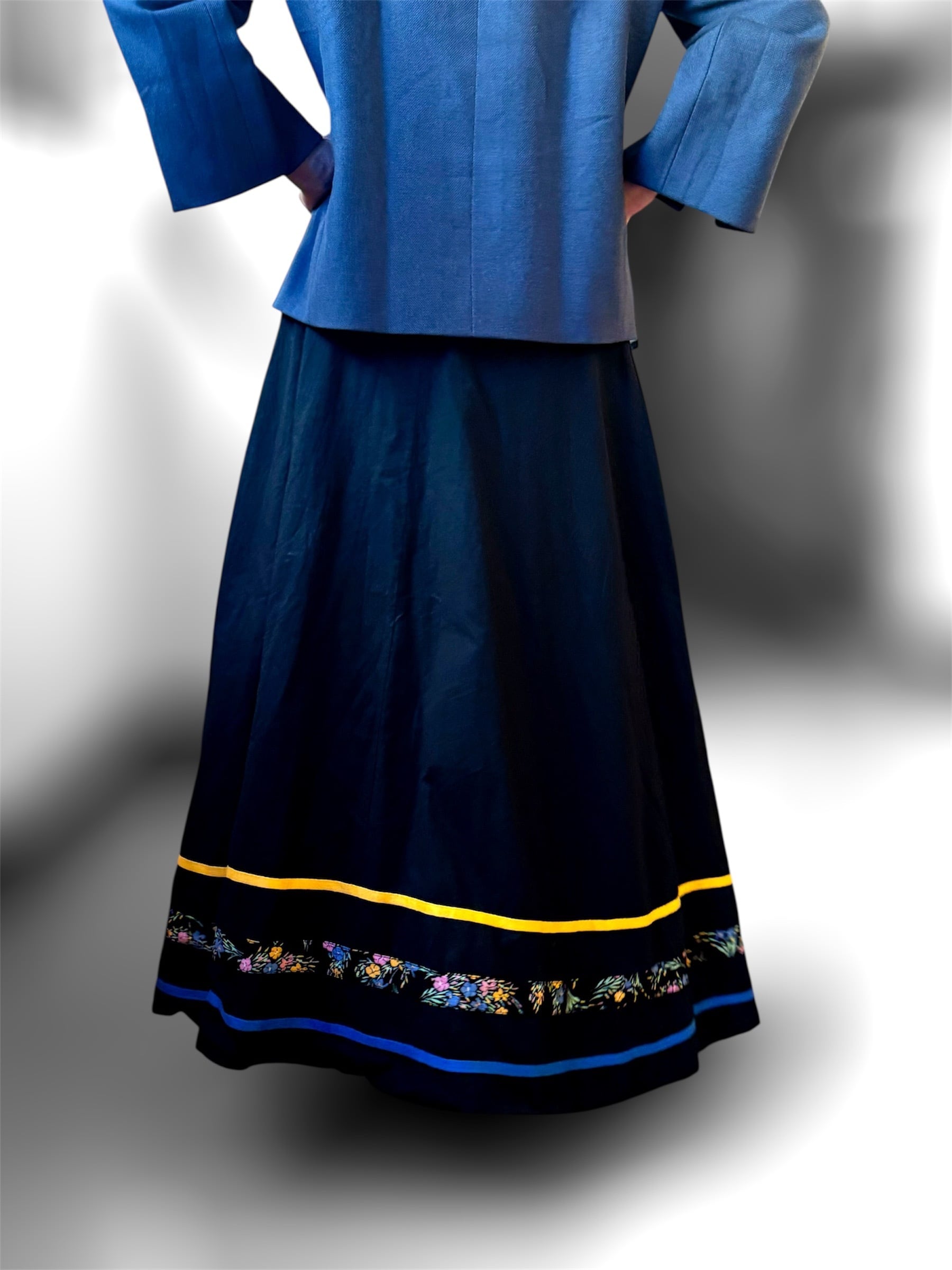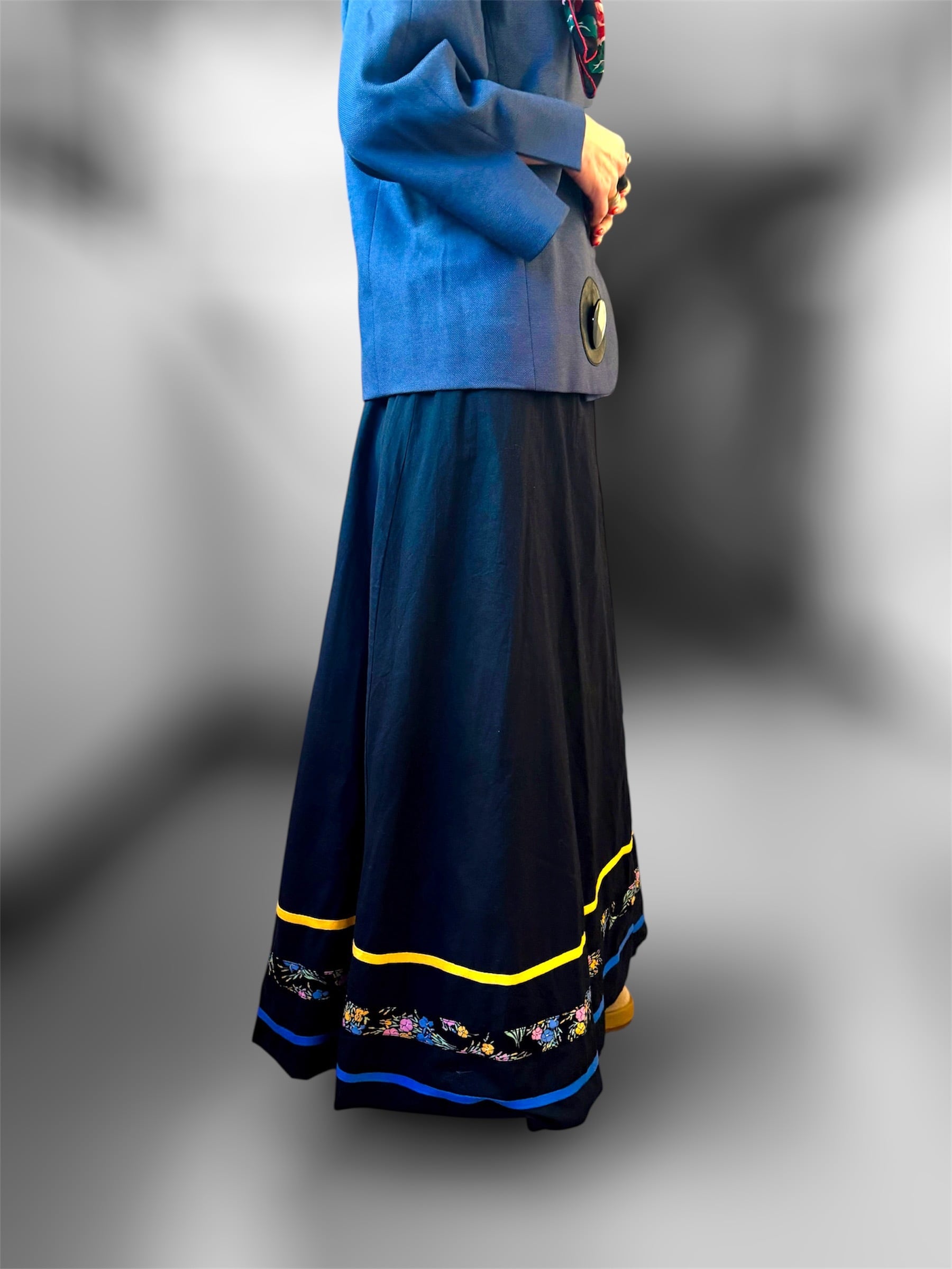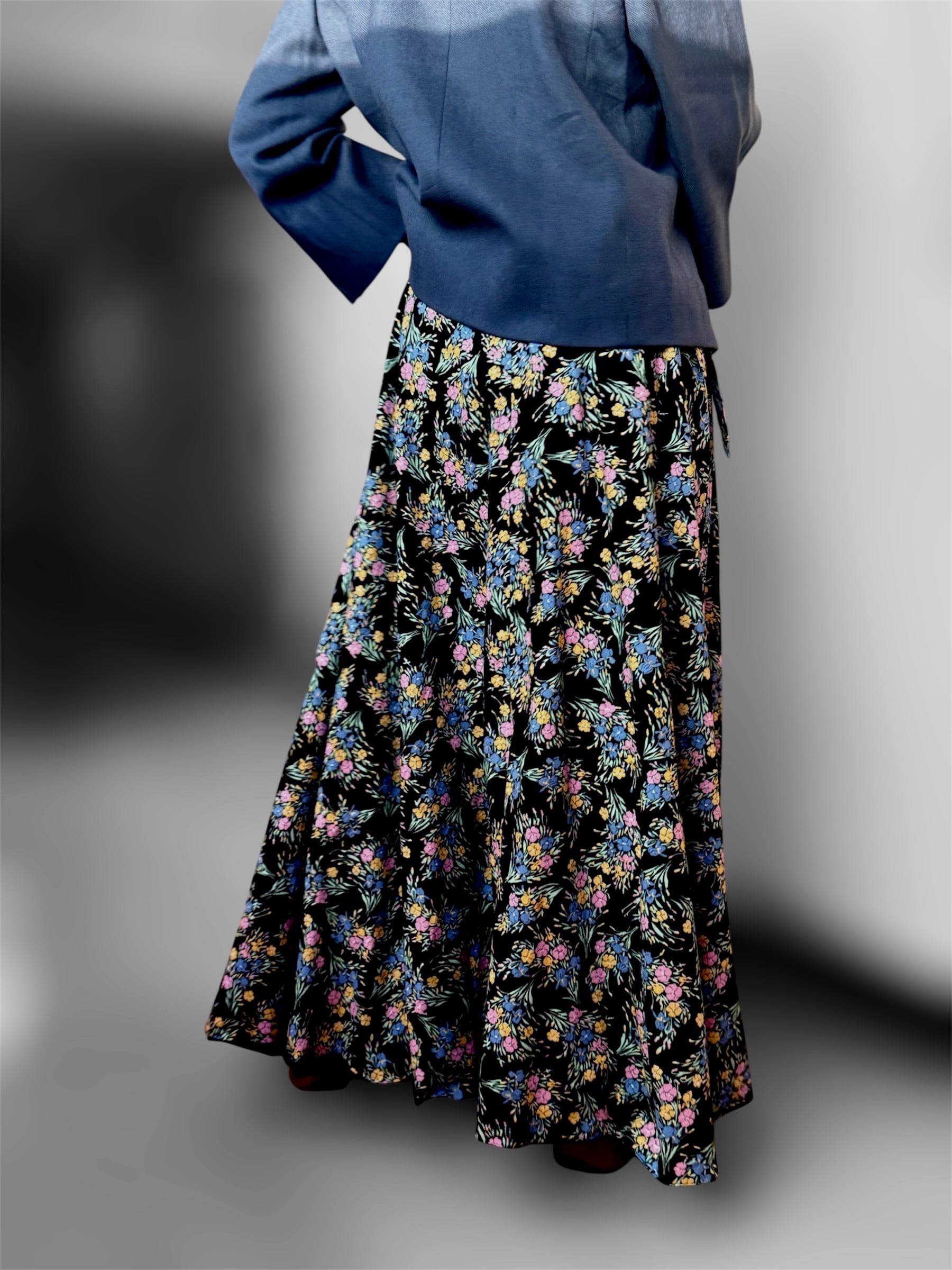 たっぷりと贅沢にヴィンテージ ファブリックを使い、フロア レングスほどある長さ、打ち合わせたっぷりに仕立てられたマキシ スカート