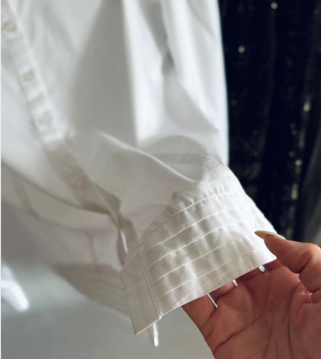 肩と裾に施されたタックがポイント