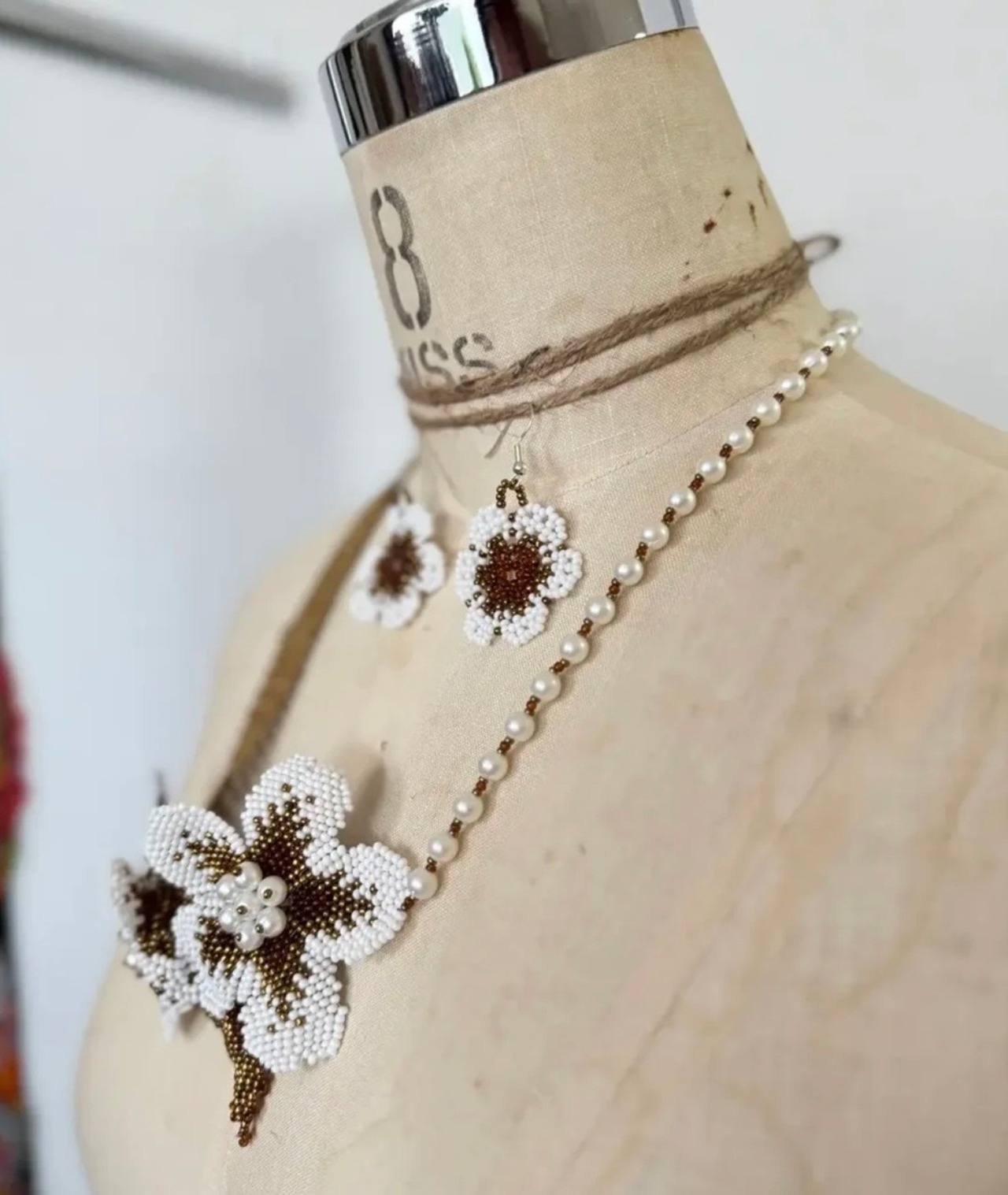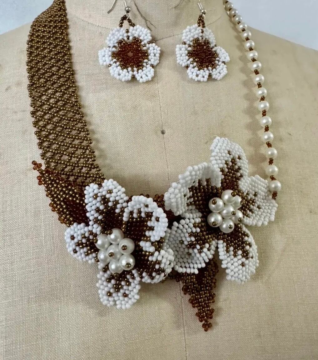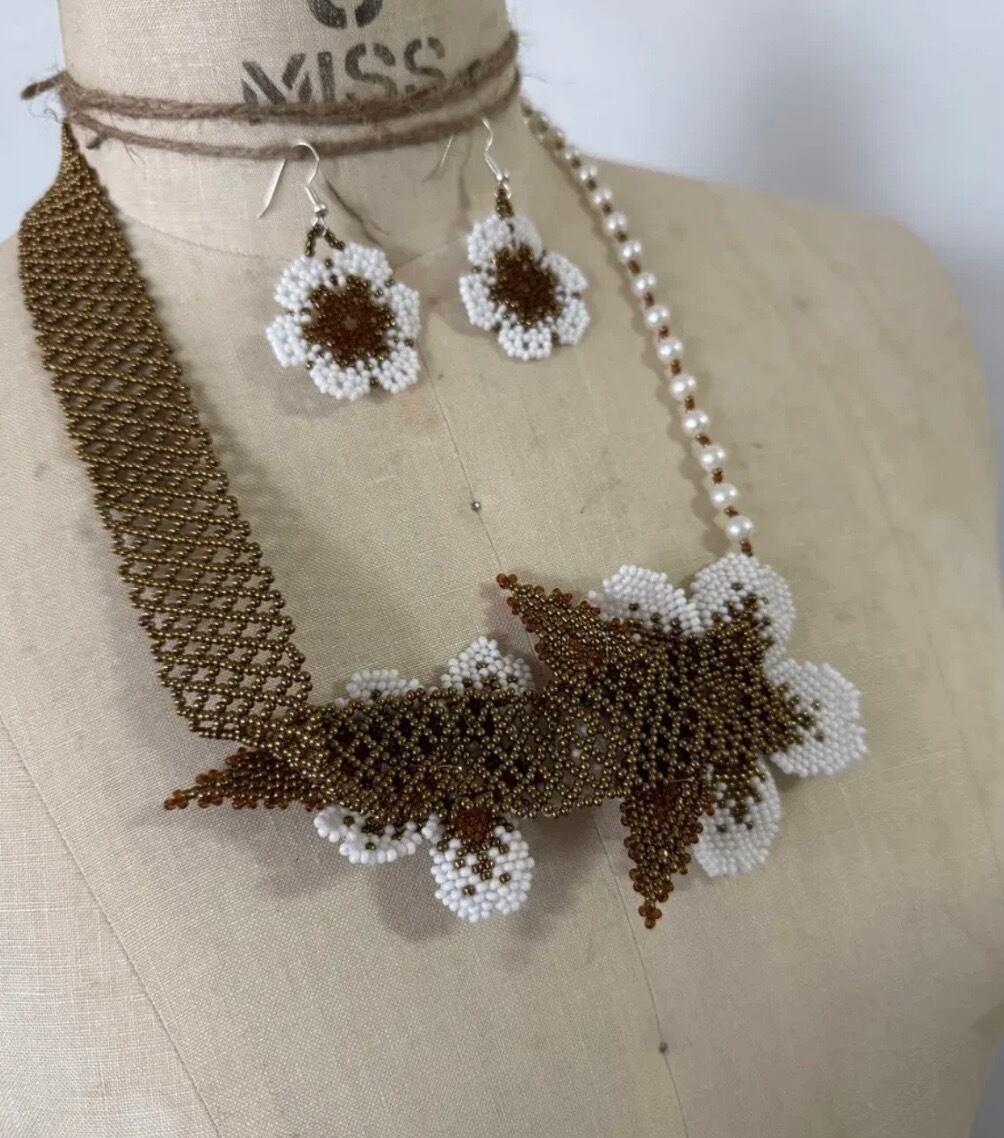 メキシカン ヴィンテージ アシンメトリー デザイン ビーズ ネックレス & ピアス_ フラワー