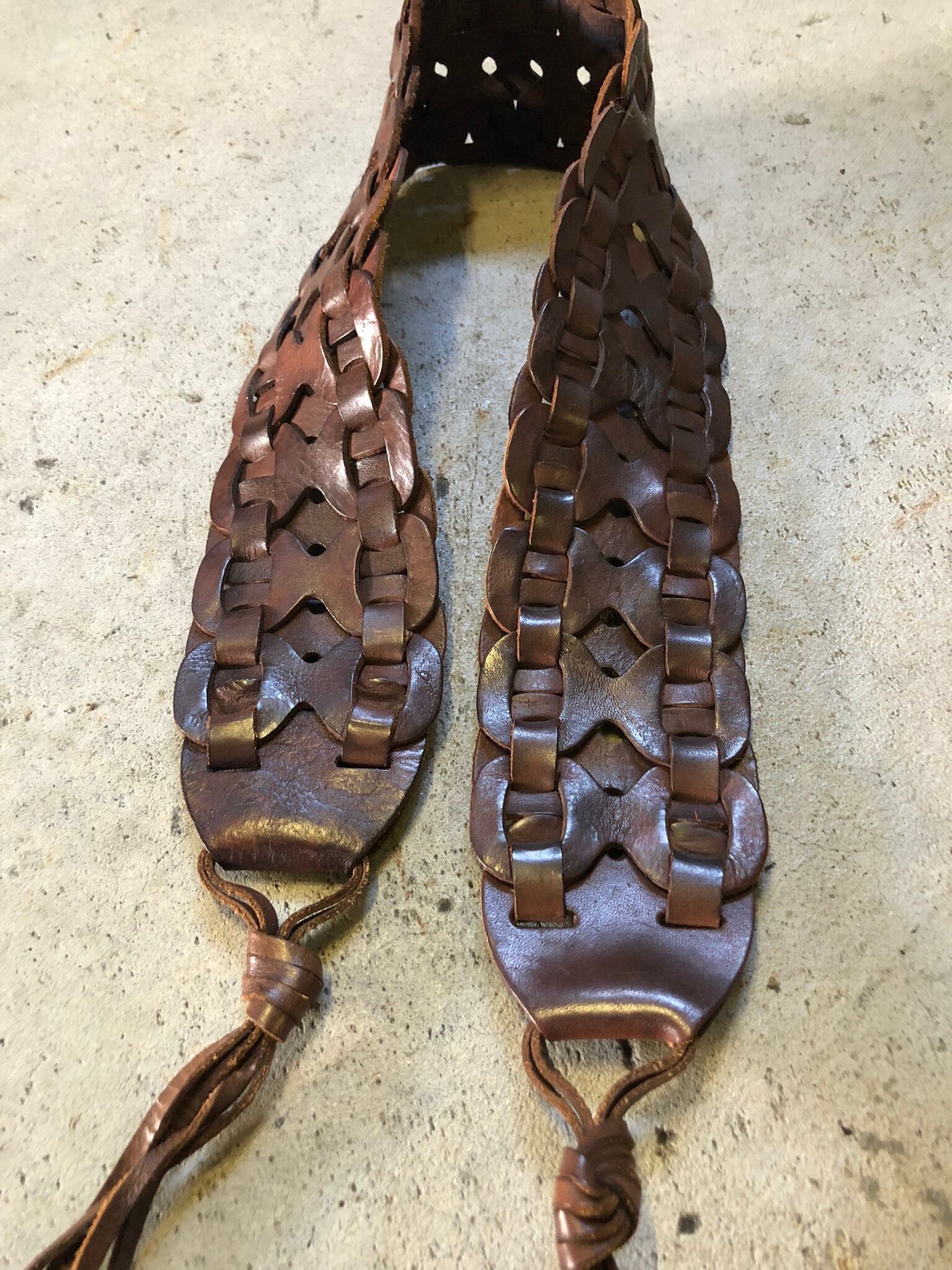 複雑に編まれた、幾何学模様のようでもあるレザーのワイドベルトです。