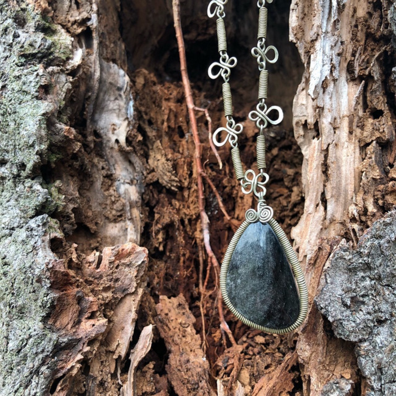 真鍮 & ブラック ビッグ ストーン ペンダント_ ハンドメイド