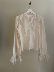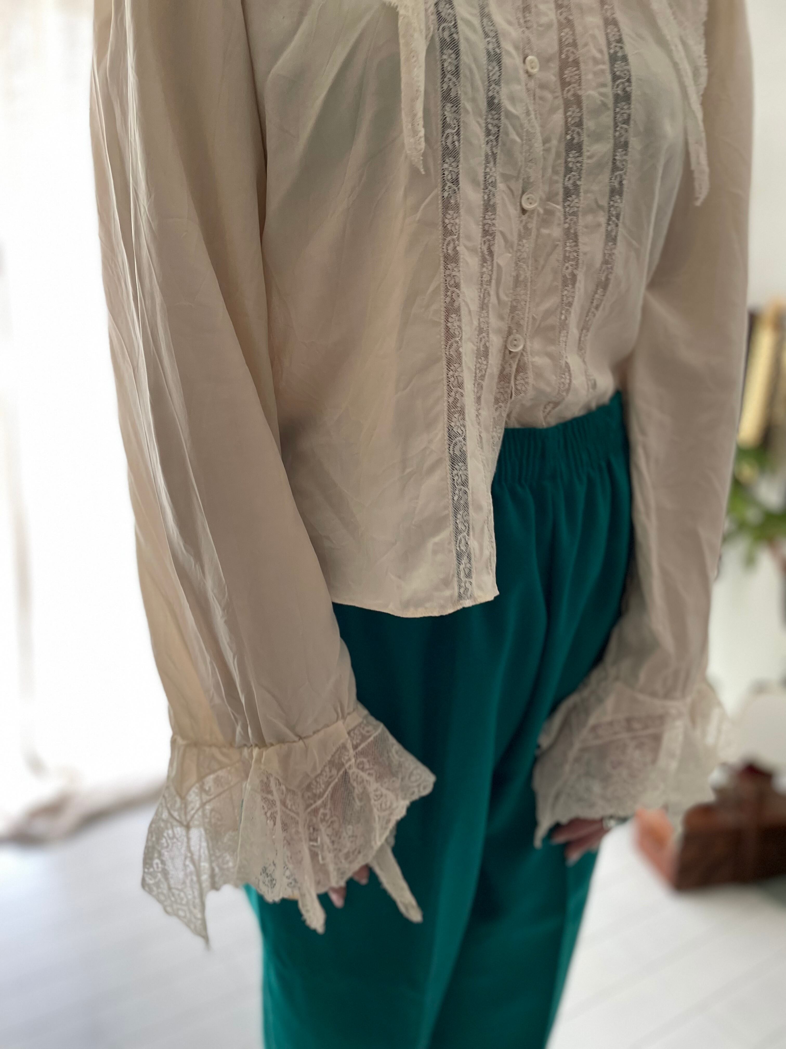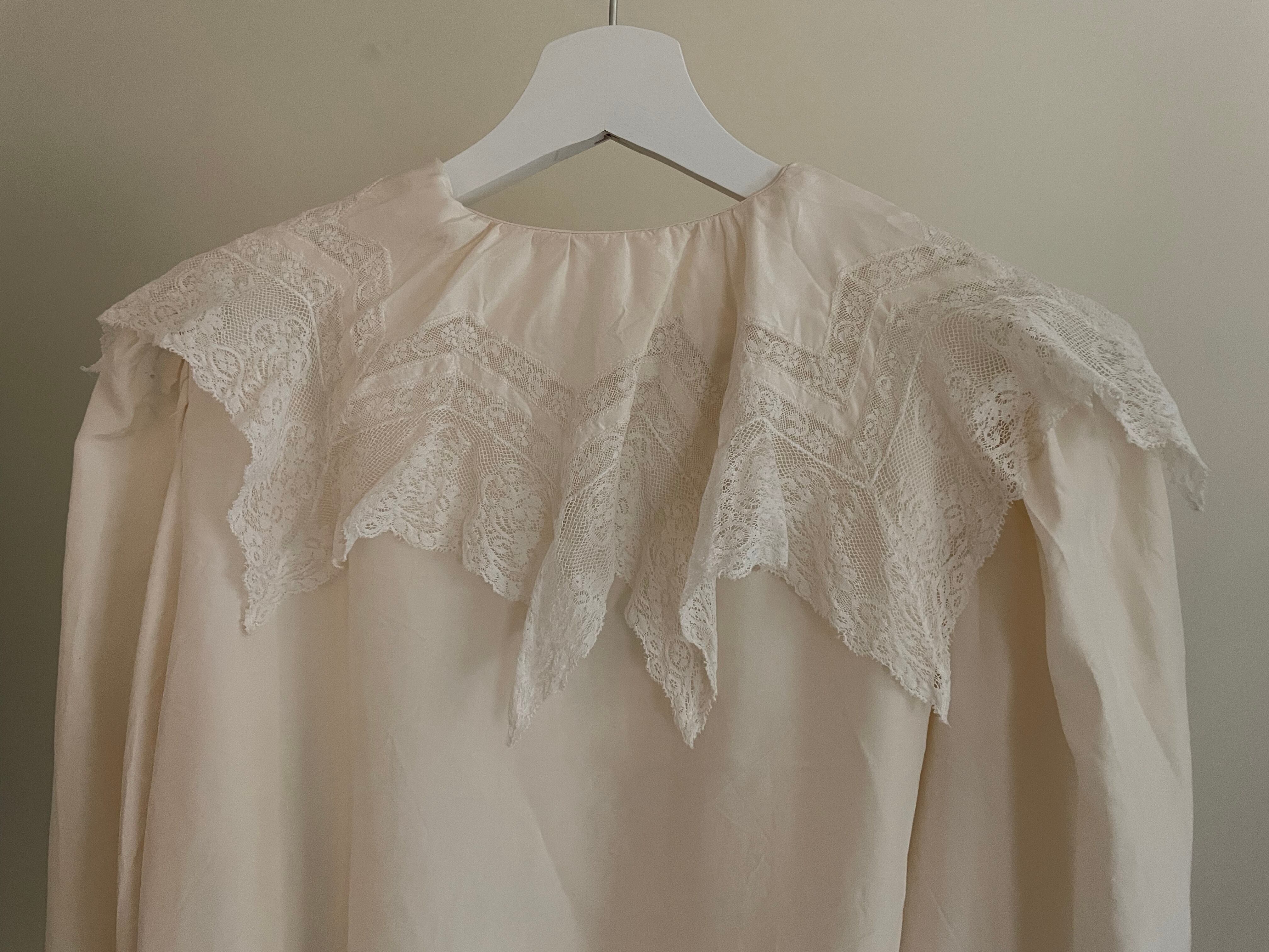 オーダーメイドのとても丁寧な仕事を感じるアンティーク レースの大きな襟と、カフスがポイントのシルク ブラウスです。