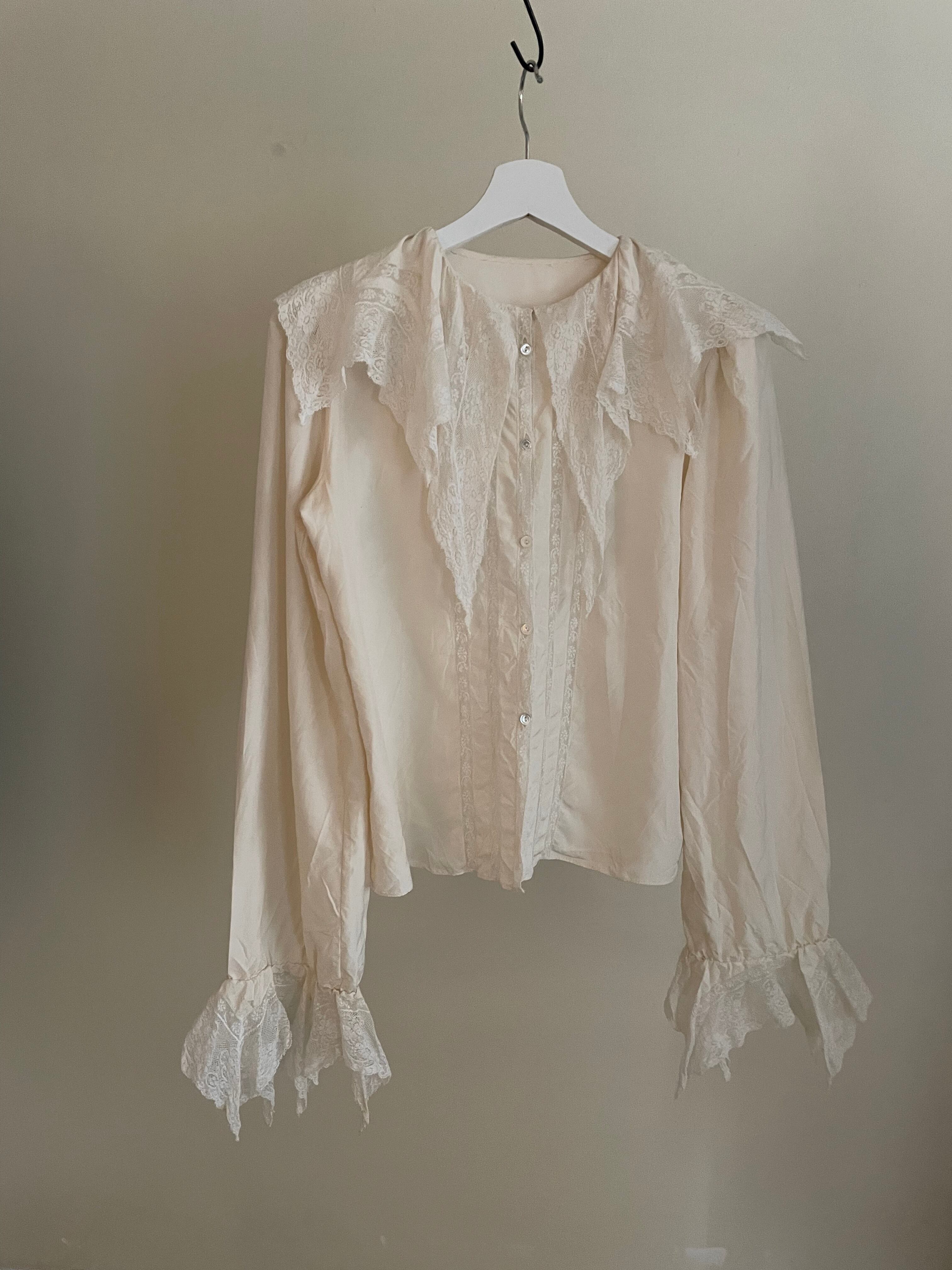 1940s UK vintage ordermade antique lace Big collar Silk blouse