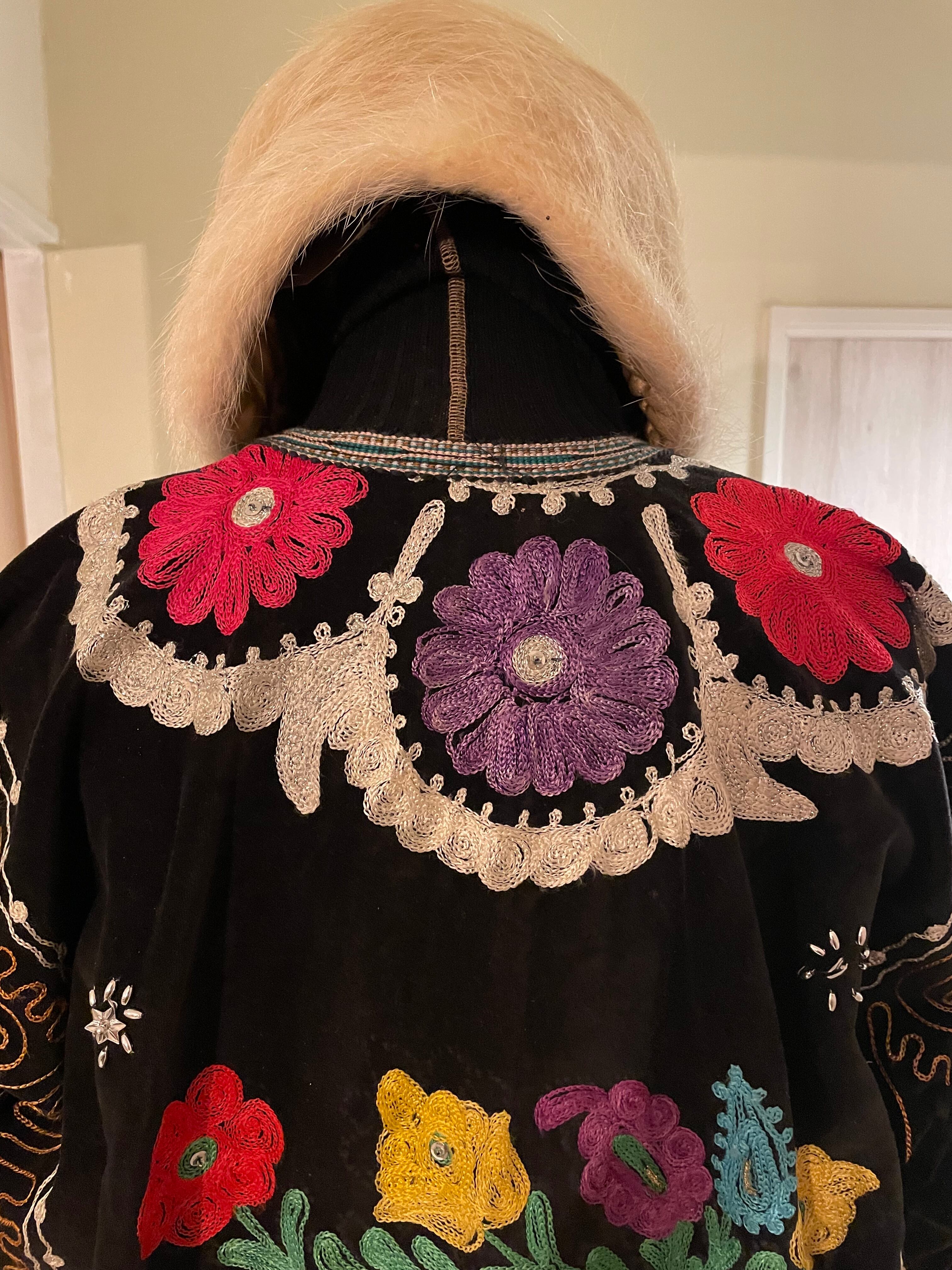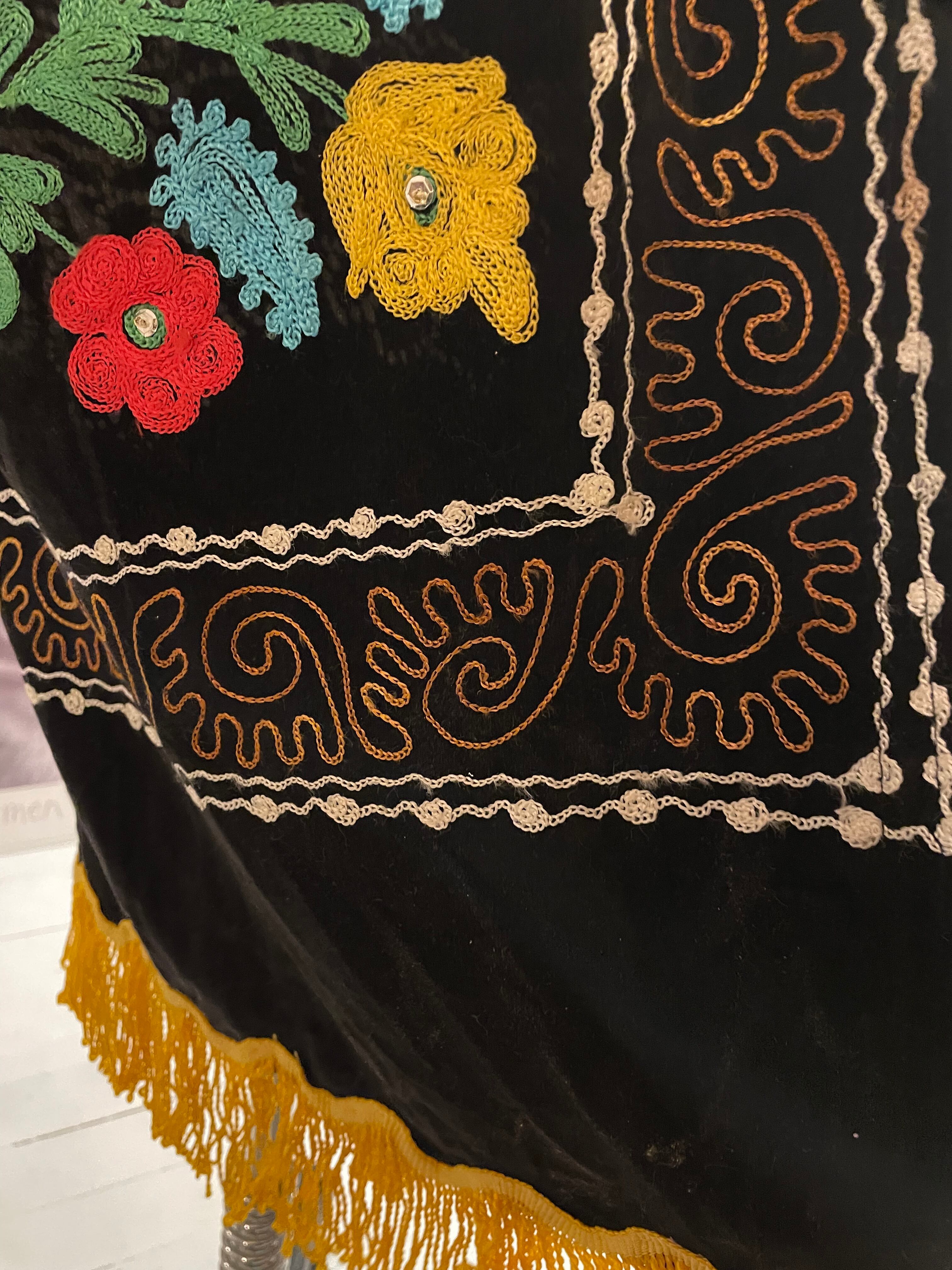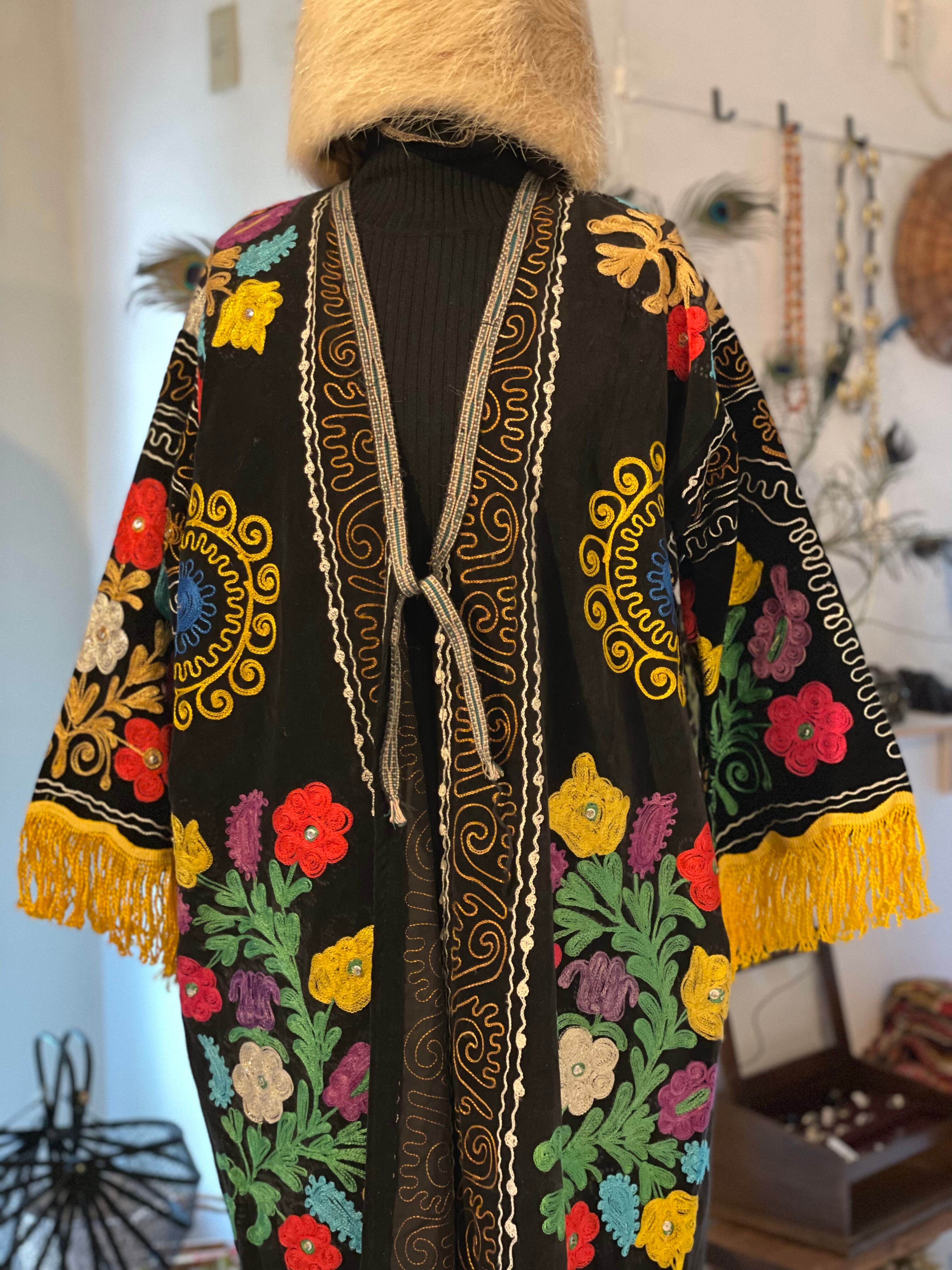 1980s Uzbek vintage handmade embroidery SUZANI robe _ Velvet with fringe