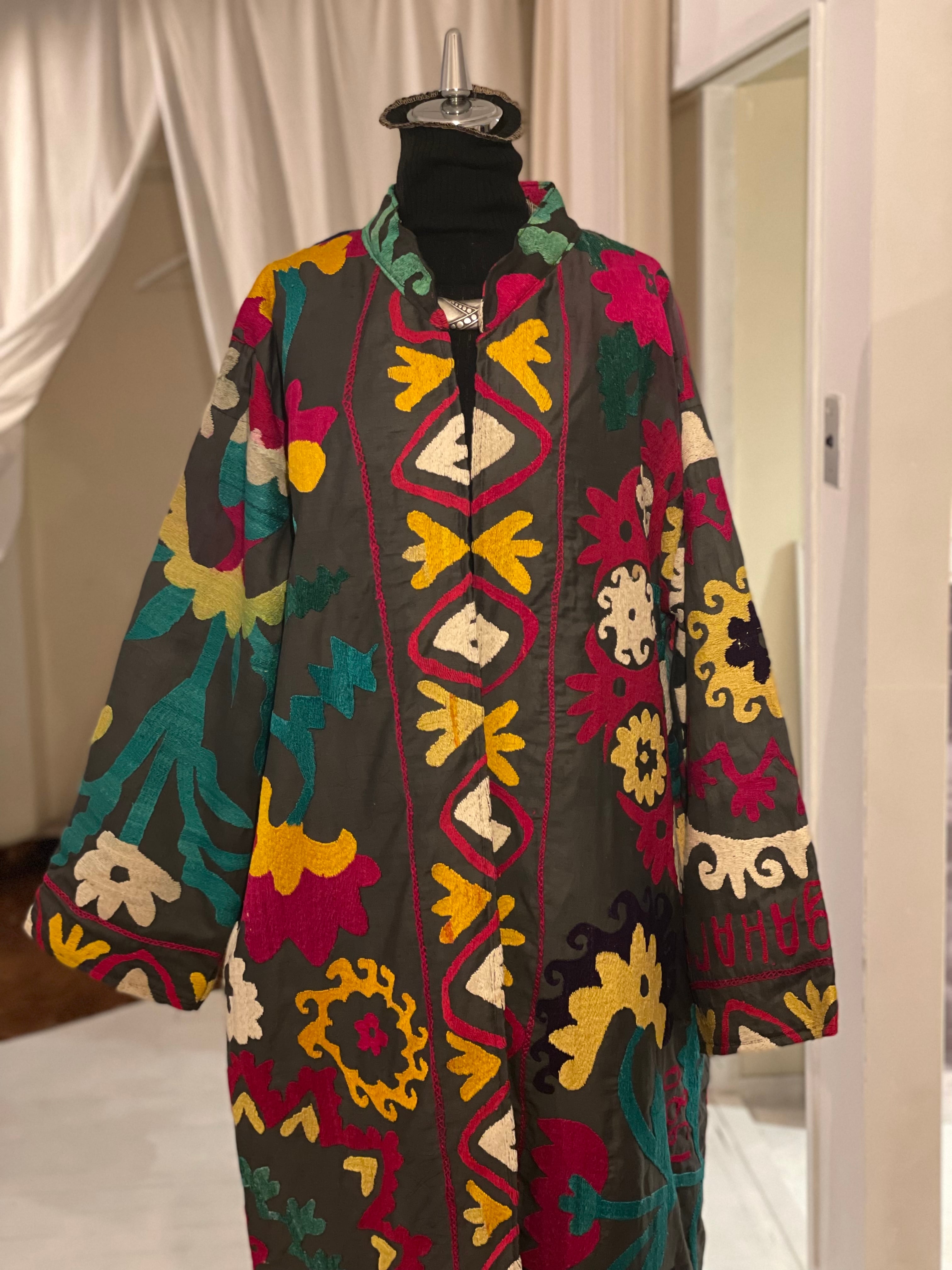 1980s Uzbek vintage handmade embroidery SUZANI robe _ Grey , over size