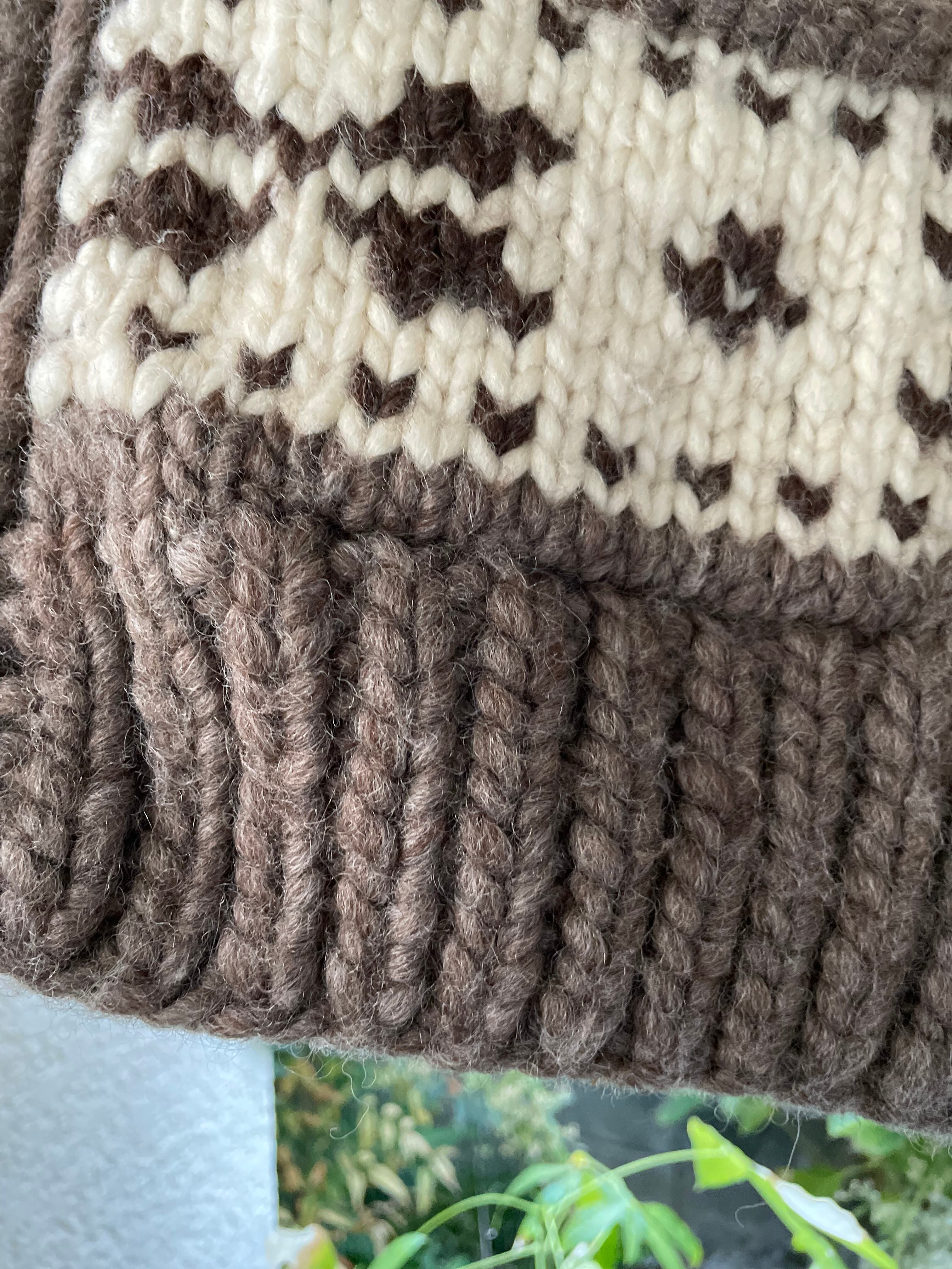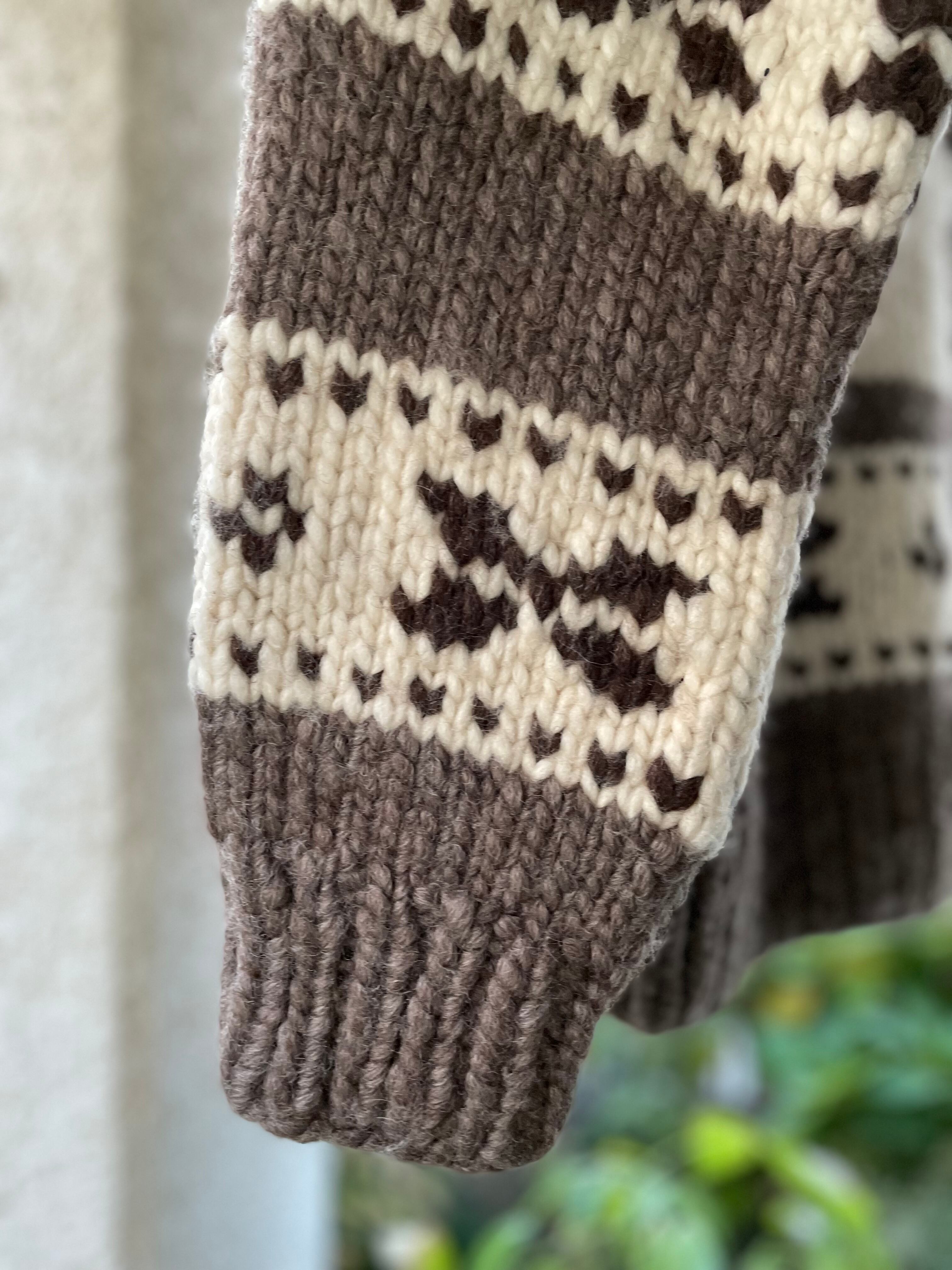 使用される毛糸は、手で紡がれていることから均一ではなく、多少ボコボコとした味があるのも、ネイティブ カウチンセーターの特徴です。