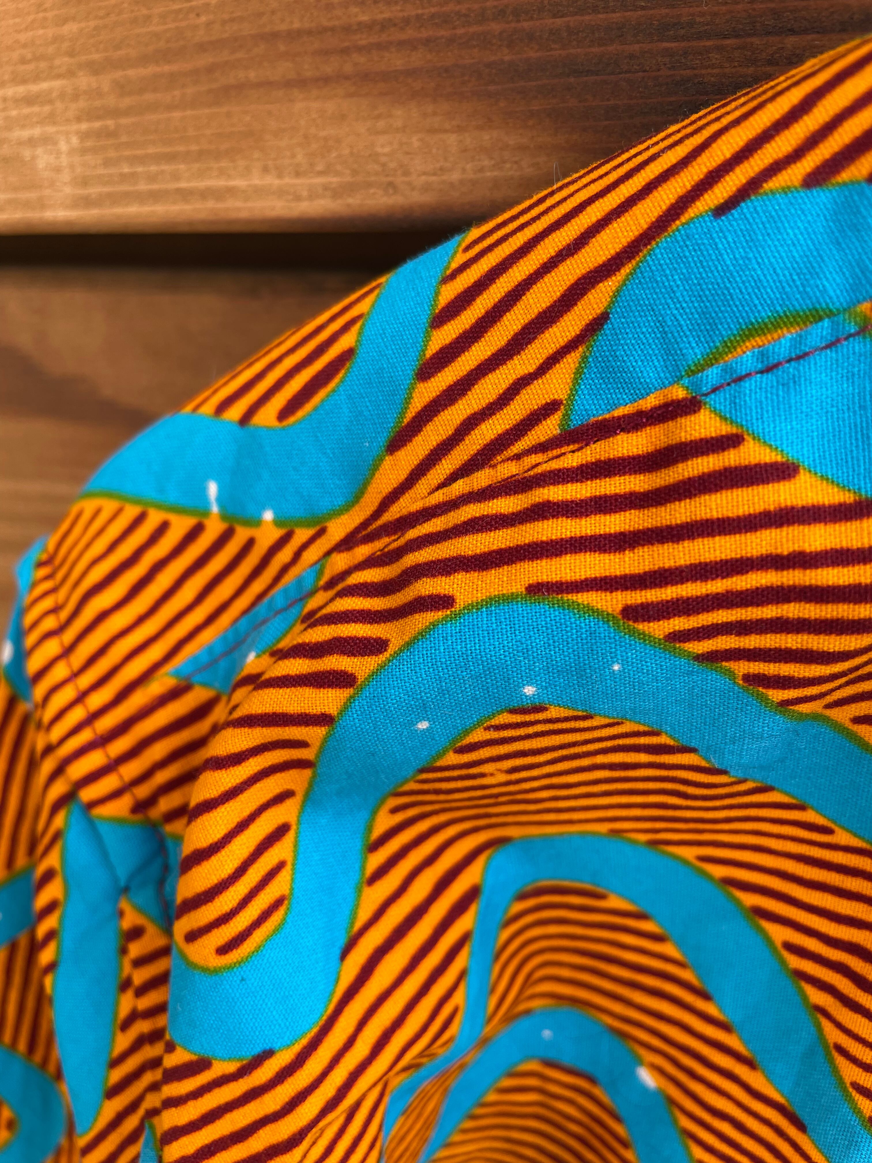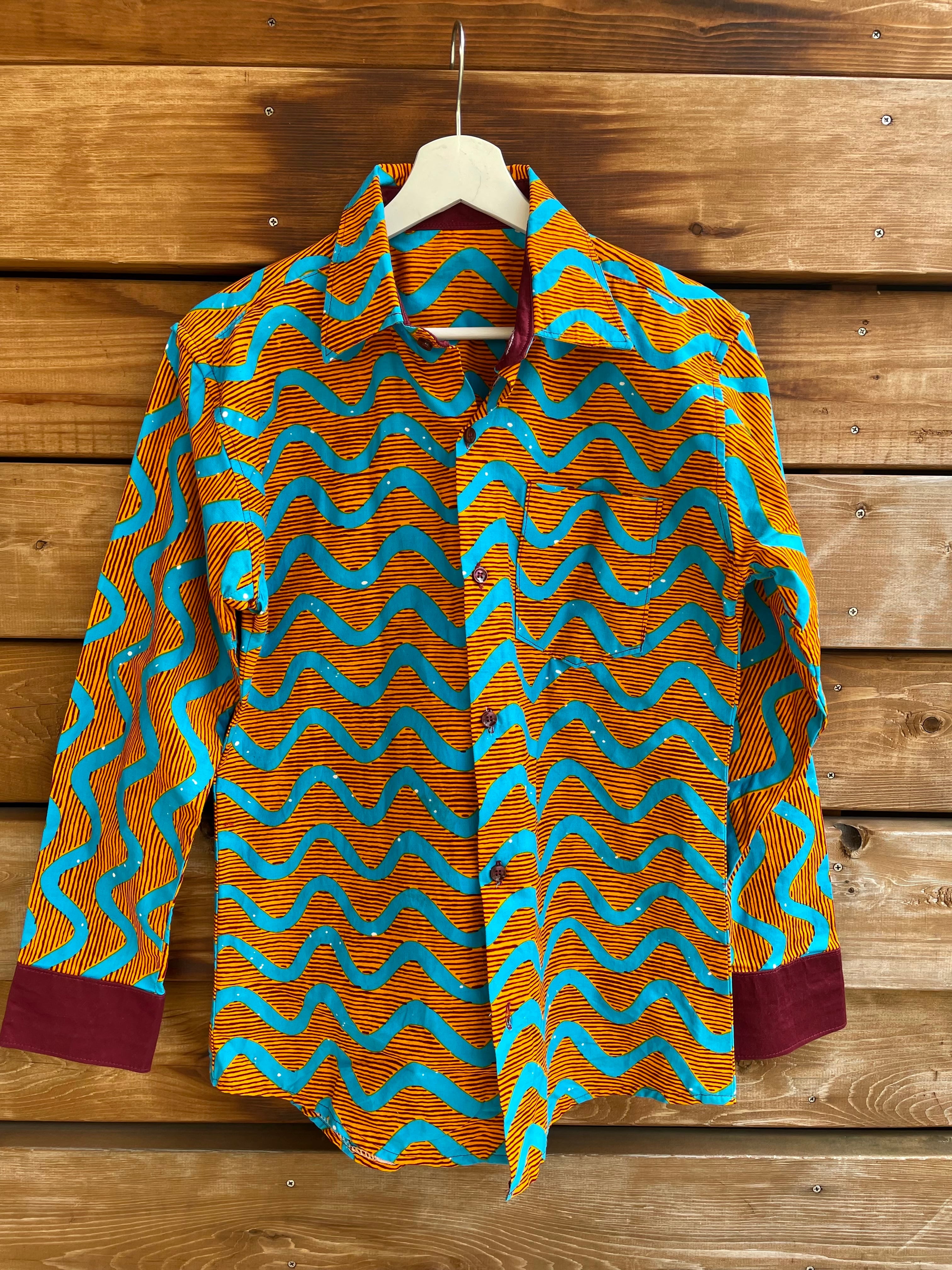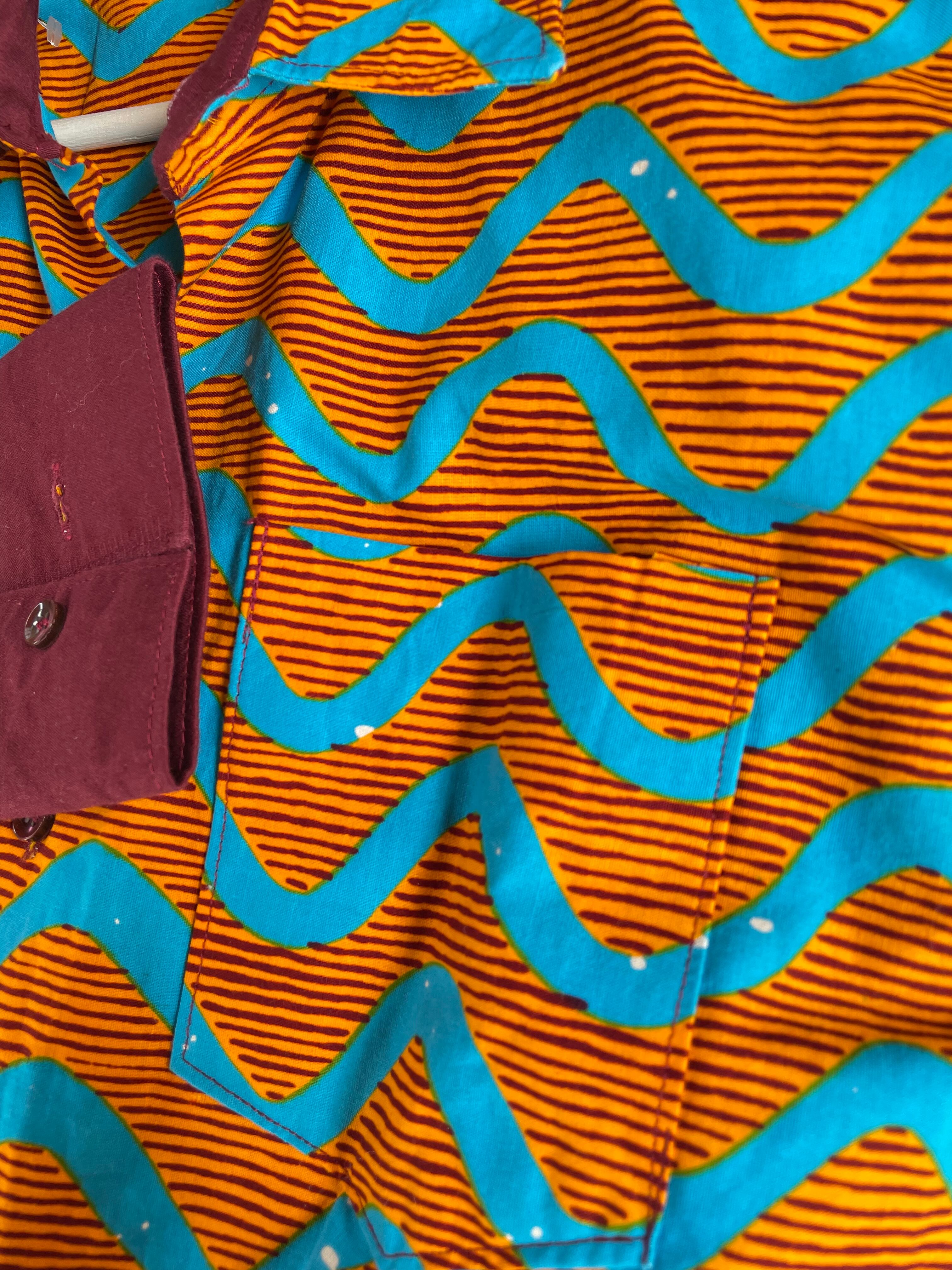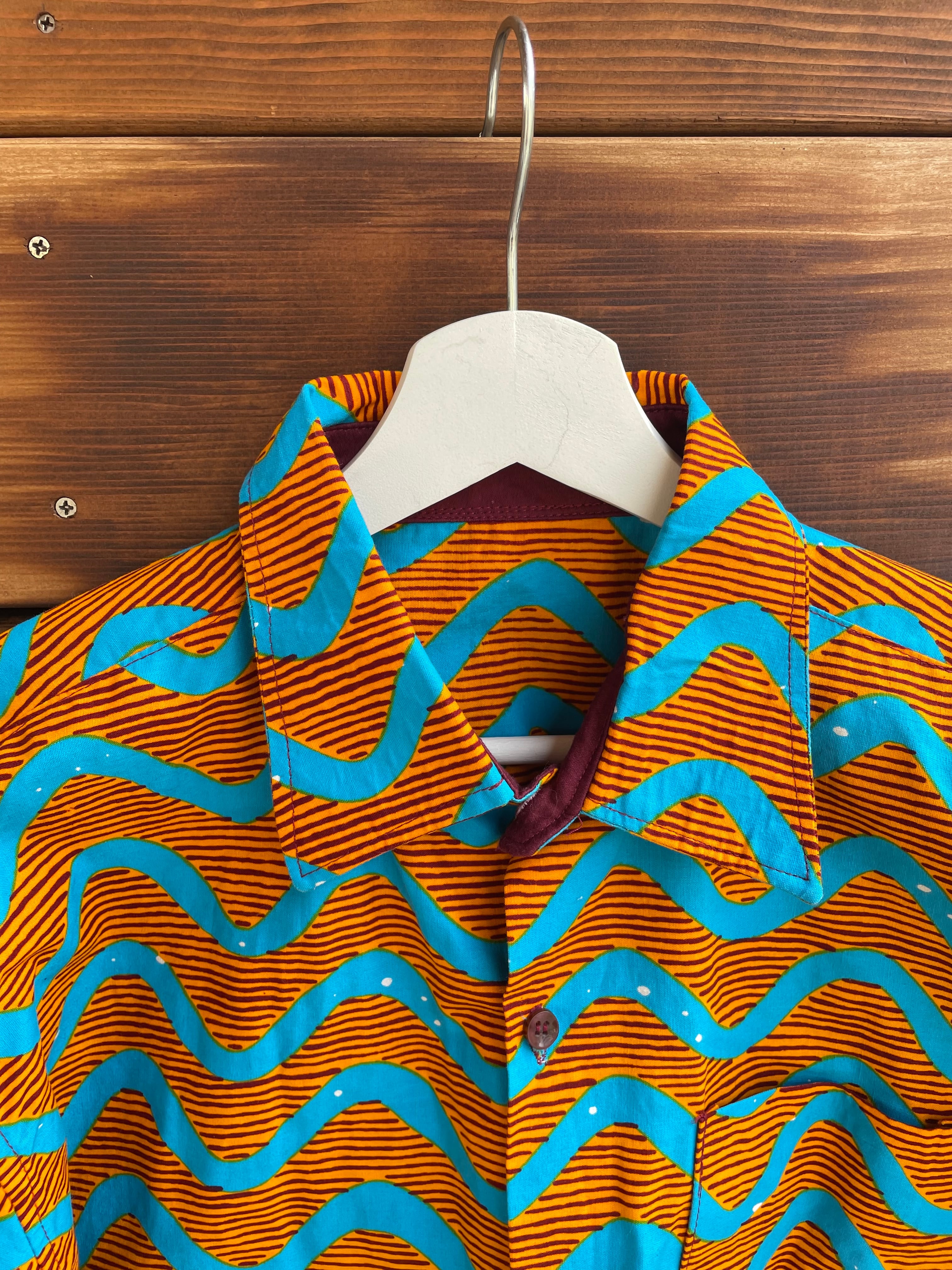 カラーリング・テキスタイルも とても素敵なアフリカン バティックで、シンプルなシャツに仕立てたオーダーメイドの men's シャツ、なかなか出会わない一点。