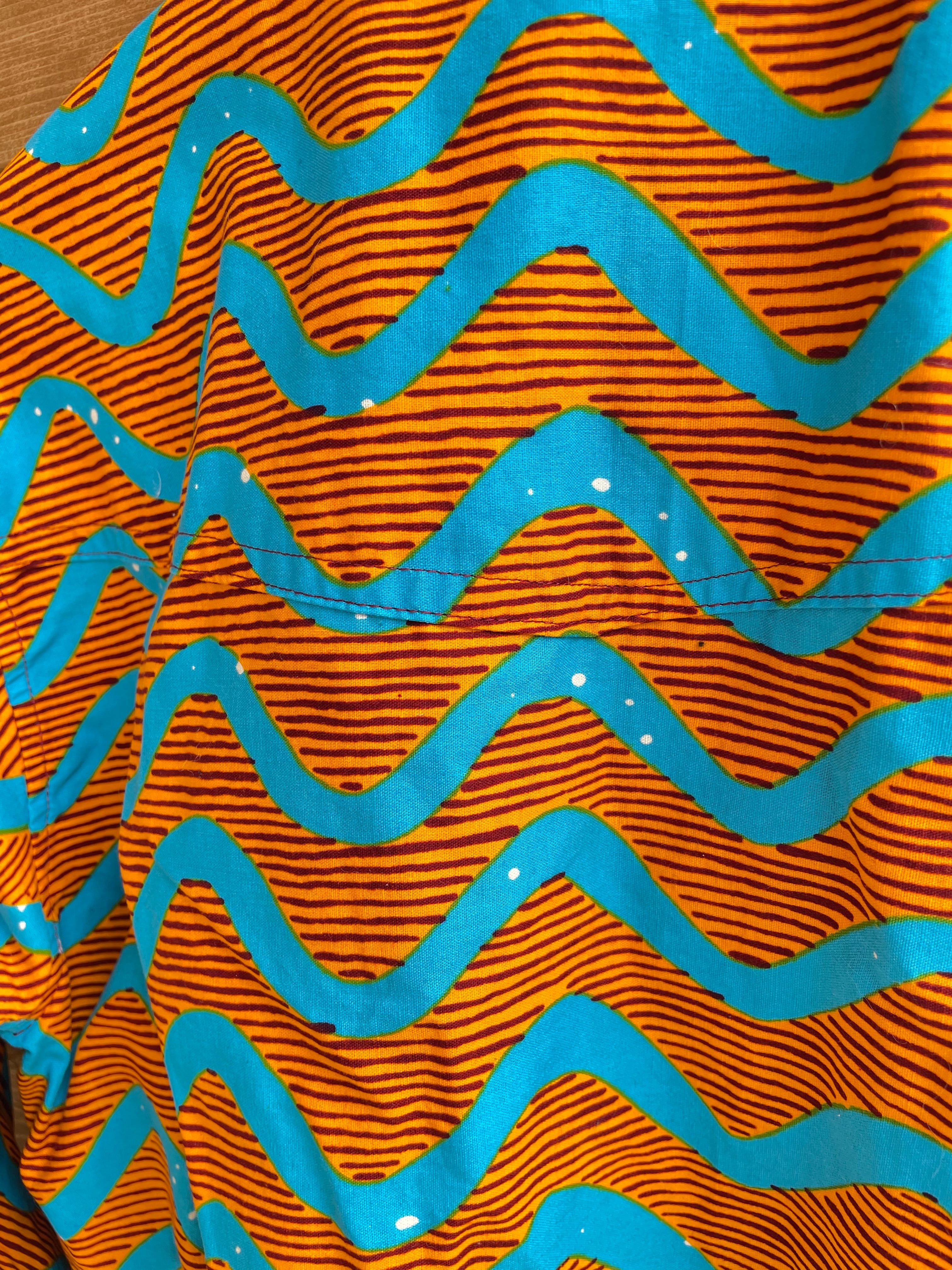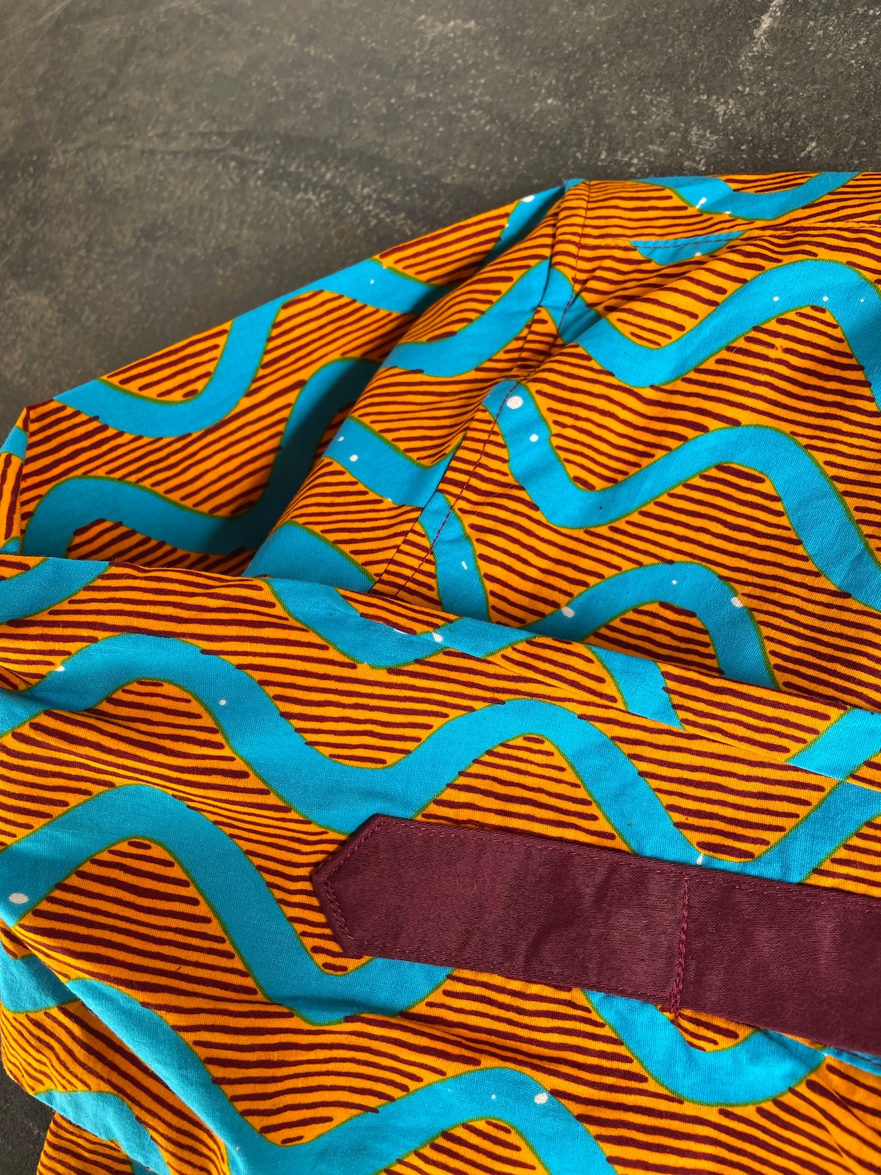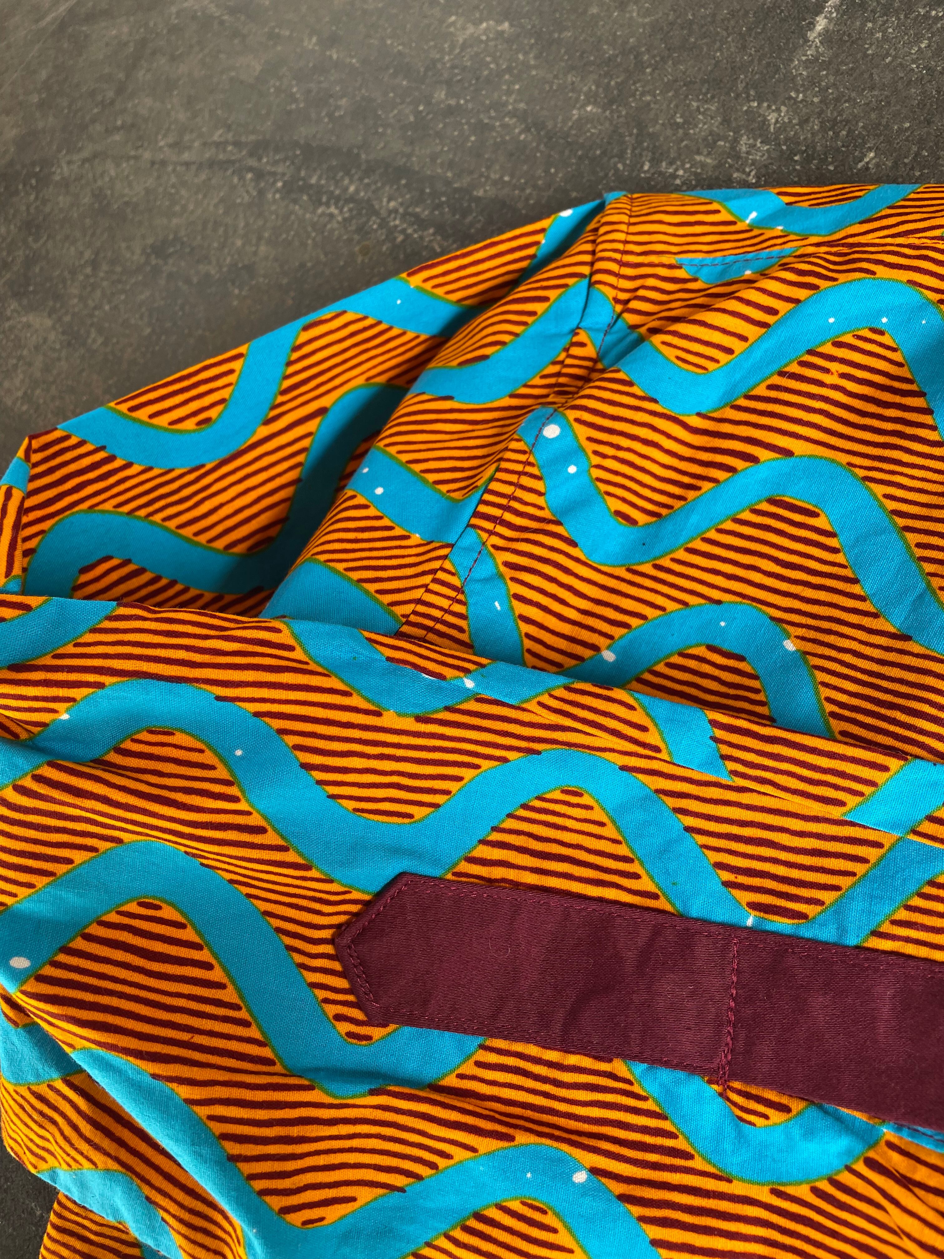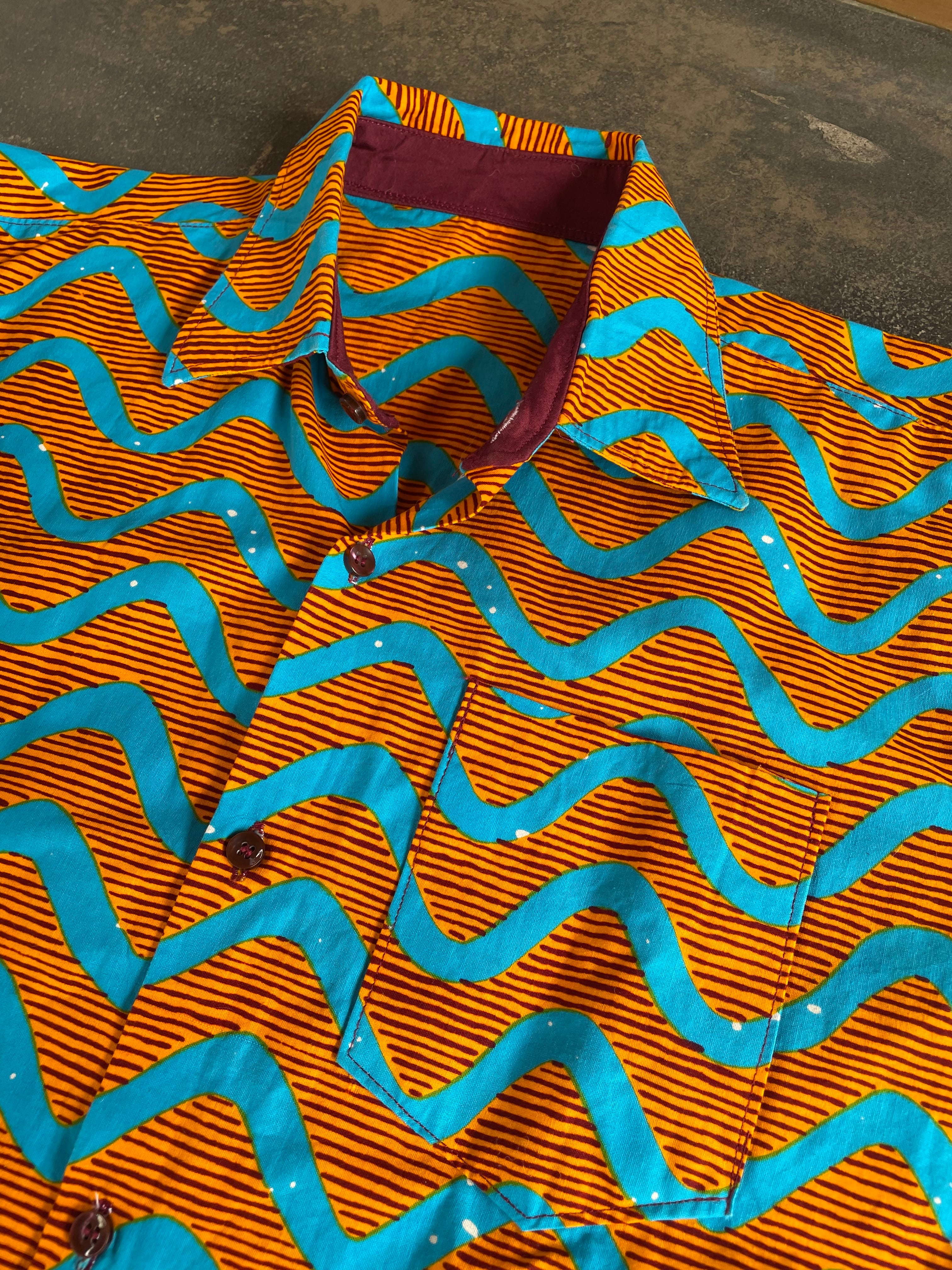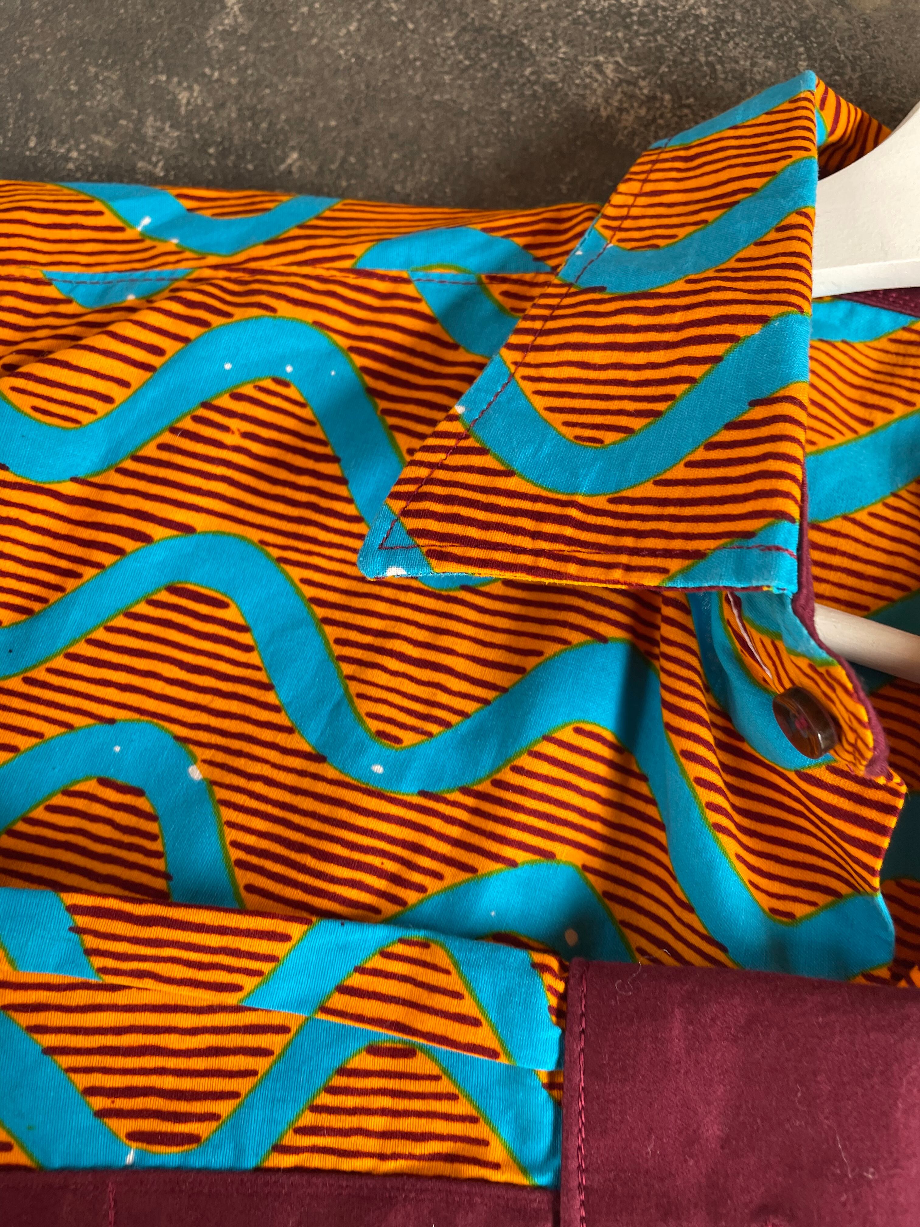 カラーリング・テキスタイルも とても素敵なアフリカン バティックで、シンプルなシャツに仕立てたオーダーメイドの men's シャツ、なかなか出会わない一点。