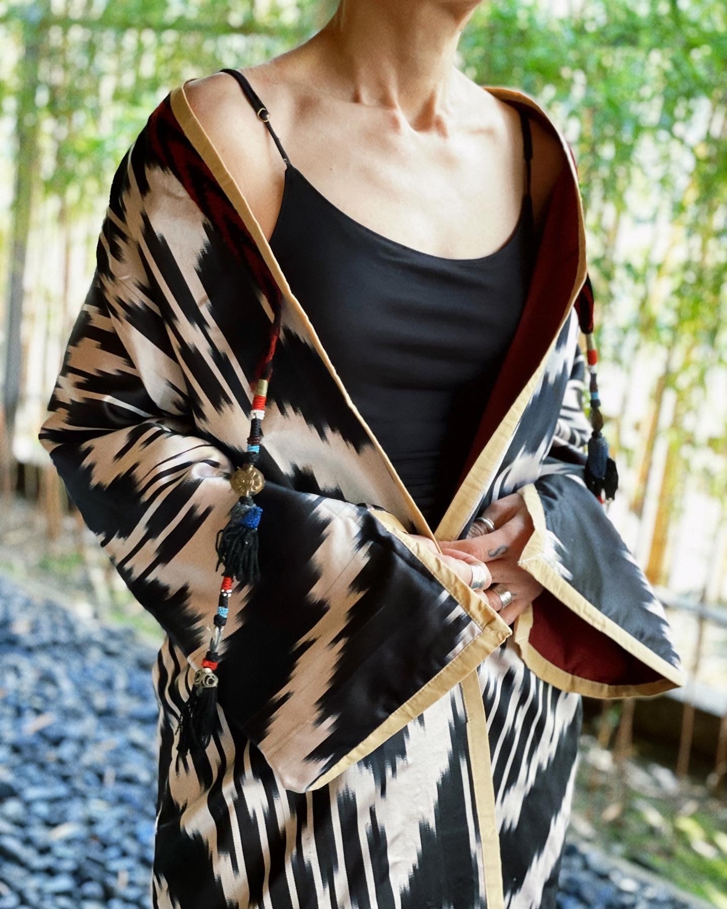 オール シルク で織り上げられたチャパンは、美しい光沢と上品さがあり、大人がさらっと羽織って雰囲気ある一点です。