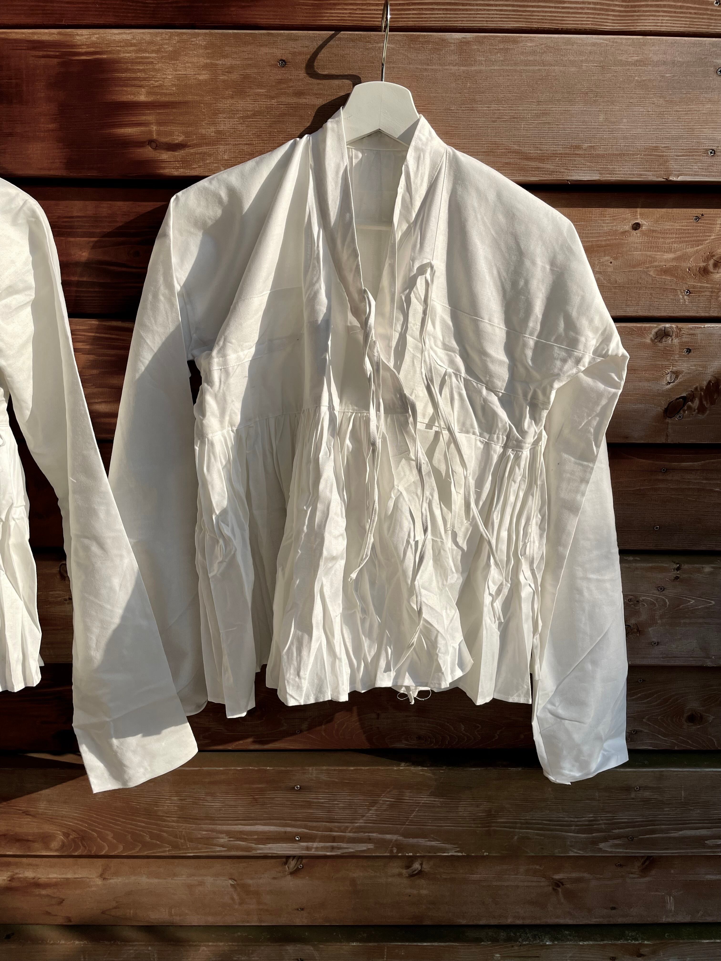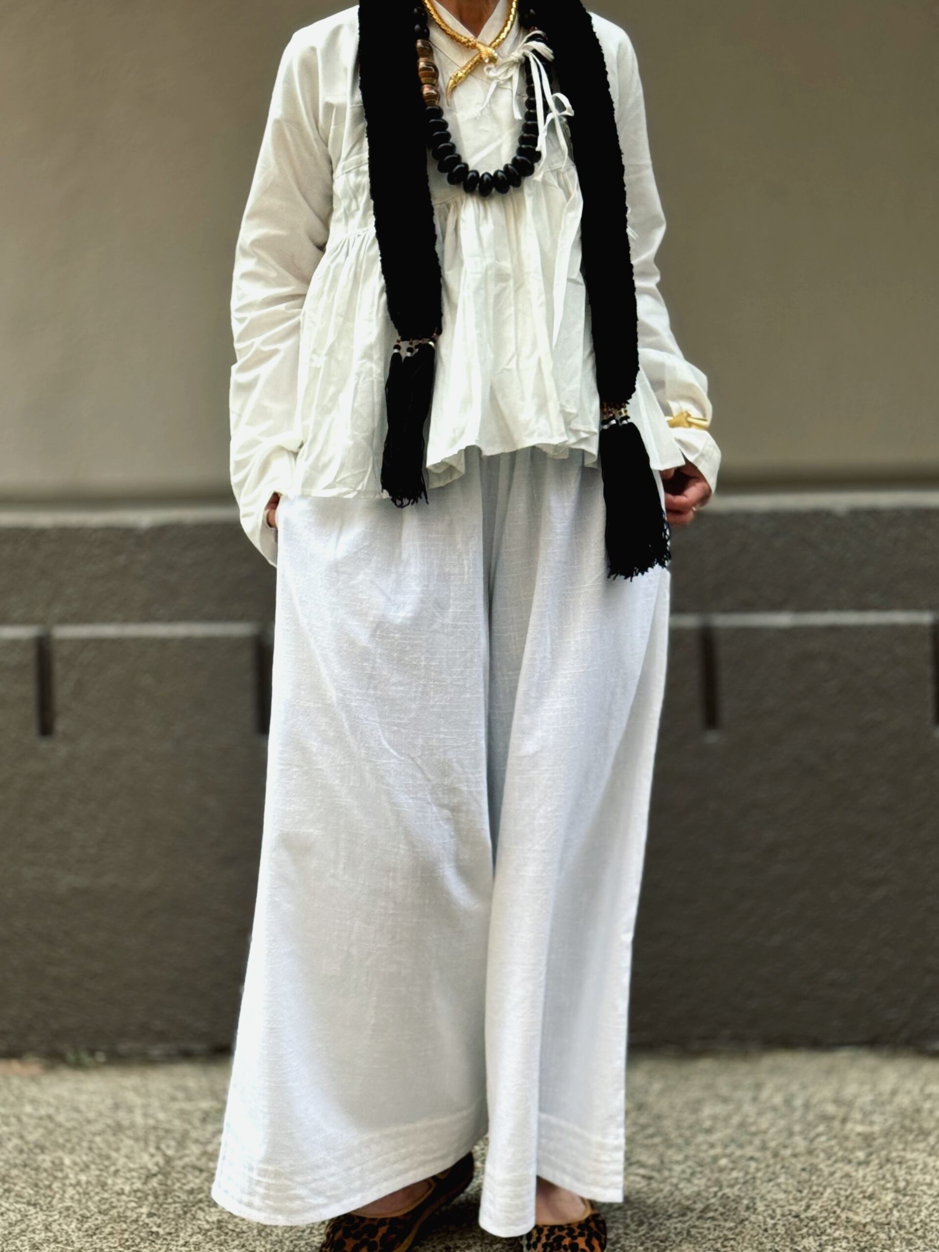 短い丈のシャツに入った細かいプリーツは 身体が動くと空気が入れ替わって涼しく、