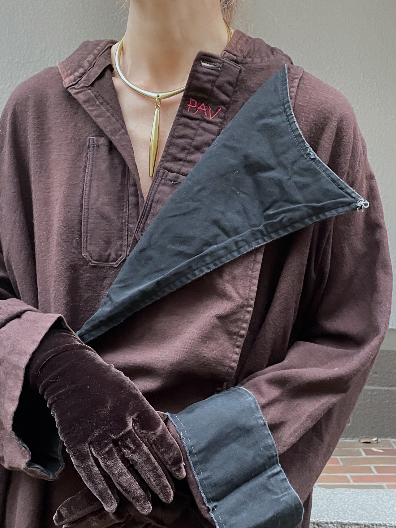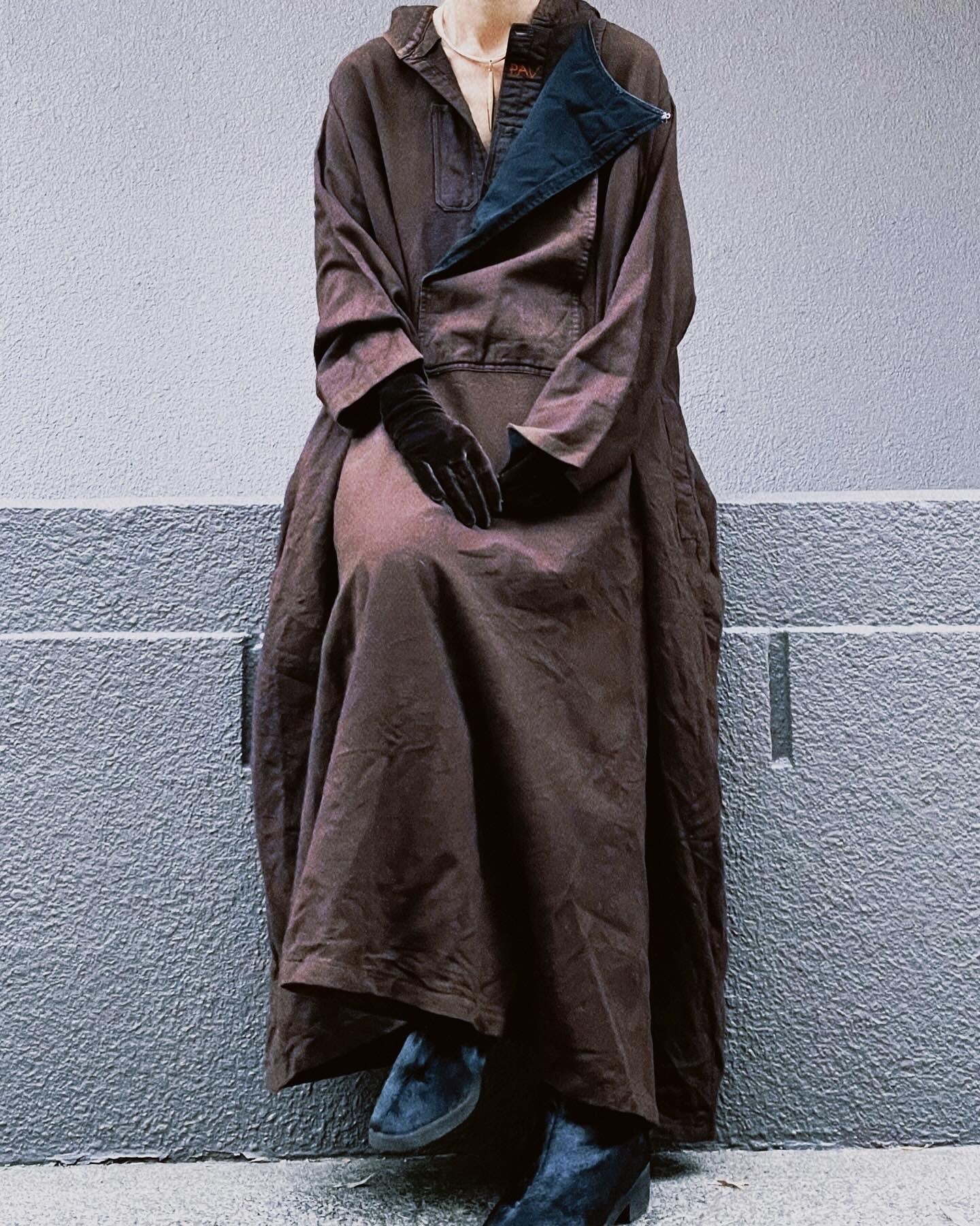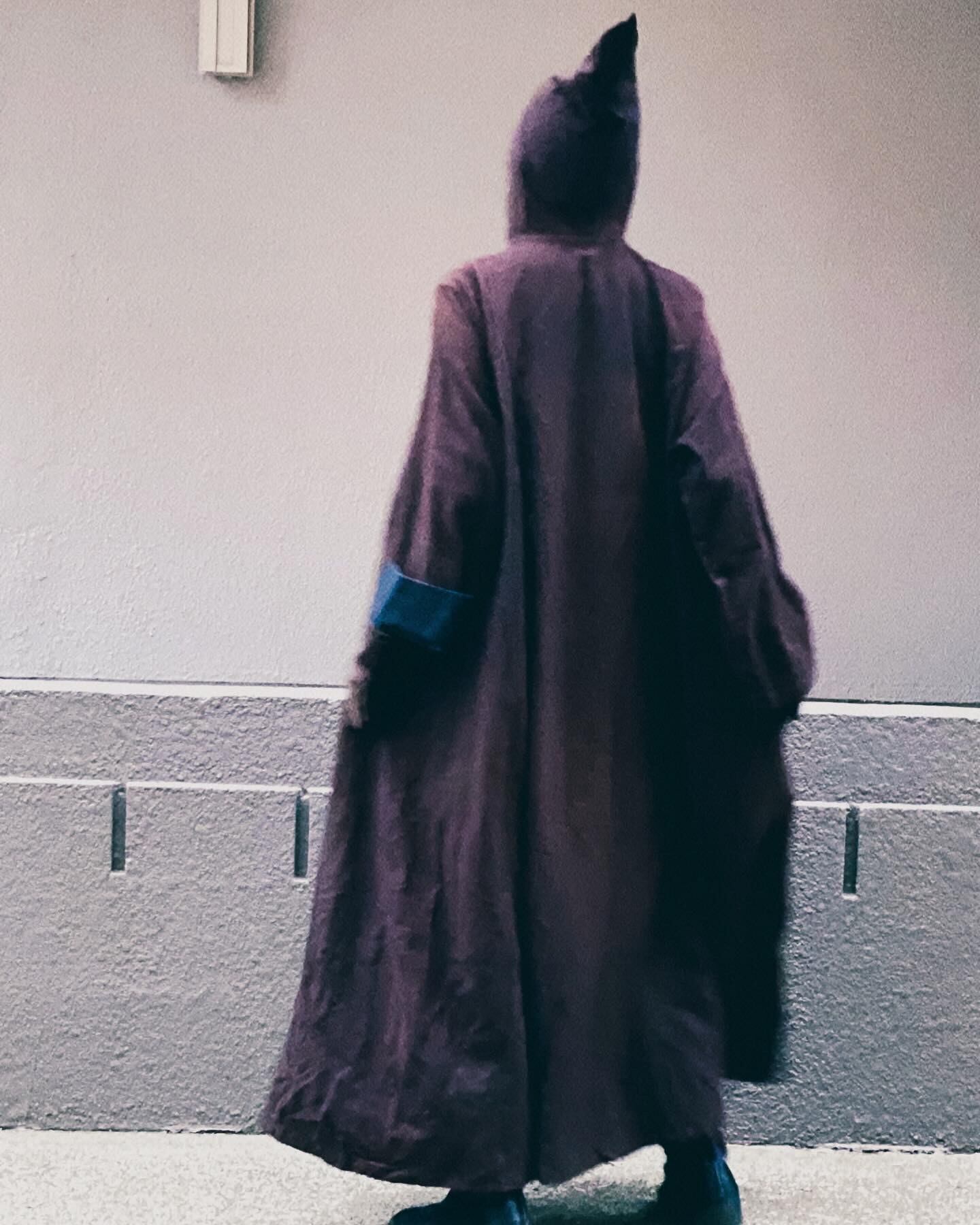 三角のとんがりフード、胸元のディテールなど、他では見ることがない衣服として素晴らしい一着。