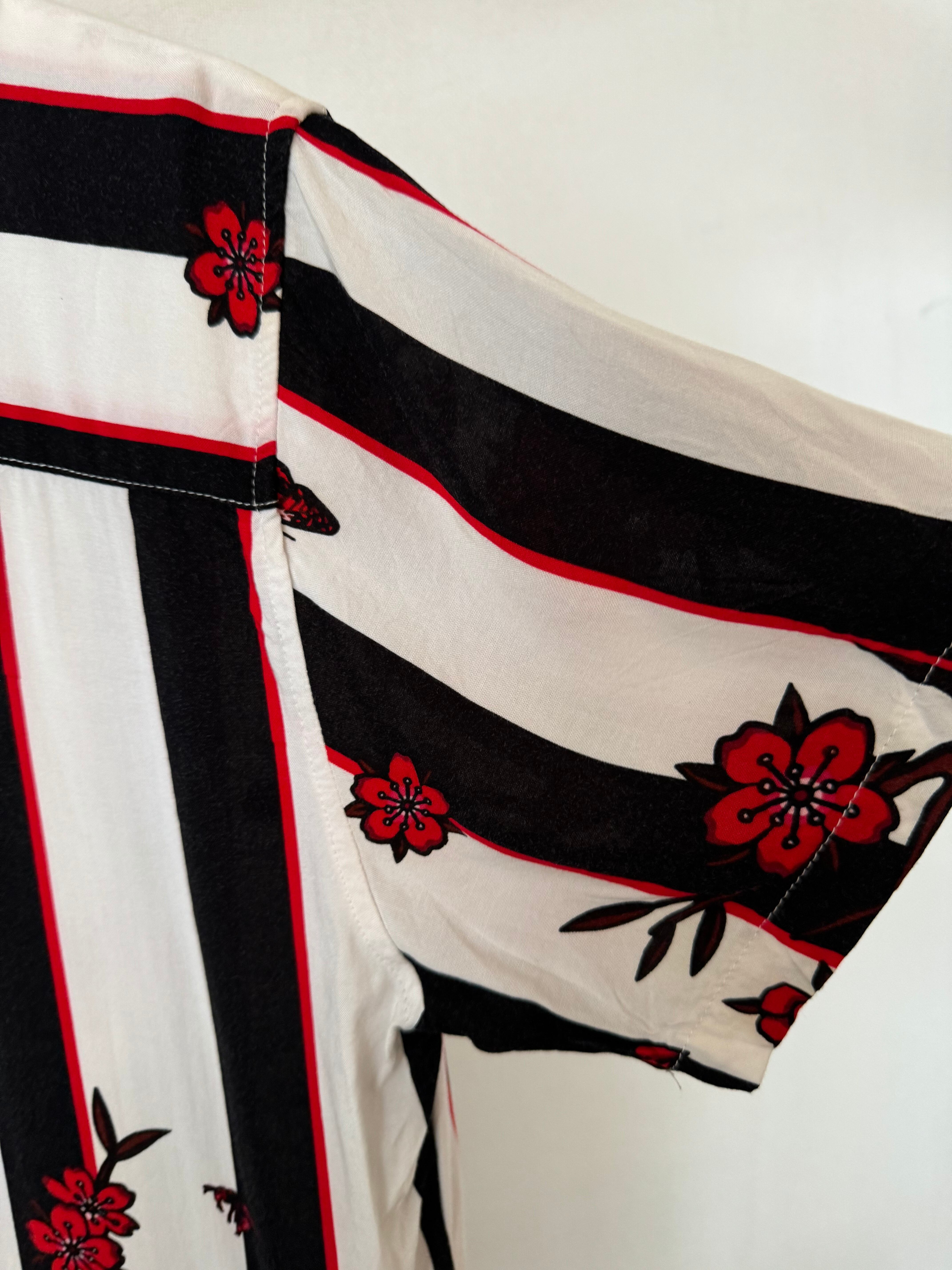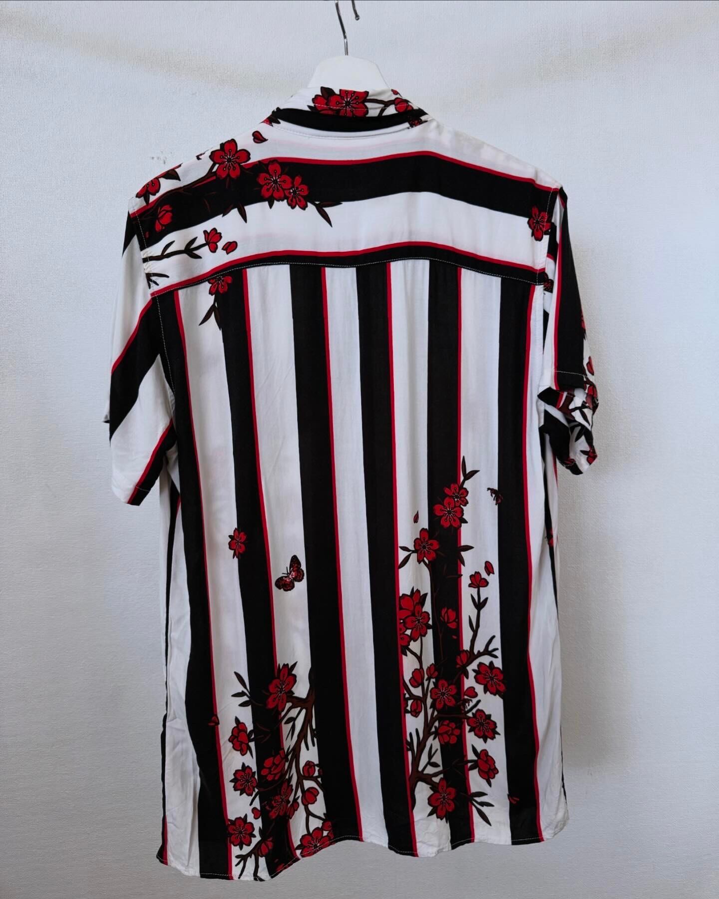 肌触りが良く、モノトーンにレッドのパキッとしたカラーリングで、個性的なプリント ブラウスです。