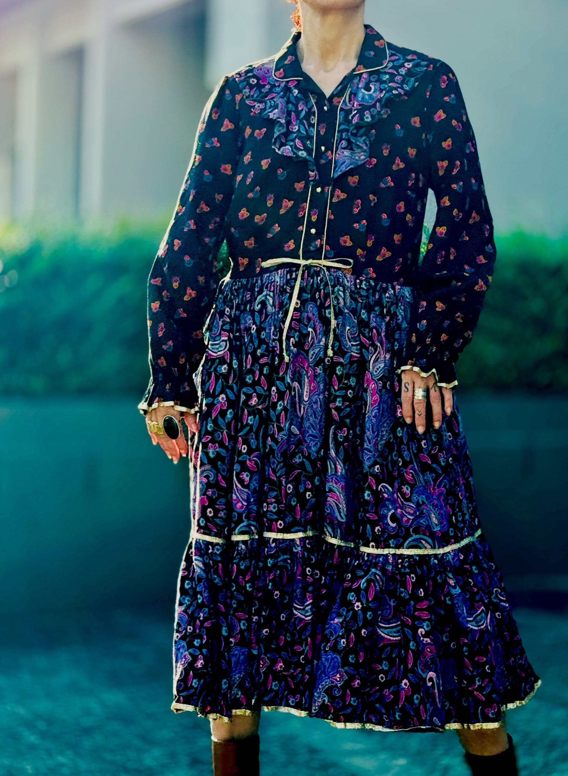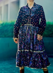 ヴィスコース 100%とは思えないほどズシっと、しっかりと密度が詰まった ヴィンテージ ファブリックで仕立てられたデザイン性の高いワンピースです。