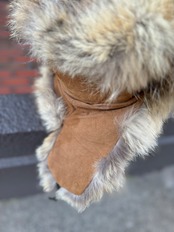 耳当て部分を下ろすと、リアル スエードのカラーも質感も良く、上げても下ろしても、どこをとっても素敵で、なかなか出会わない一点です。
