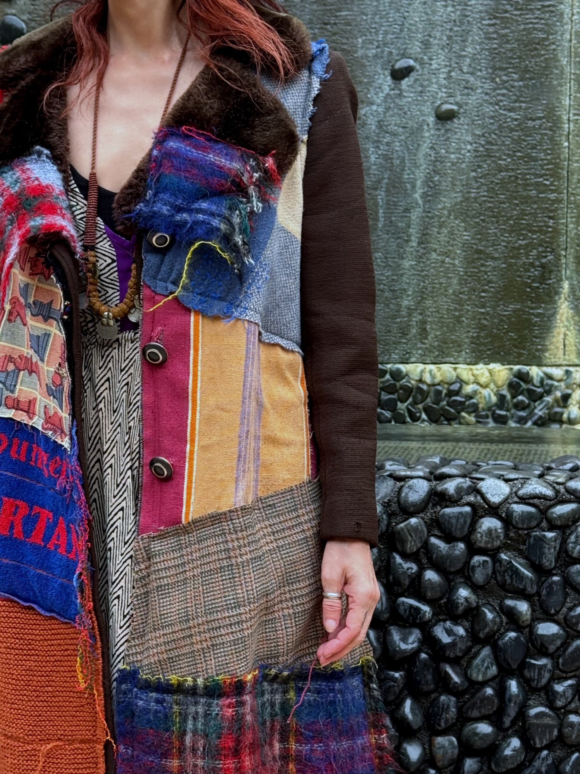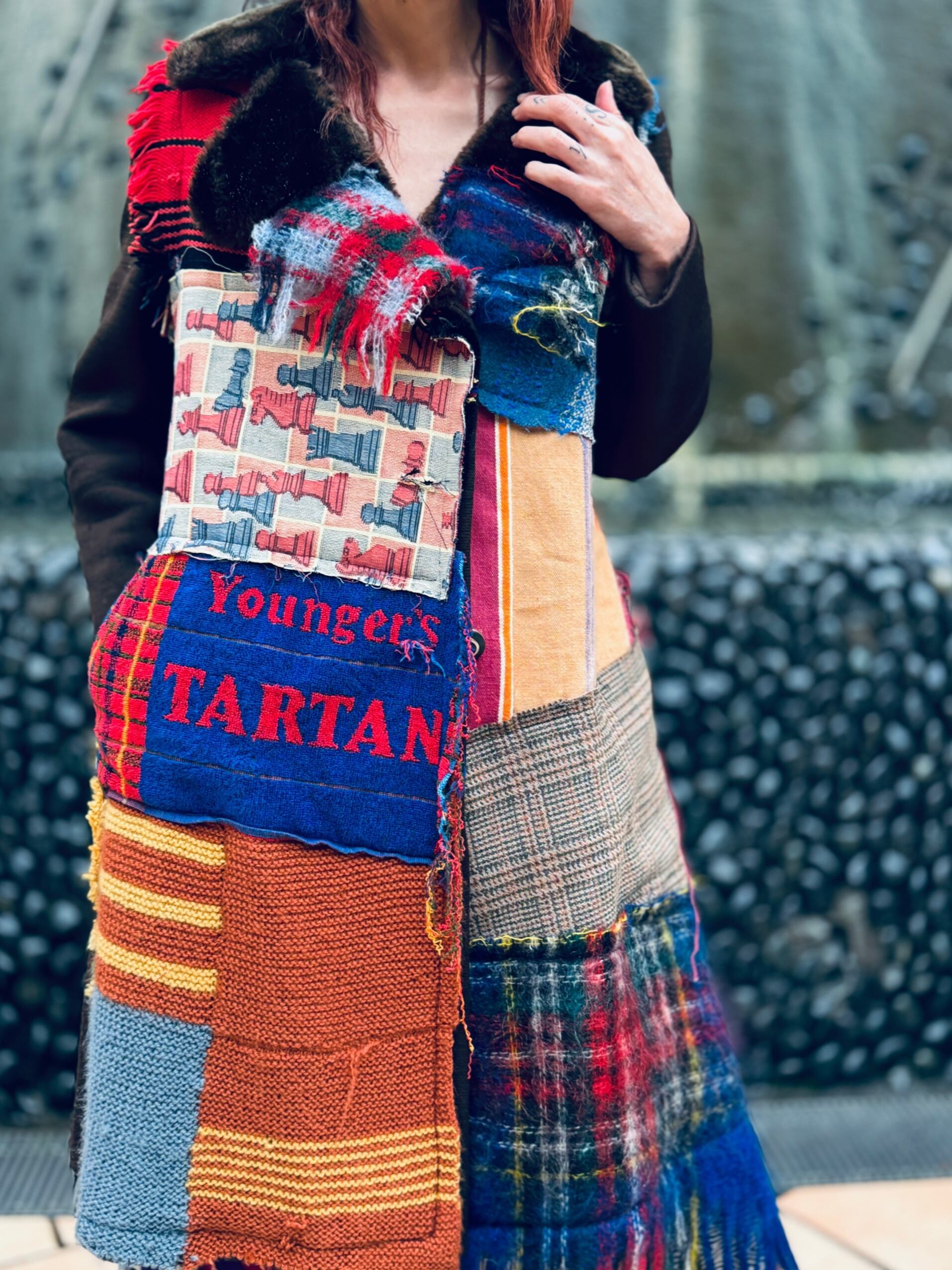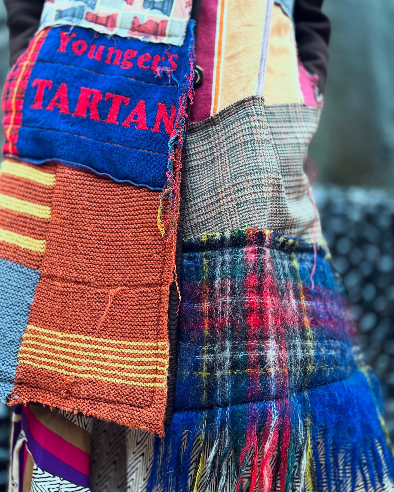 ブランケットやニット・ツイード・パイルなど様々なファブリックを大胆に接ぎ合わせたフロント