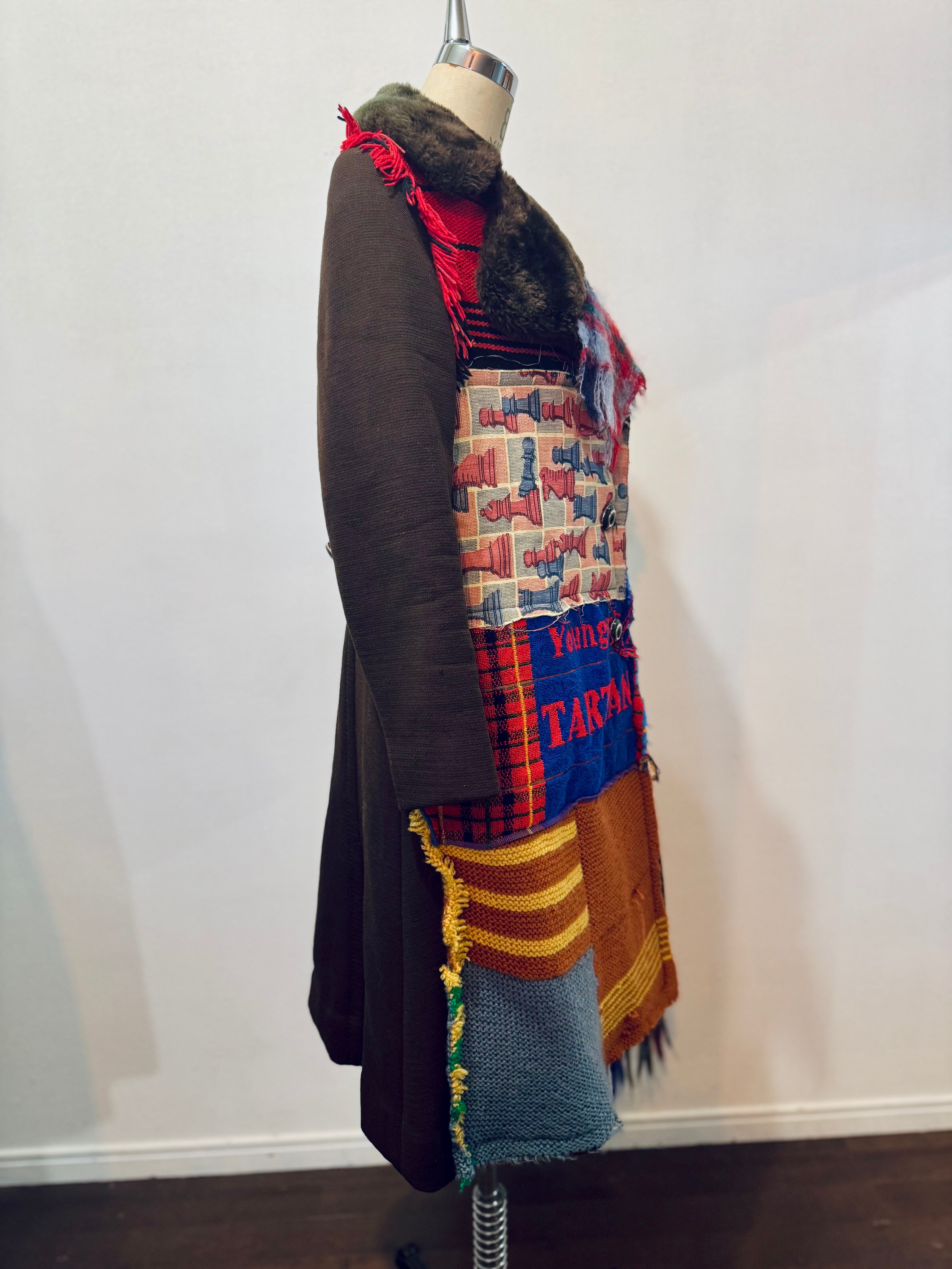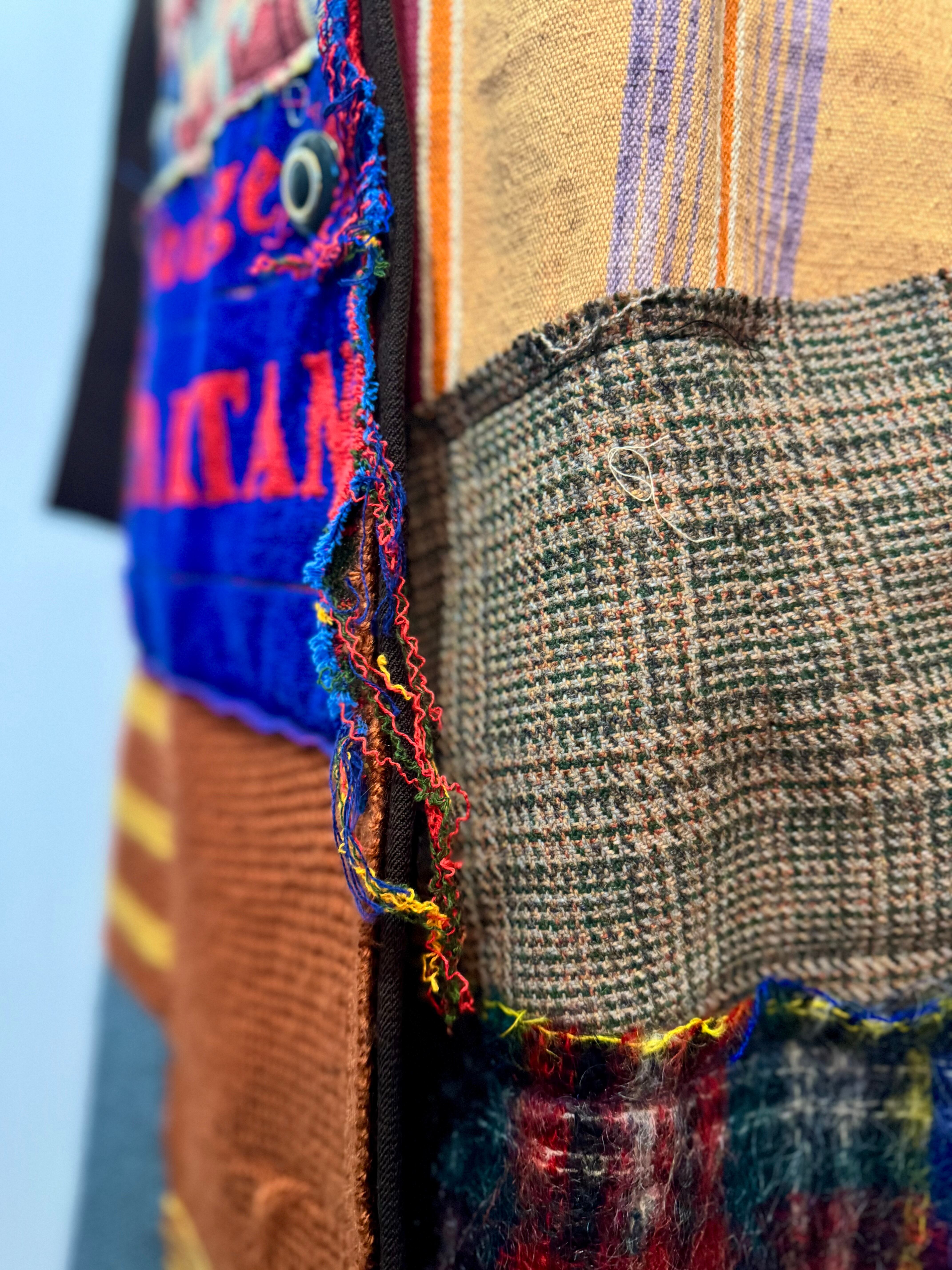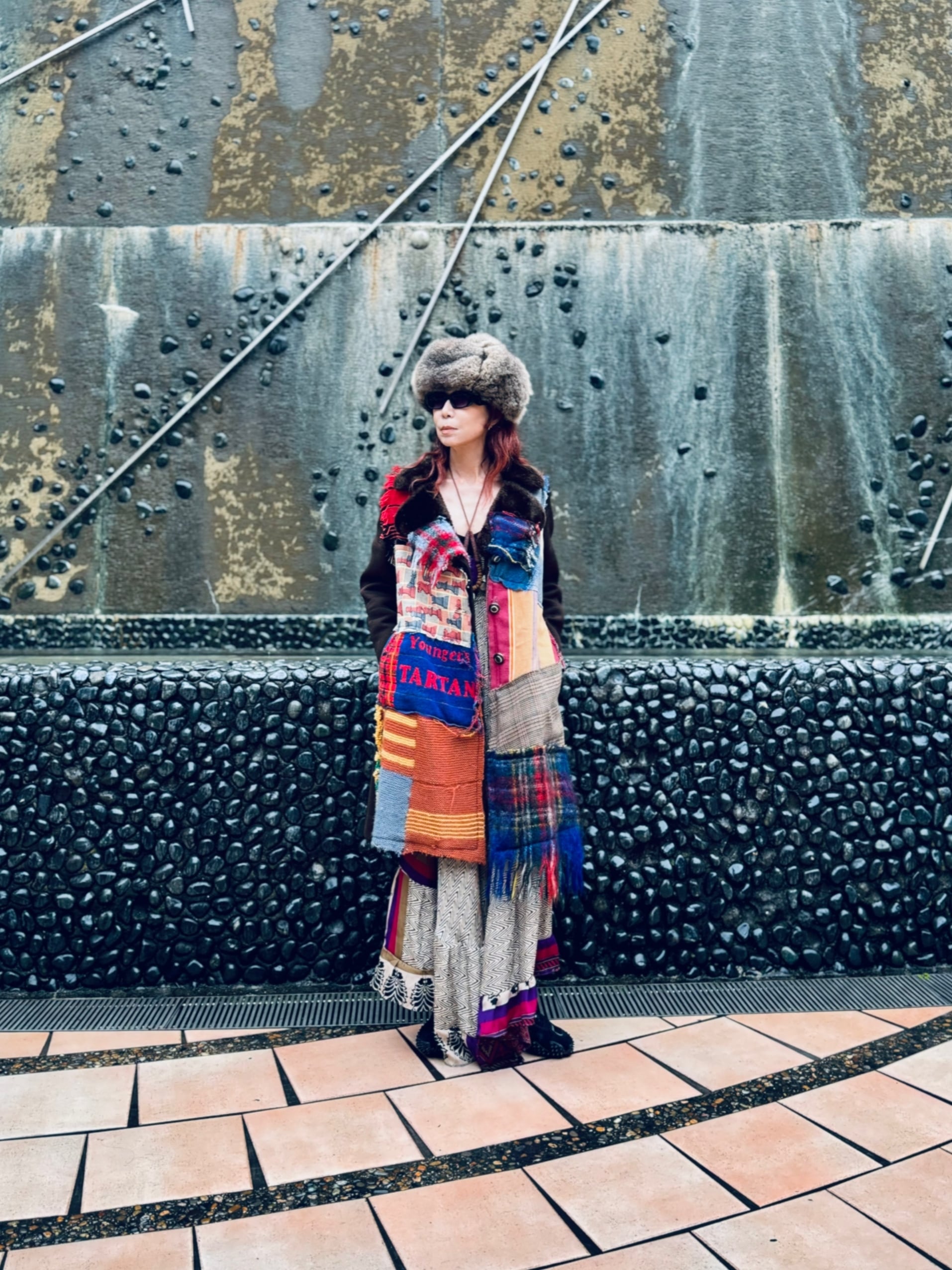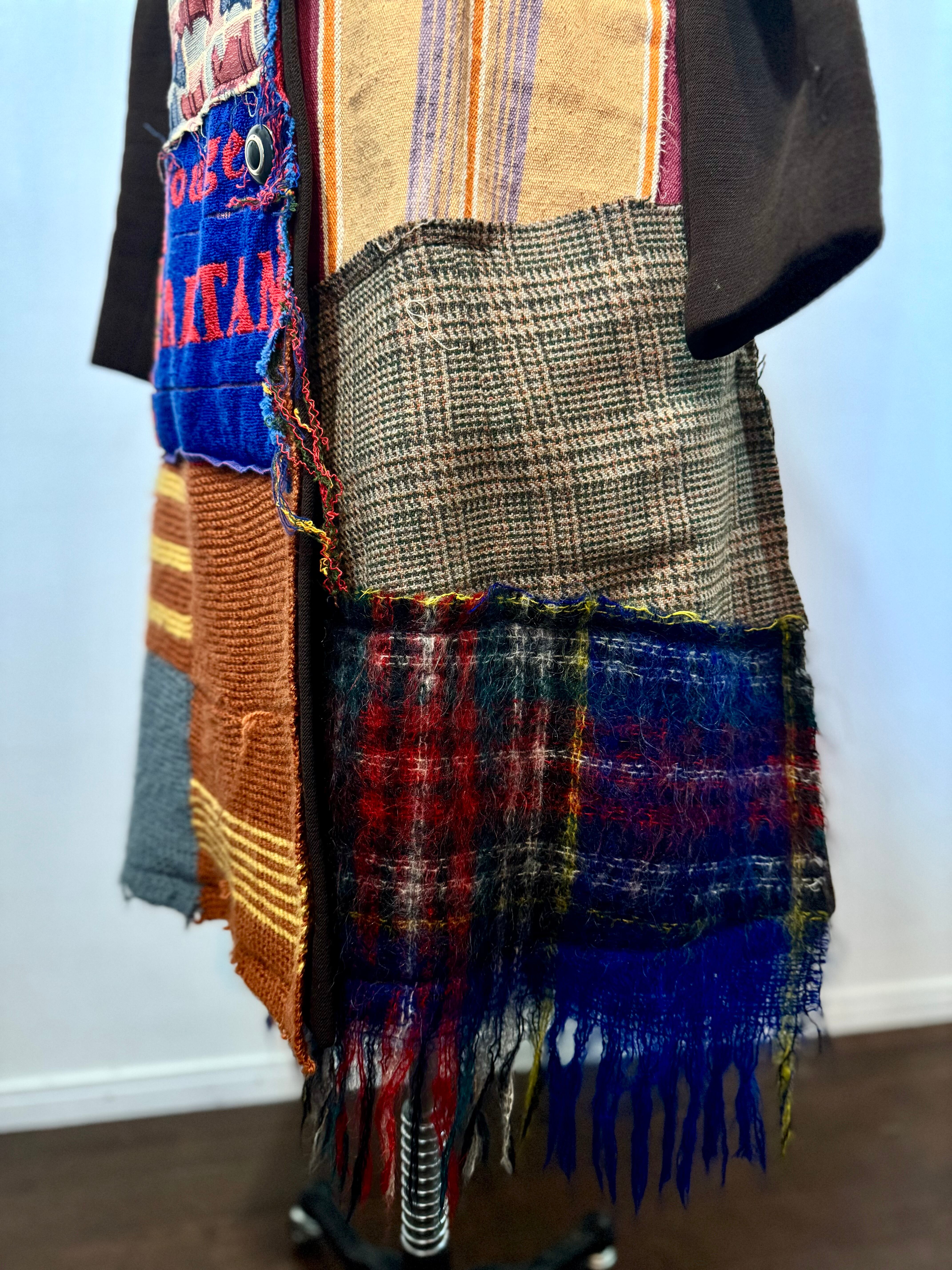 ブランケットやニット・ツイード・パイルなど様々なファブリックを大胆に接ぎ合わせたフロント